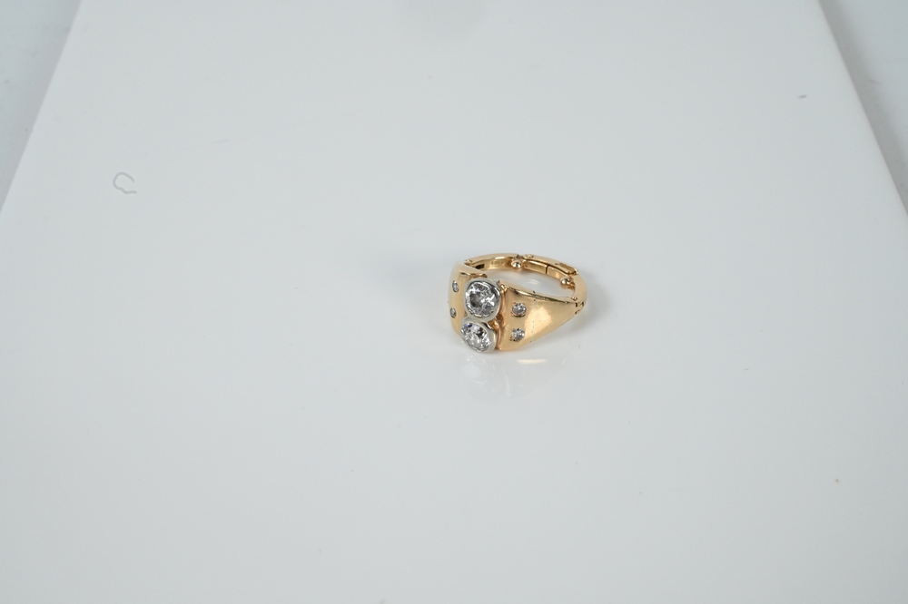 14 Karat Gold Diamond Ring, having two approximately 1/2 carat diamonds in the center with two small diamonds on each side, adjustable from size four to size seven, total weight 7.9 grams.