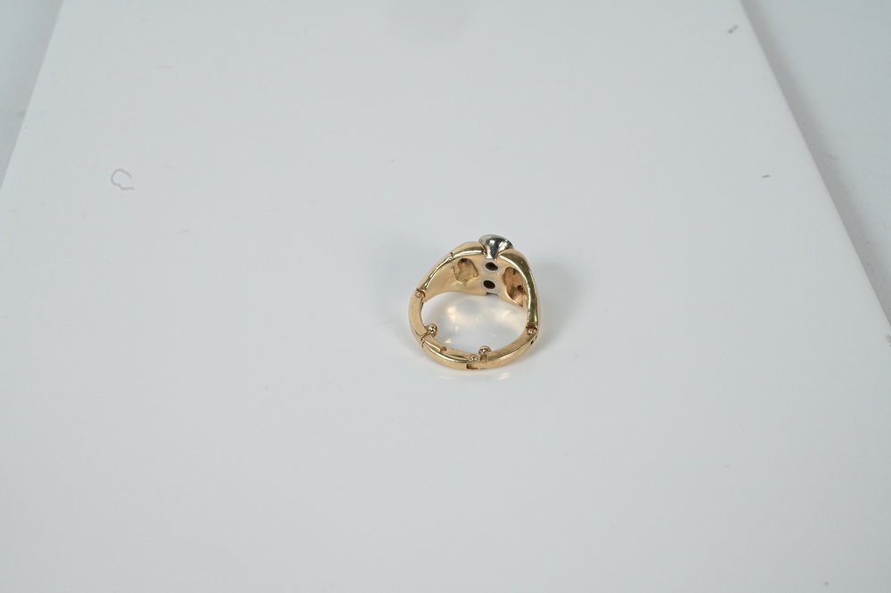 Lot 280: 14 Karat Gold Diamond Ring, having two approximately 1/2 carat diamonds in the center with two small diamonds on each side, adjustab…