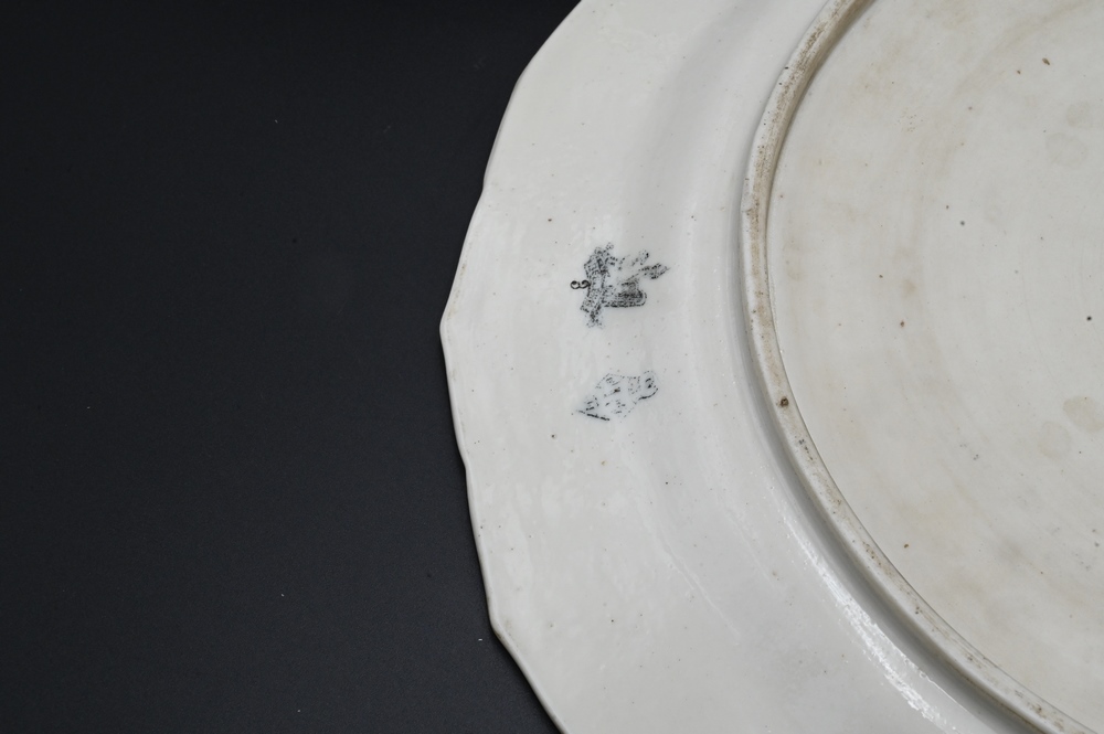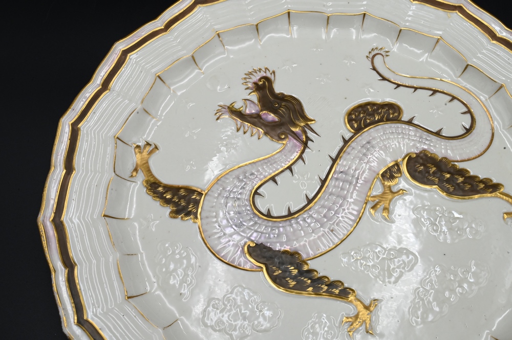 Lot 280: Belleek Dragon Serving Plate, painted pink, brown, and gold dragon, black mark on bottom, diameter 15 inches. Provenance: Collections of Norma Reilly, New Jersey.