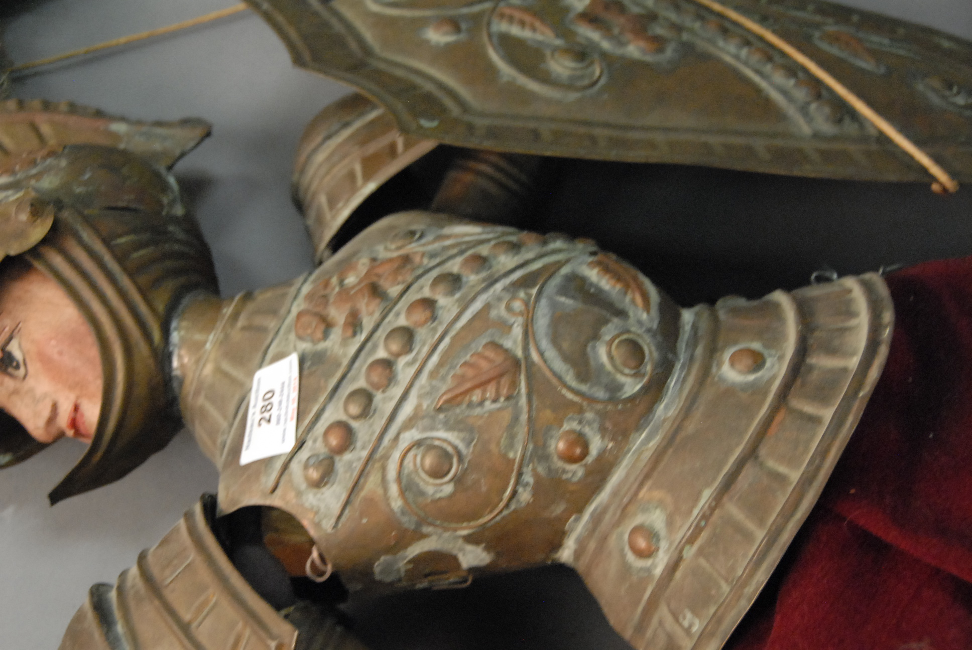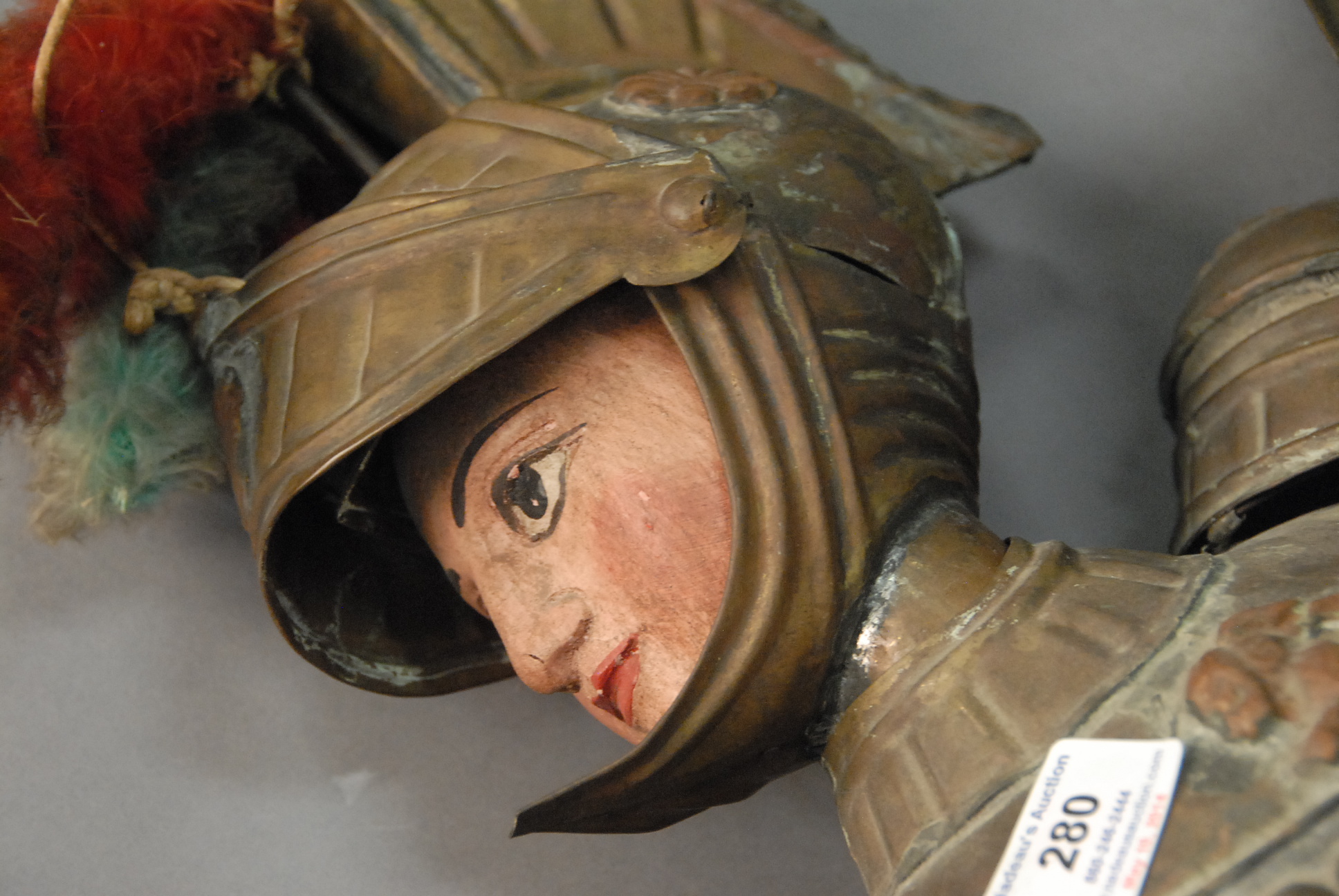Lot 280: Carved wood Joan of Arc wearing full copper armor and red skirt, ht. 44in.