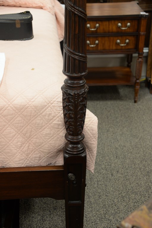 Lot 280: Ethan Allen mahogany four post king size canopy bed, complete with mattress and box spring by Ethan Allen and comforter, pillows, an…