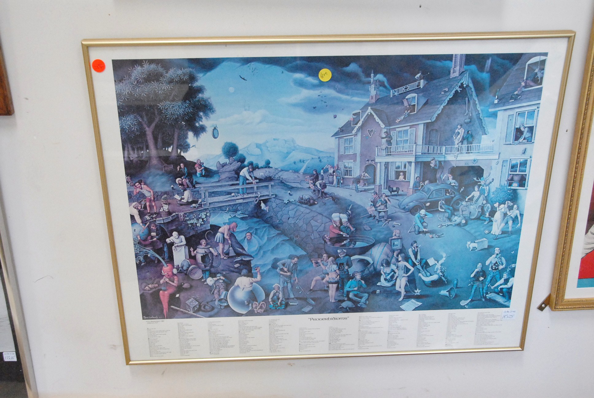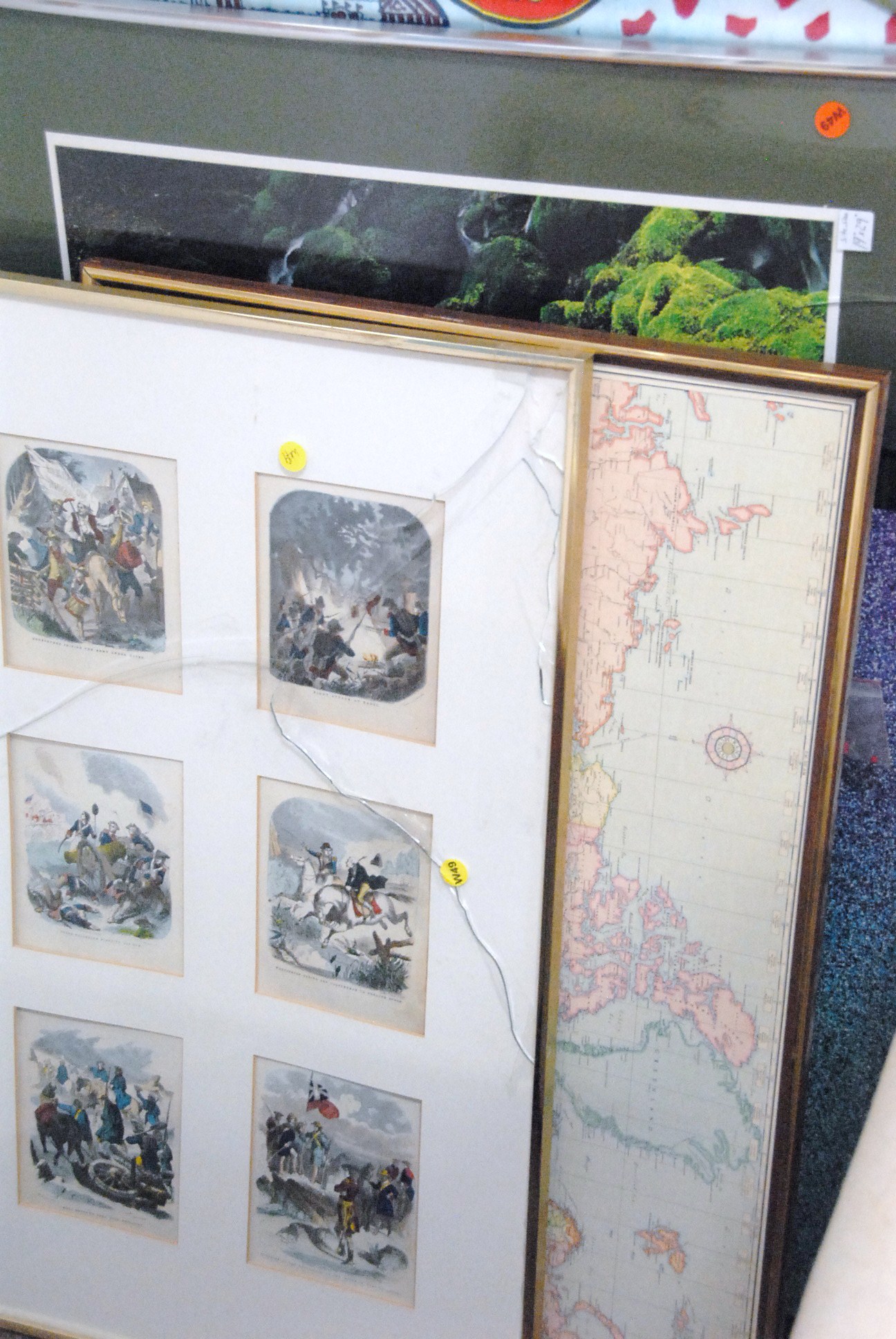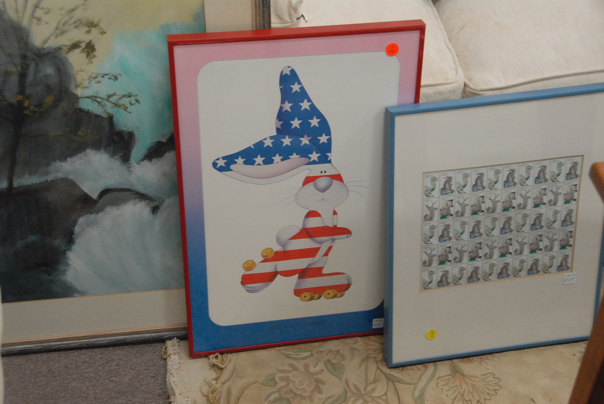 Fifteen piece lot of prints and paintings to include a Stephen Massal watercolor, 25 cent stamps, set of six early prints, an oil painting of a landscape with three women and a Rob Gilman watercolor.