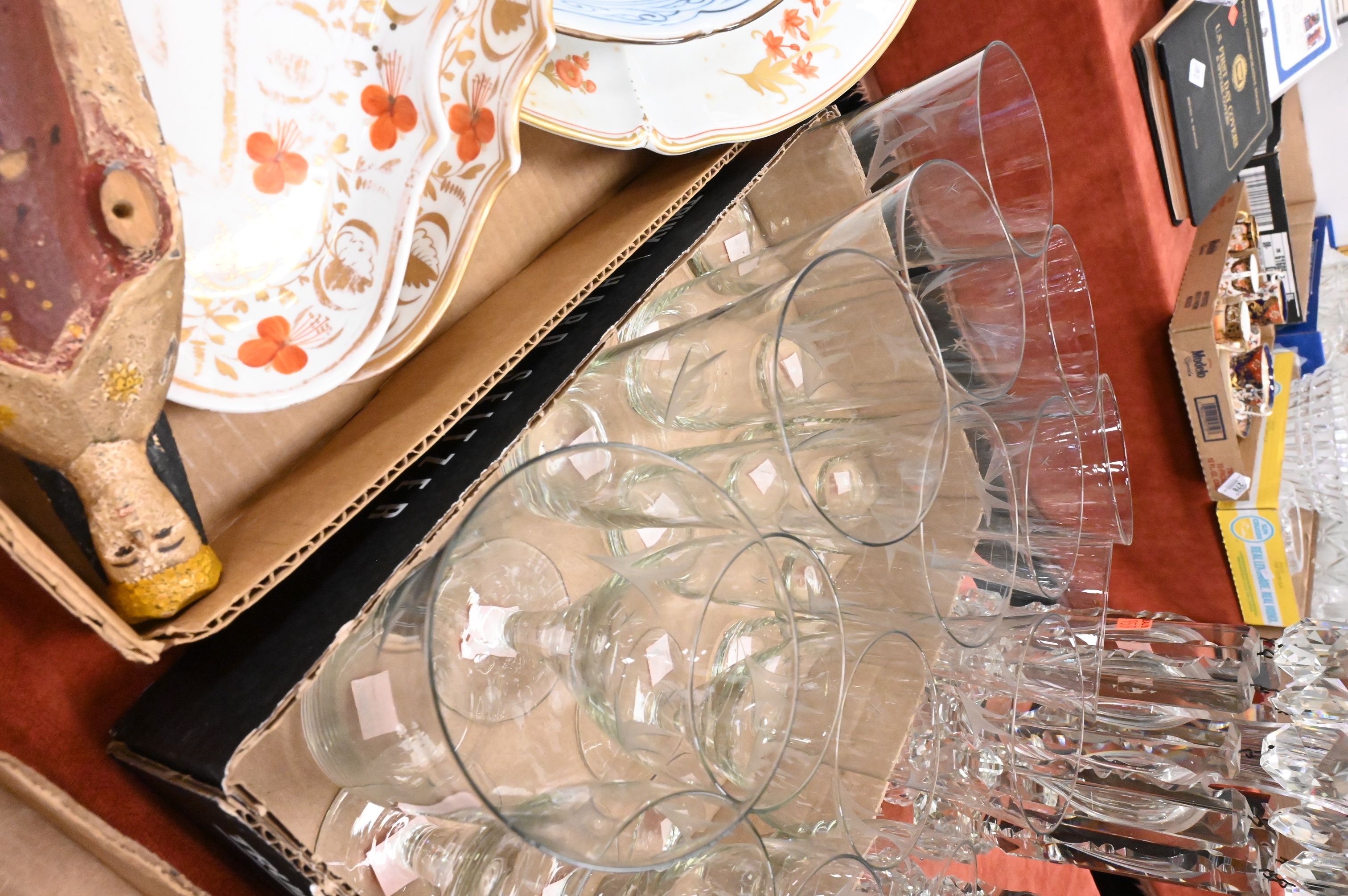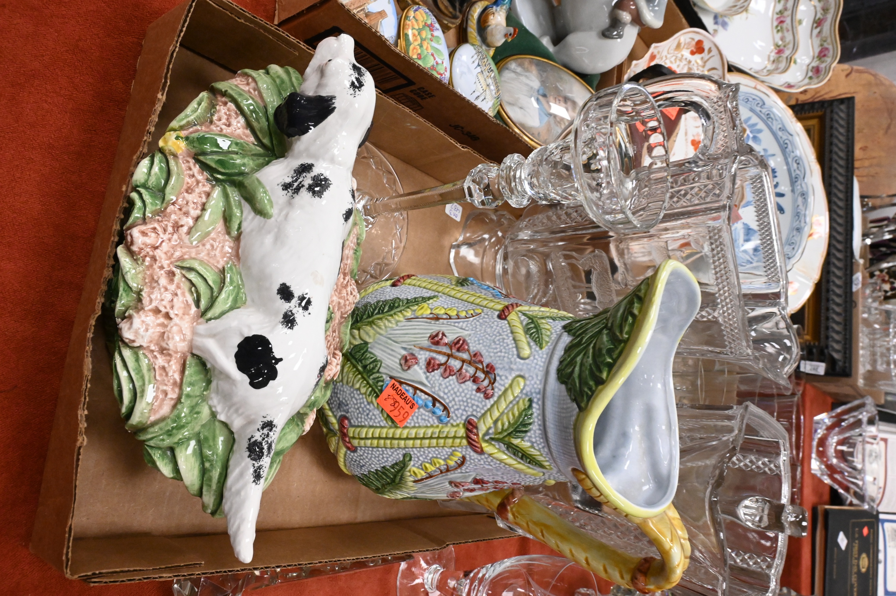 Lladro “Eskimo Riders” figures riding a polar bear, Majolica covered dish with English Setter dog cover, Majolica pitcher, Limoges dishes, Halcyon Days and Asprey porcelain enamel trinket boxes, hand painted porcelain miniature portrait of a young boy, two polychrome and carved saint figures etc…