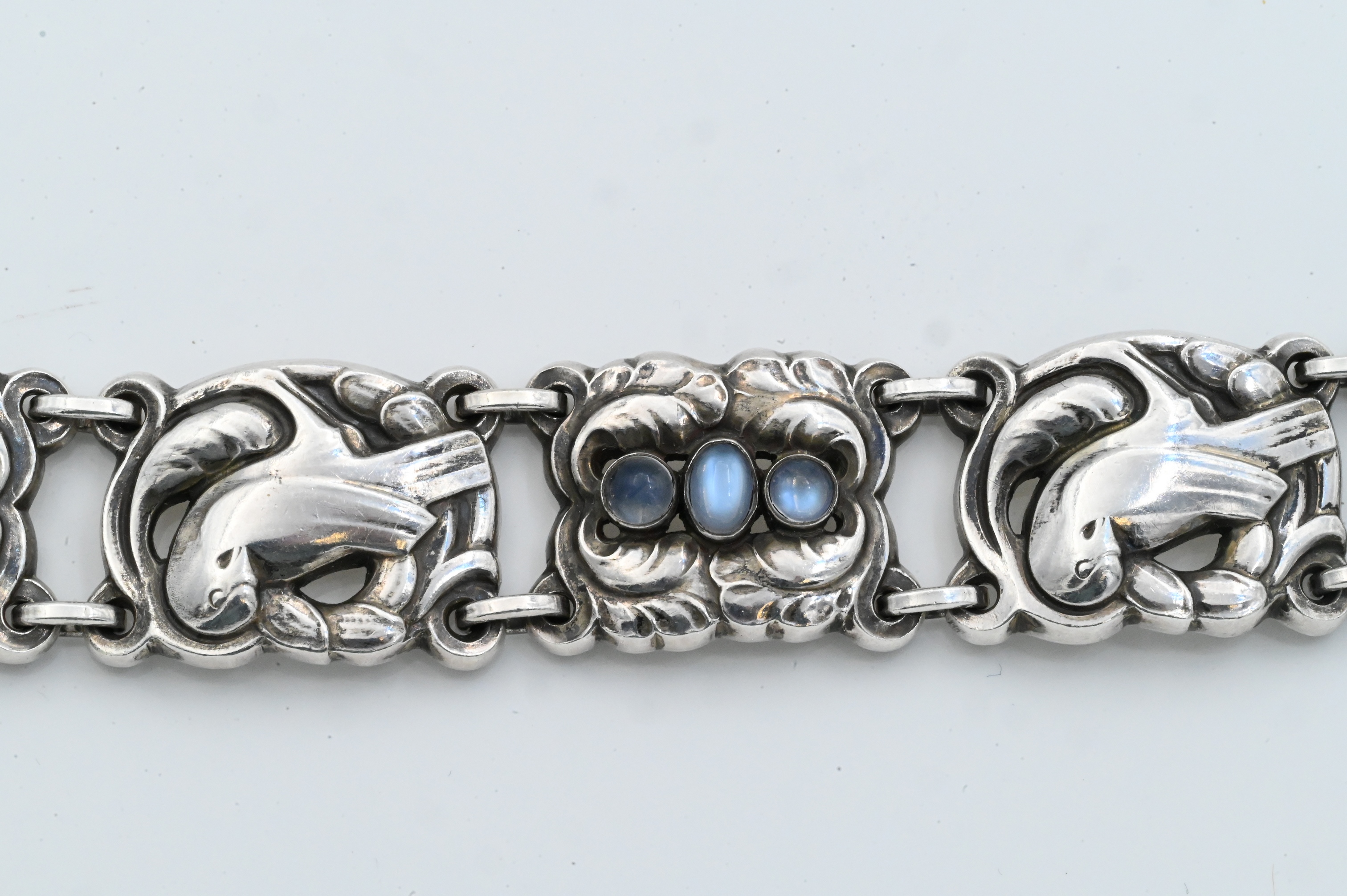 Designed as a series of alternating floral and bird motif links set with cabochon moonstones, marked Georg Jensen, 925 S Denmark, 14.