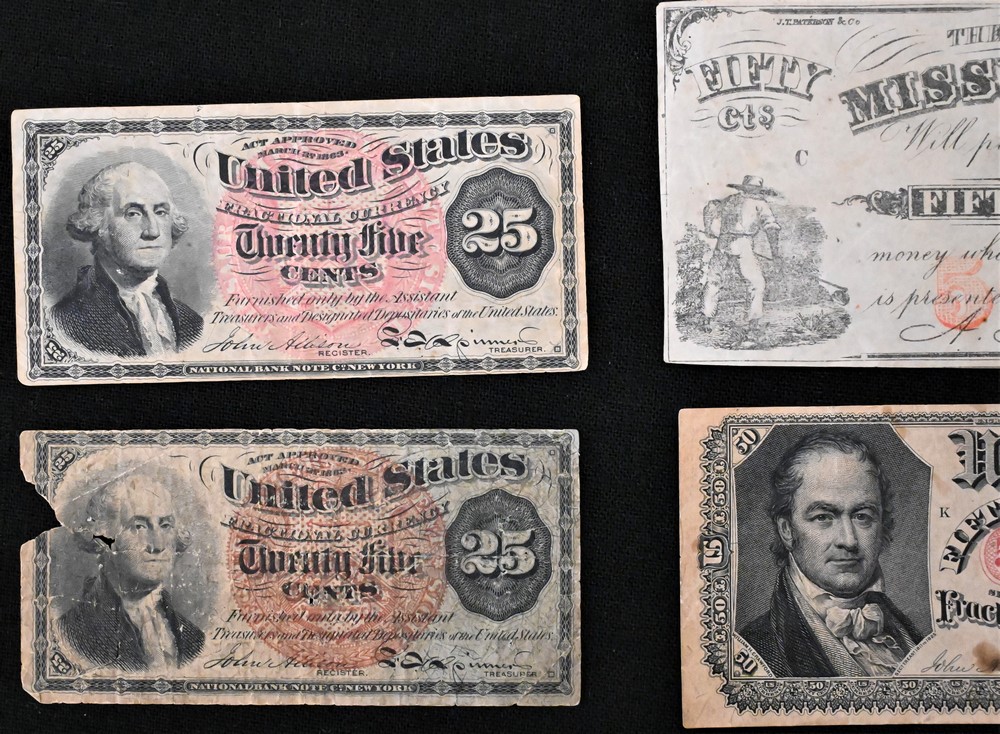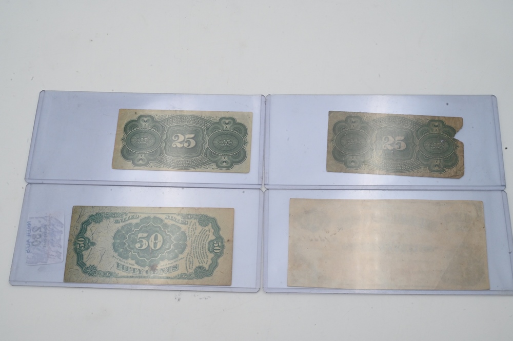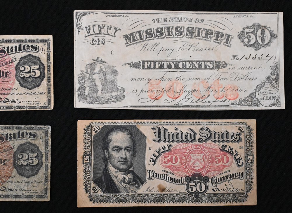 Group of Four Small Bank Notes, to include two 25 cent fractional currency 1863 bank notes; one 50 cent fractional currency 1875 bank note along with one 50 cent Mississippi 1864 note.