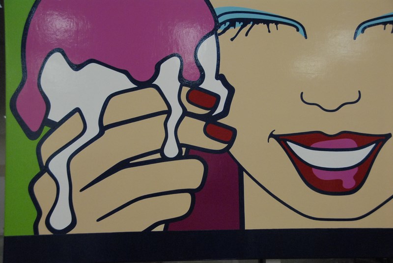 Hazel Dooney Australian I LIKE IT MESSY enamel on wood woman and ice cream cone signed lower right Dooney 2000 signed on reverse Hazel Dooney August 2000 39 1/2 x 59