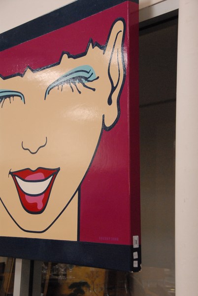 Lot 280: Hazel Dooney Australian I LIKE IT MESSY enamel on wood woman and ice cream cone signed lower right Dooney 2000 signed on reverse Hazel Dooney August 2000 39 1/