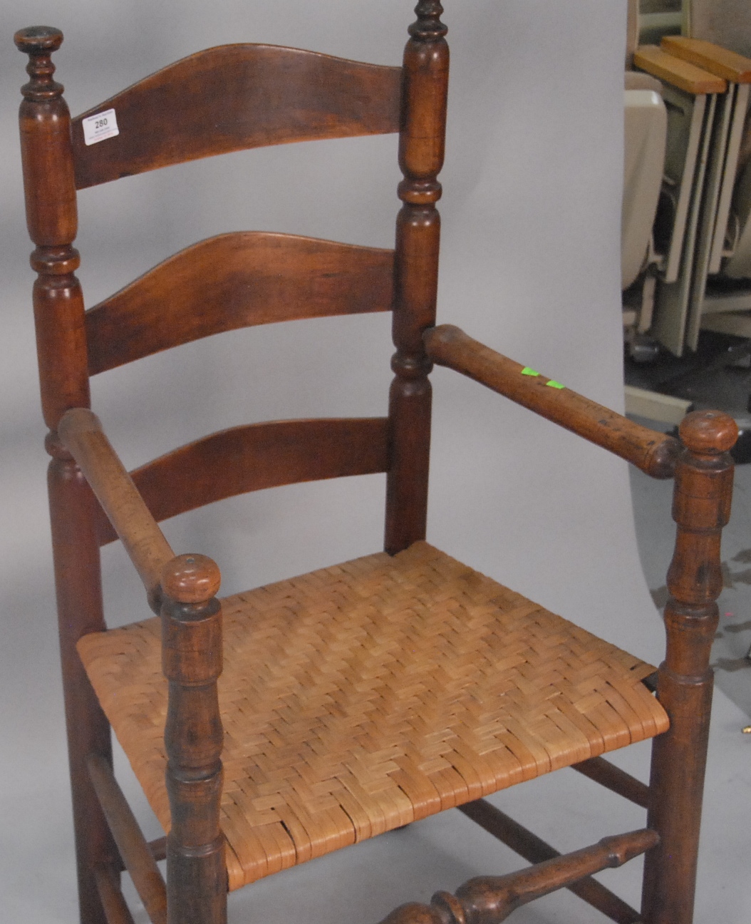 Ladderback great chair with turned arm supports and legs, legs ended out. seat ht. 15in.
