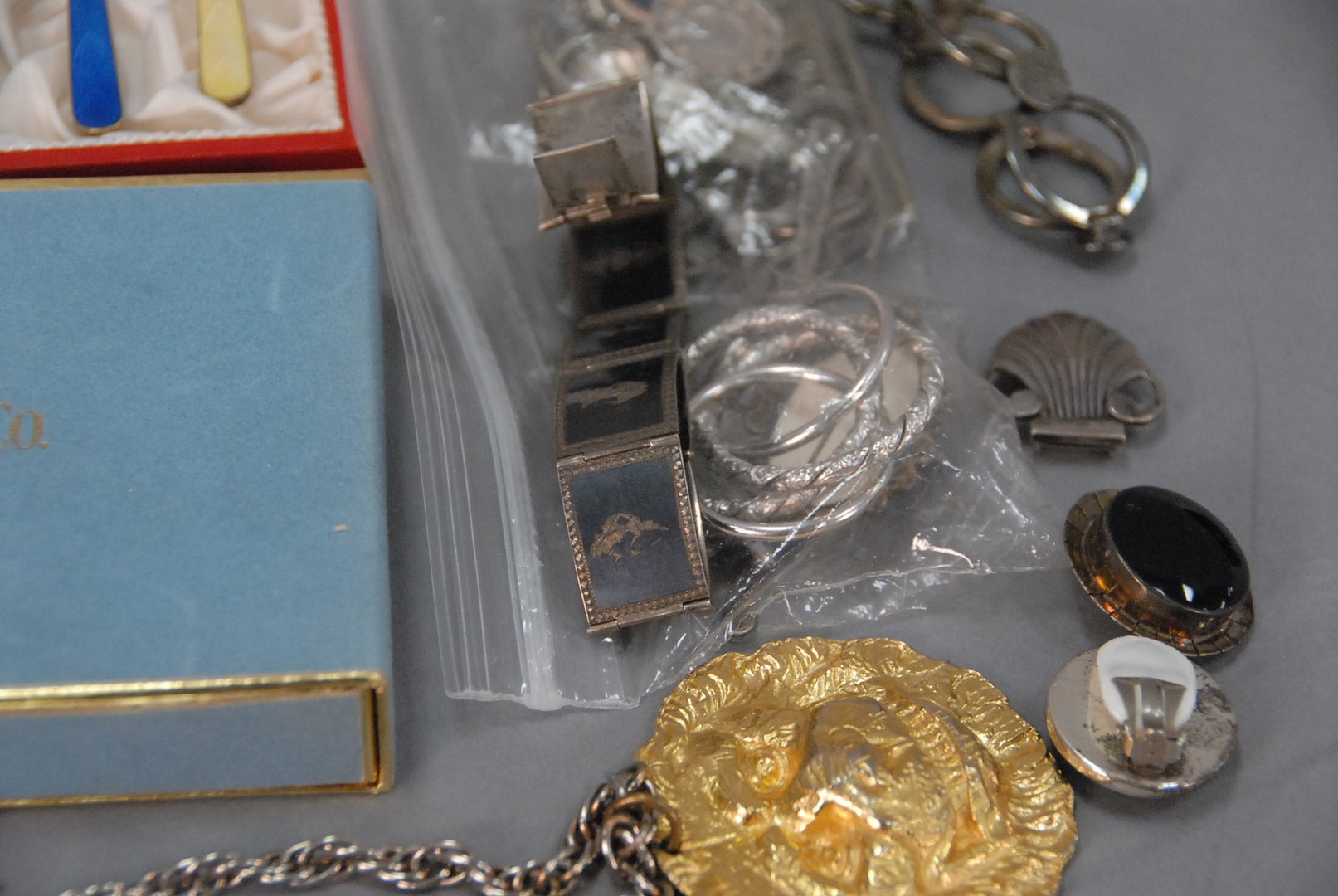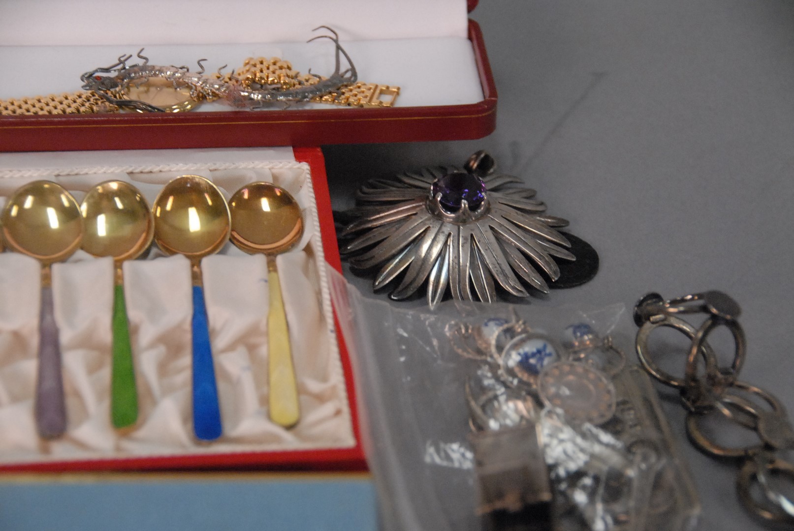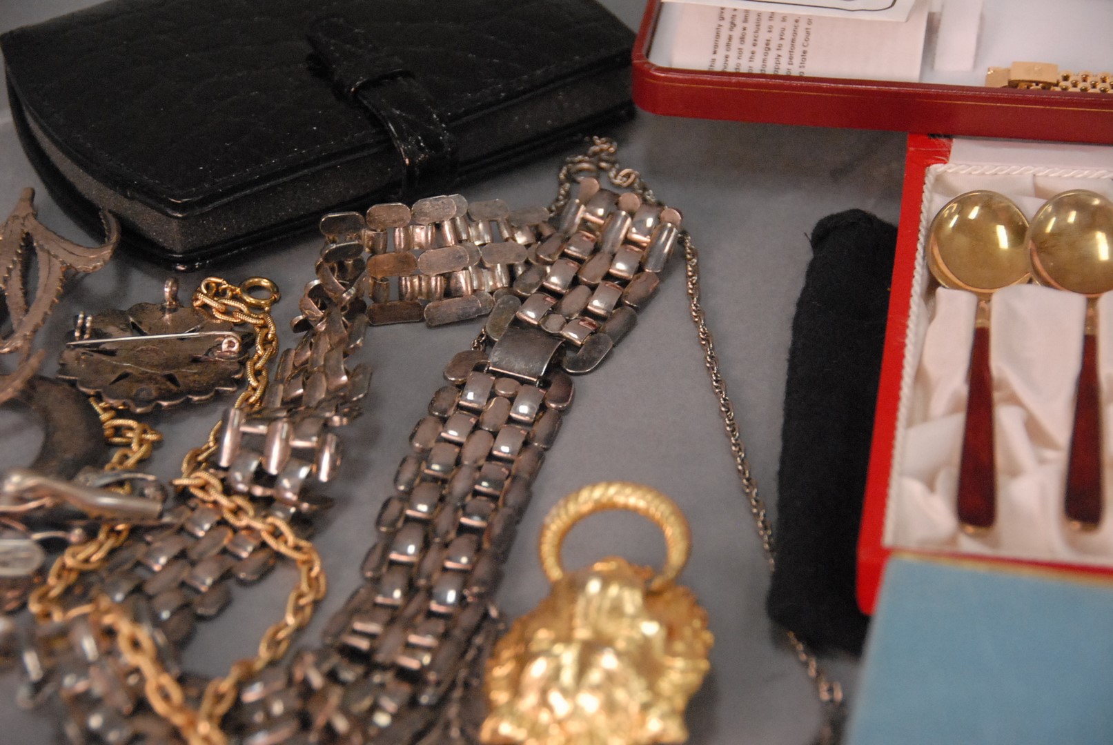 Lot of Bergdorf Goodman Alligator card case, Tiffany playing cards, sterling silver jewelry, Kenneth Lane & Dottie Smith costume jewelry and set of enameled silver spoons.