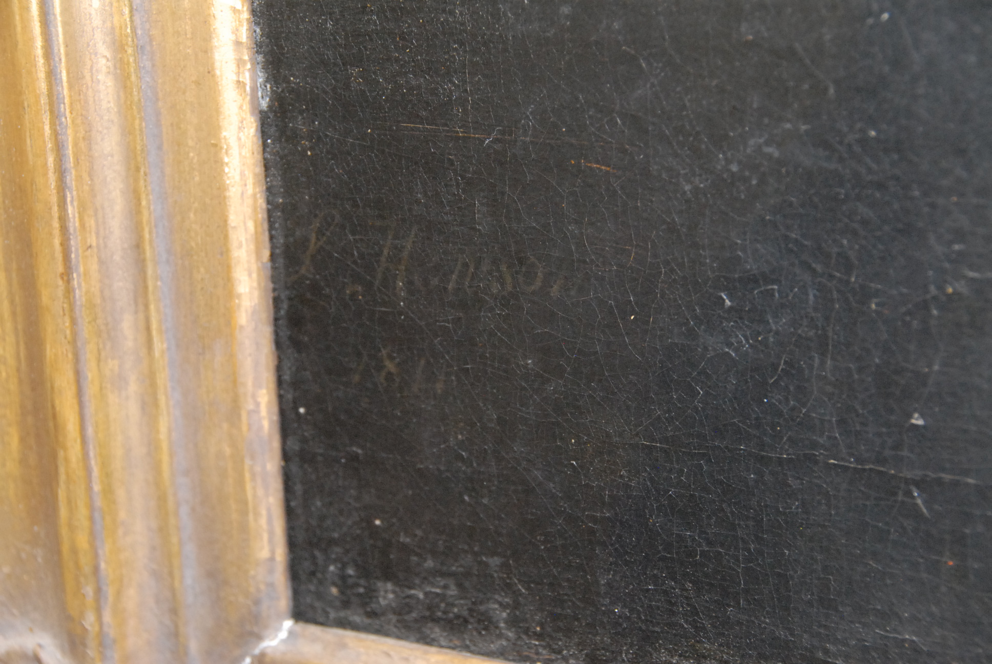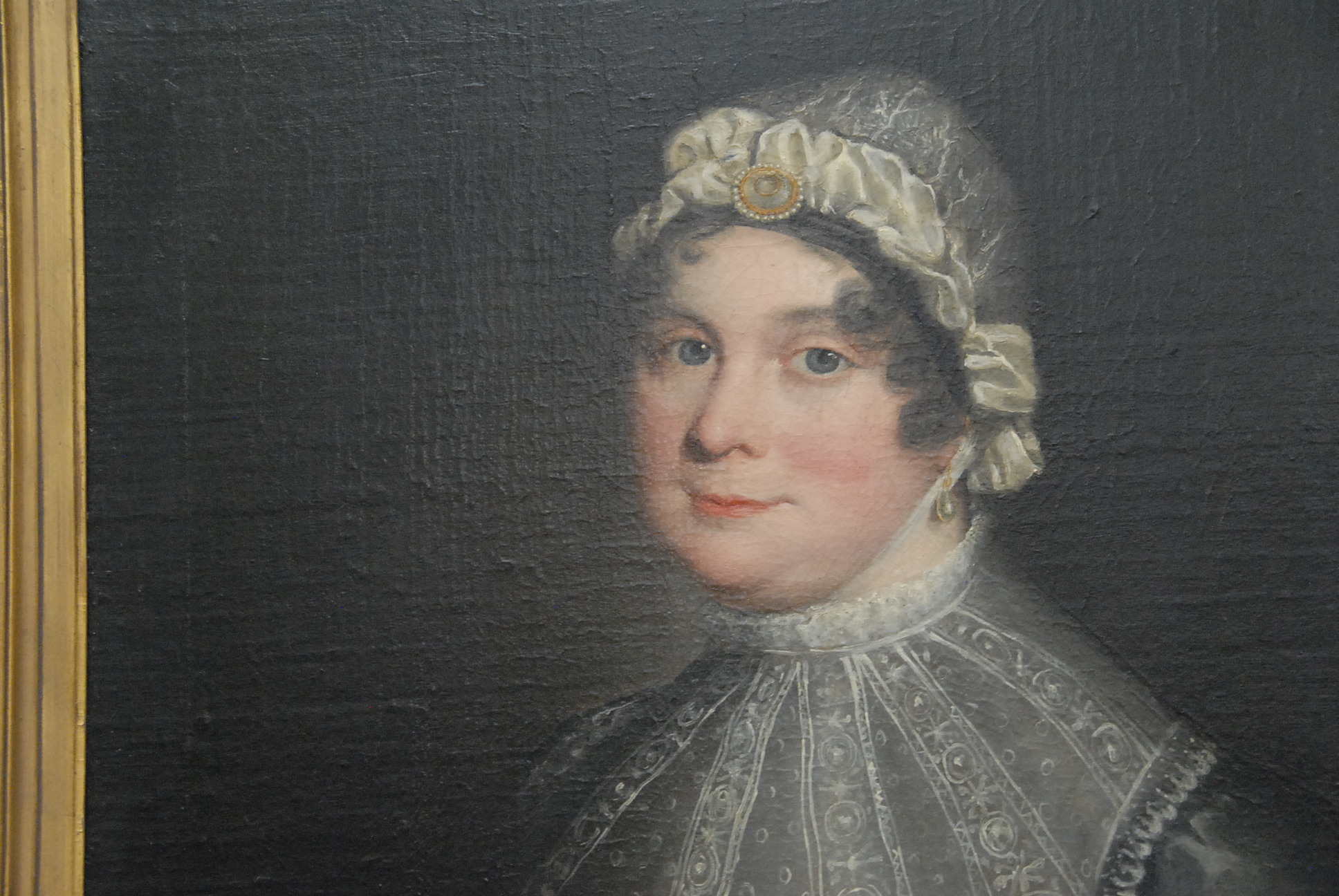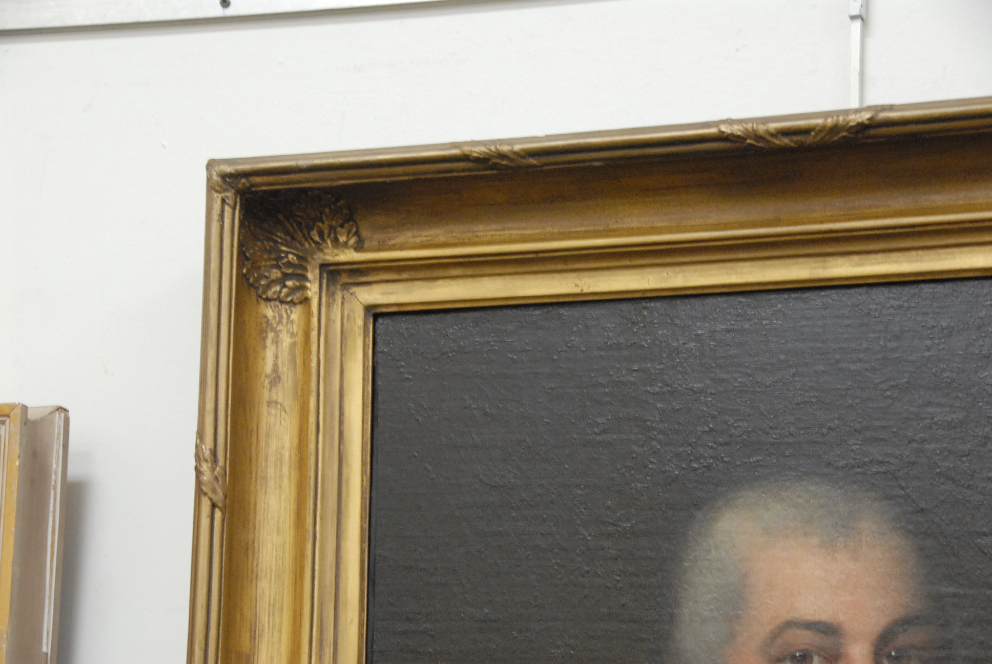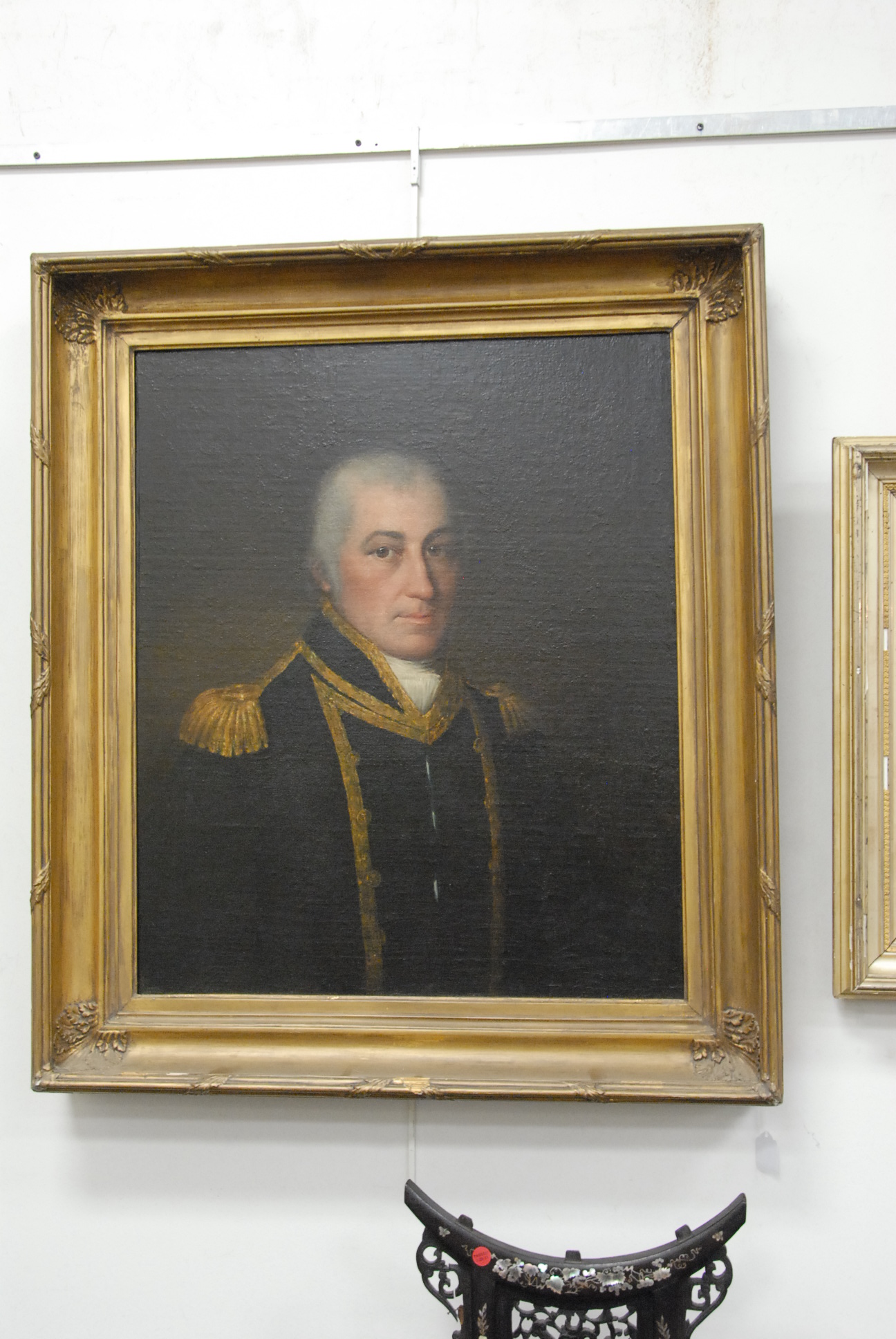 Pair of oil on canvas paintings, one bust of woman with a bonnet and a man dressed in uniform, signed lower left indistinctly, in gold frames, restretched and relined.