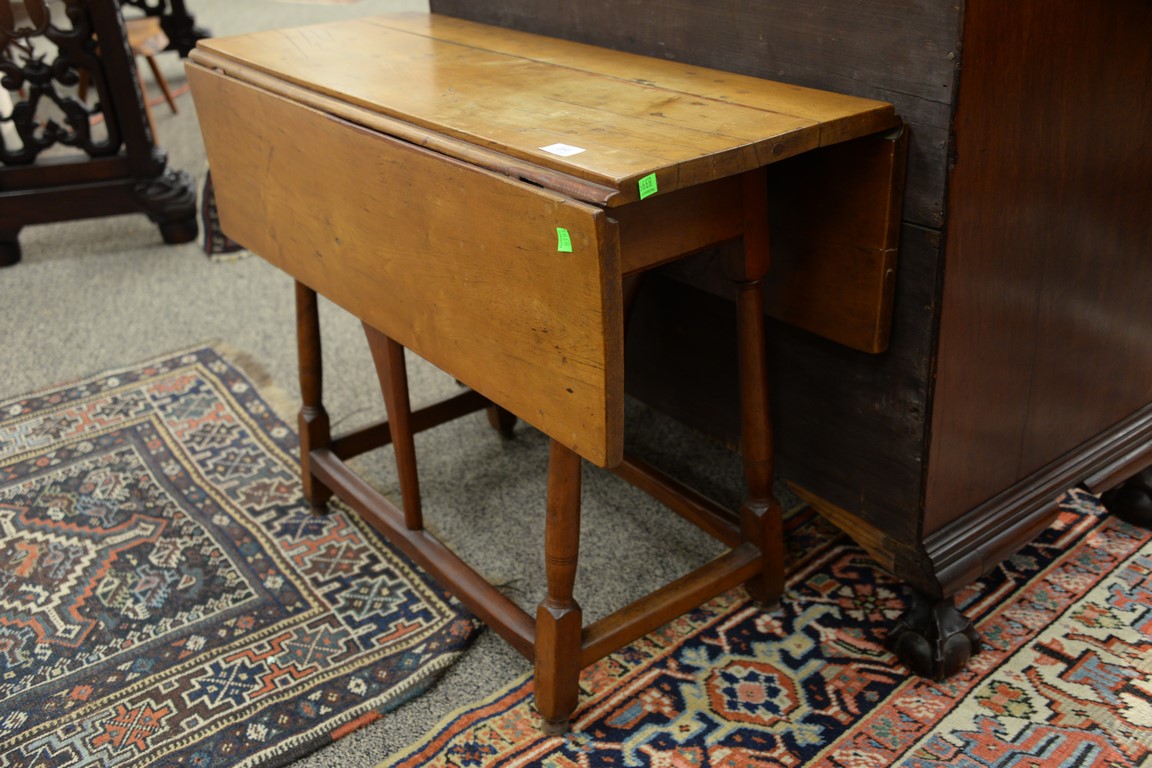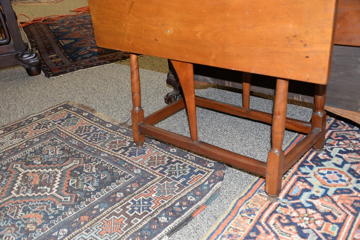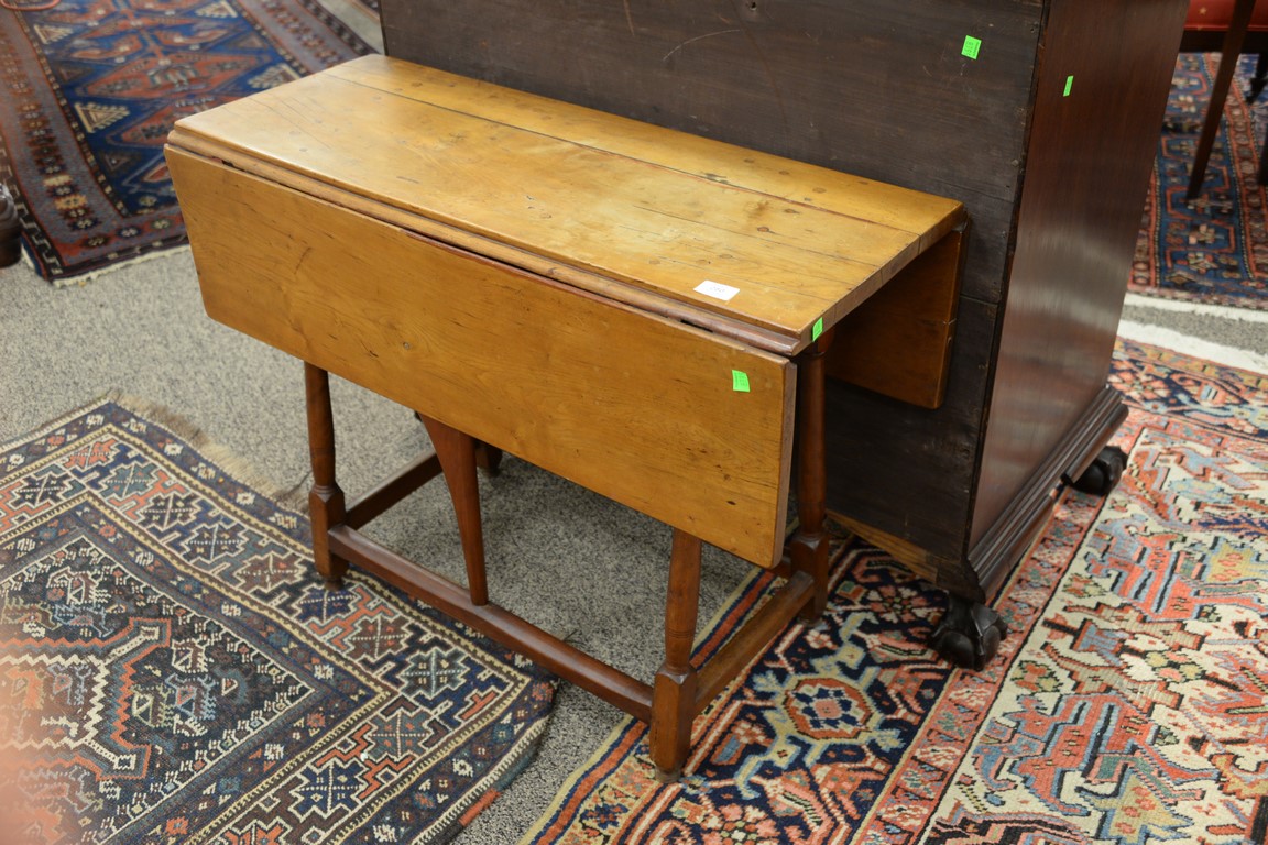 Lot 280: Queen Anne cherry Butterfly table having rectangular drop leaves on turned legs with stretcher base, traces of original red paint …
