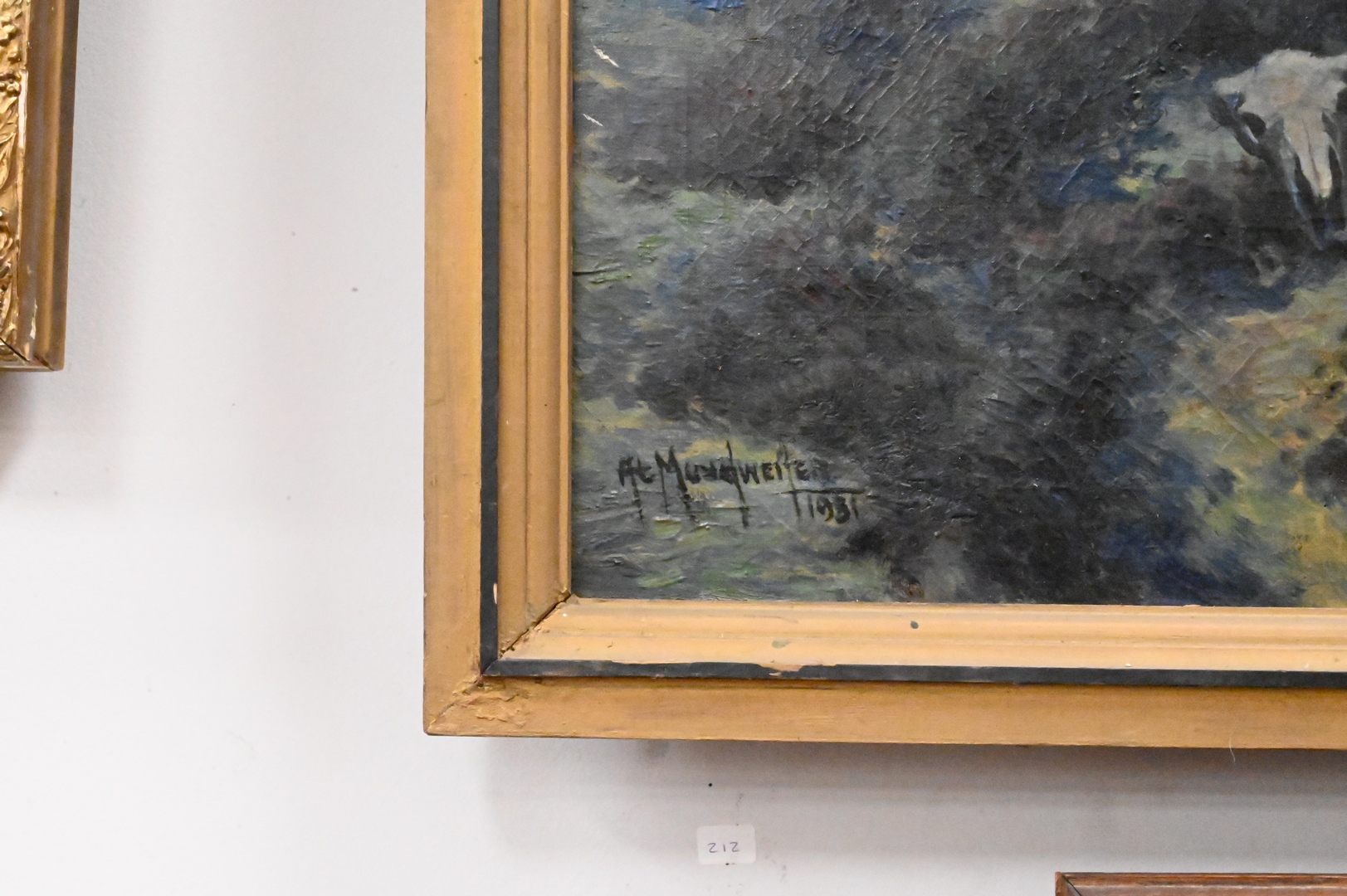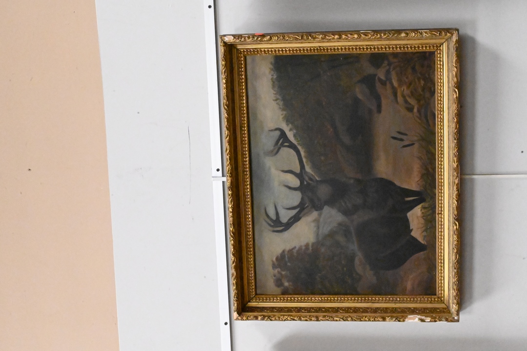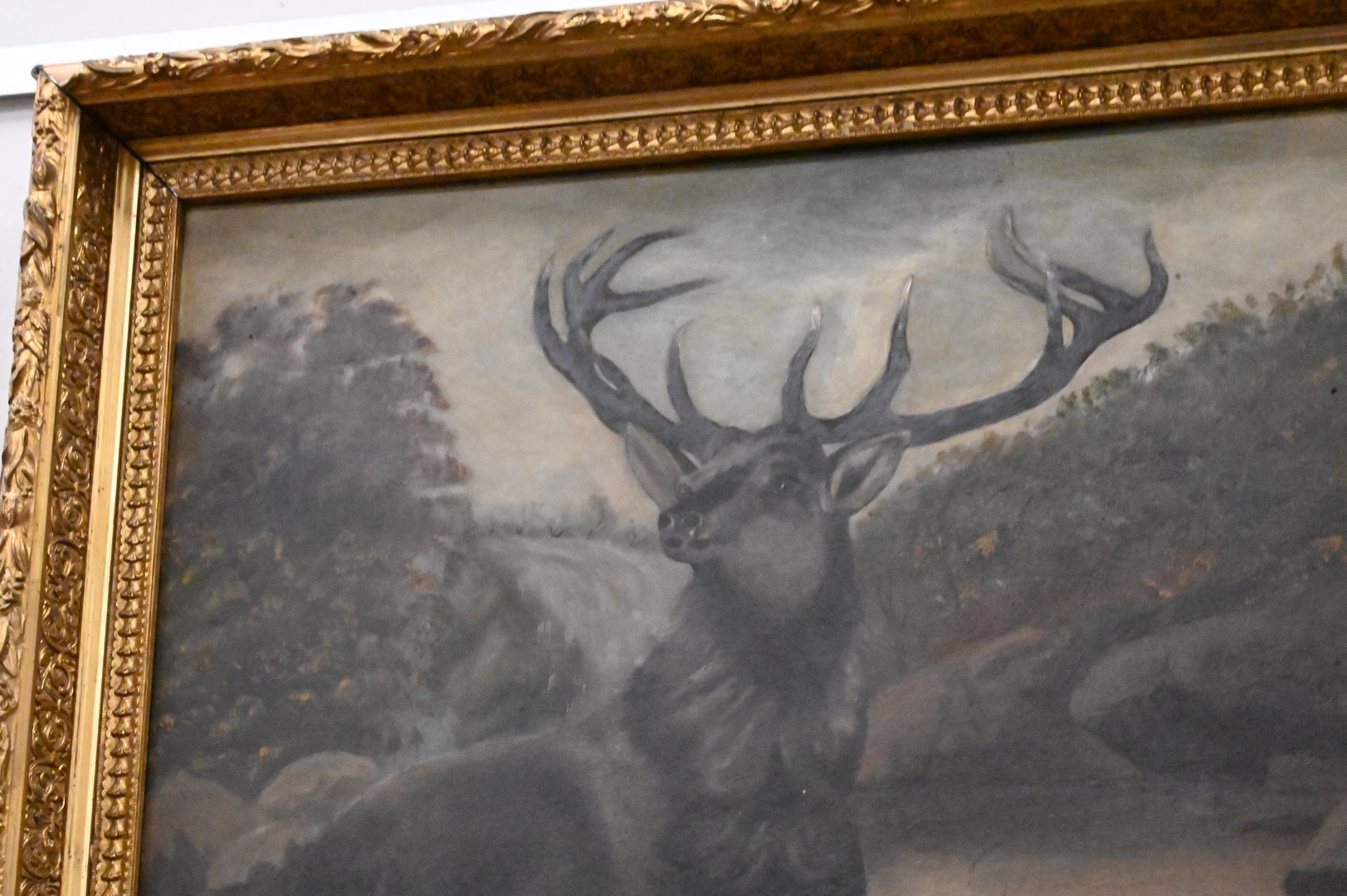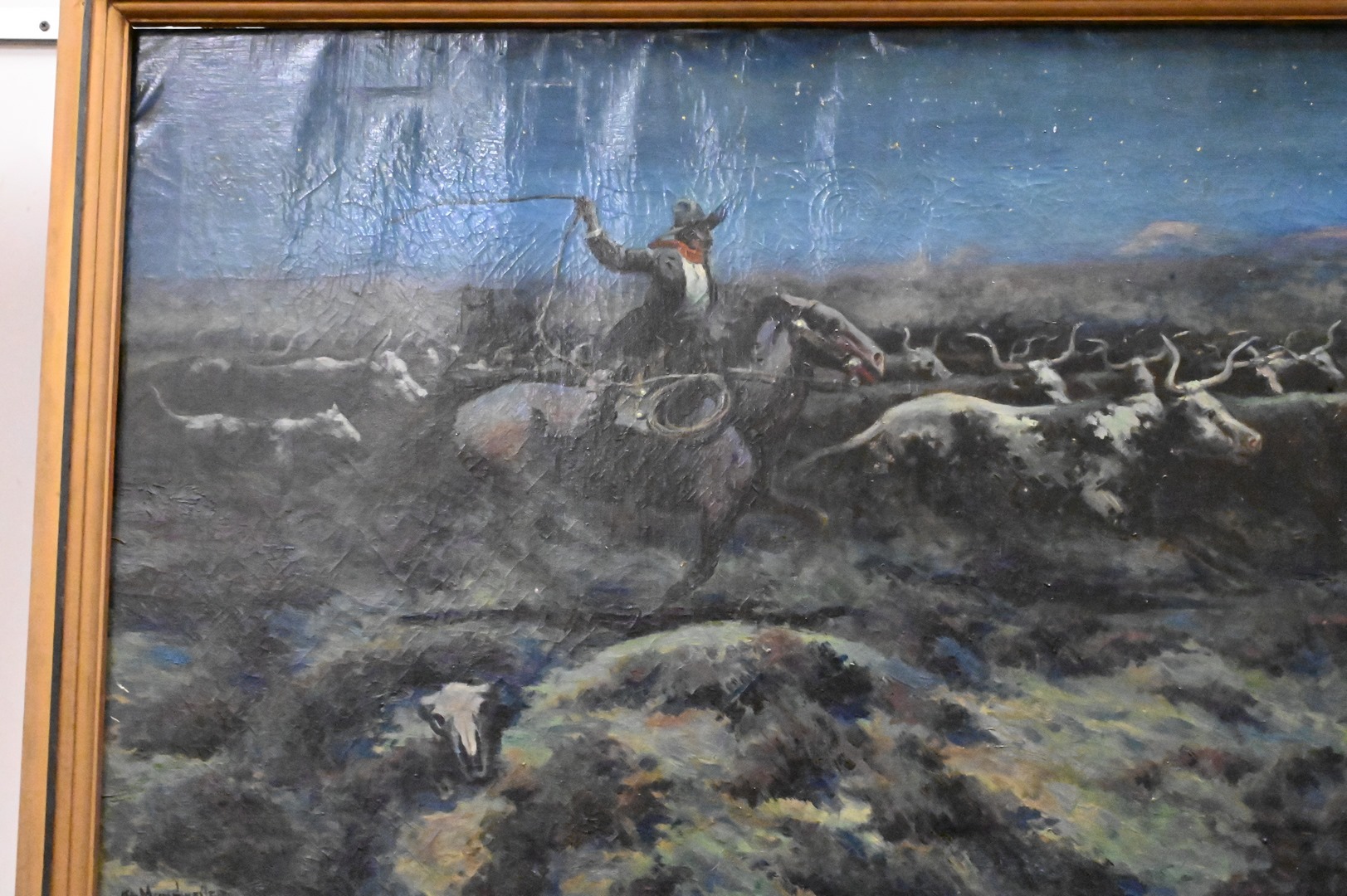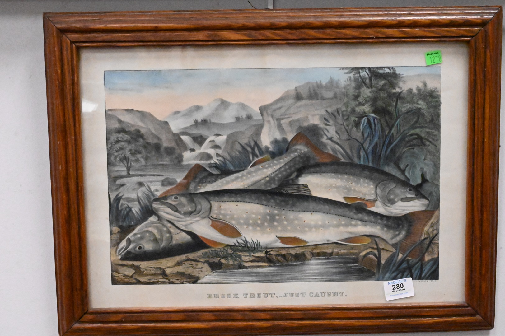 Three Piece Framed Lot, to include Currier and Ives “Brook Trout – Just Caught”; an oil on canvas painting of an elk; along with a western oil on canvas painting of cowboy and cows, size 25″x 36″, signed indistinctly on lower left. Provenance: Estate of Peter Tillou, Litchfield, Connecticut.