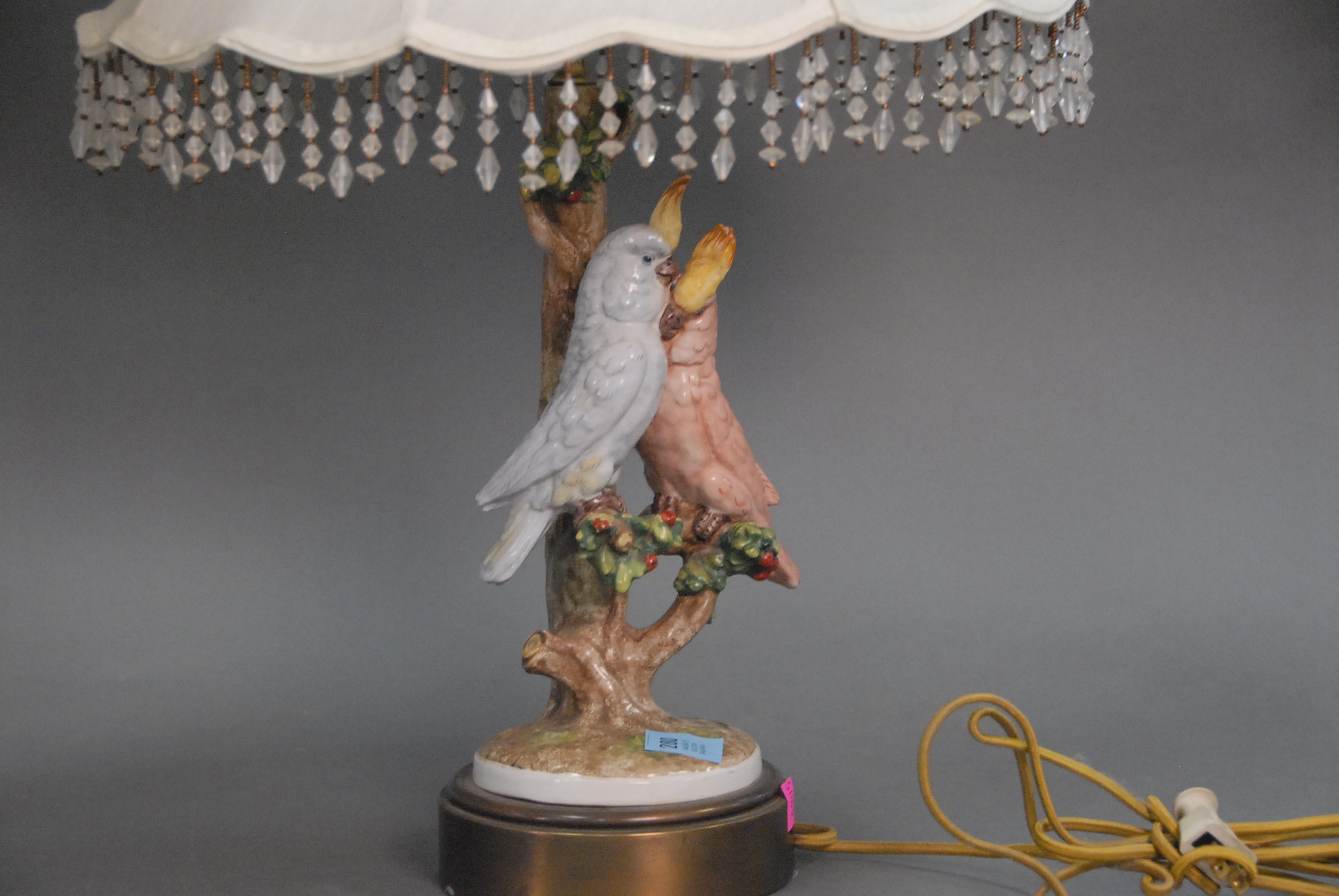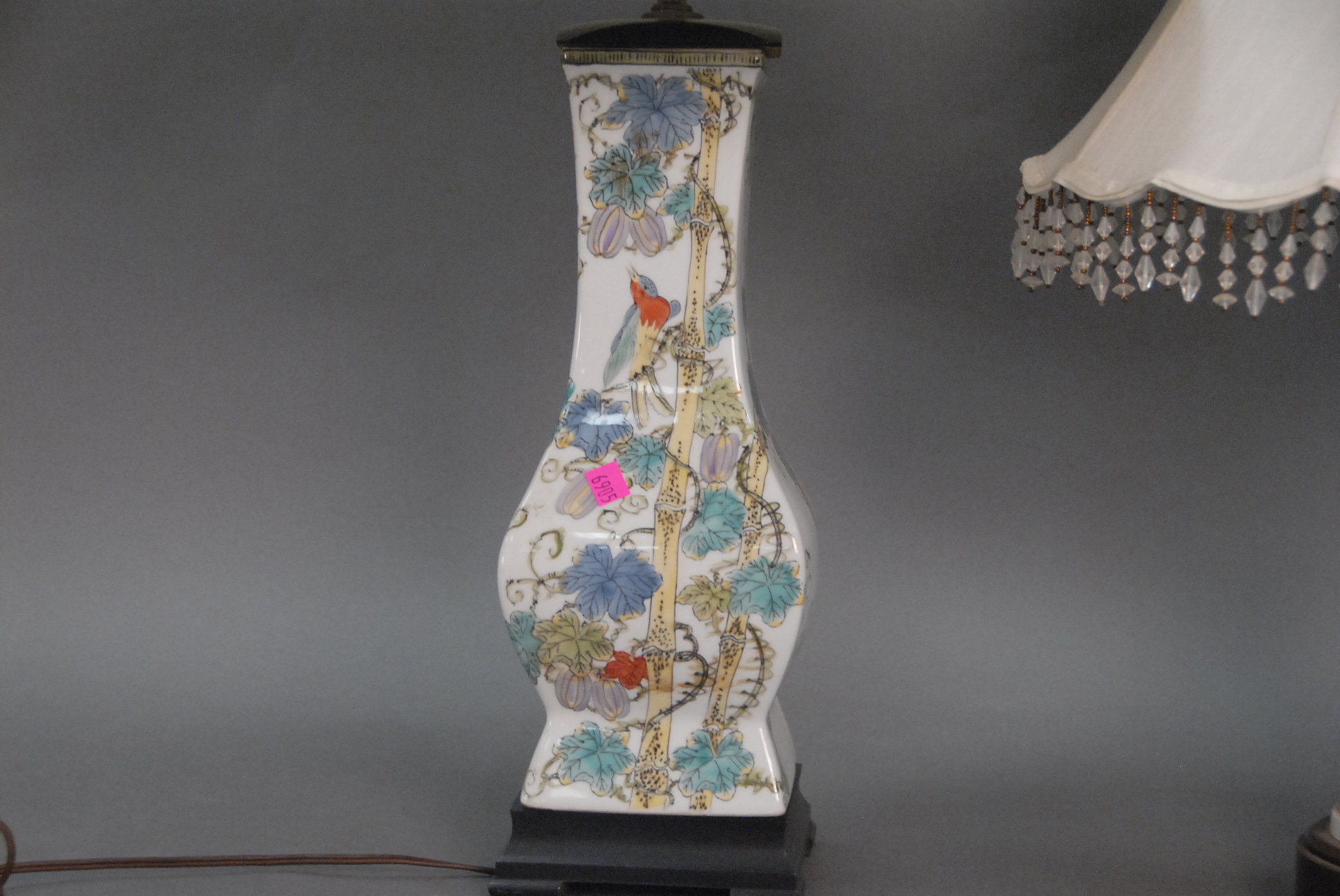 Two table lamps Oriental square vase made into table lamp and porcelain parrot table lamp.