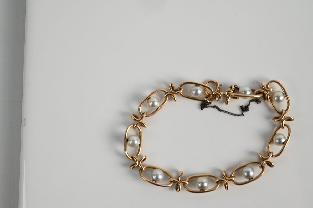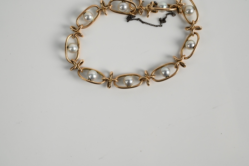 14 Karat Yellow Gold Bracelet, having nine pearls, 10.3 grams total weight.