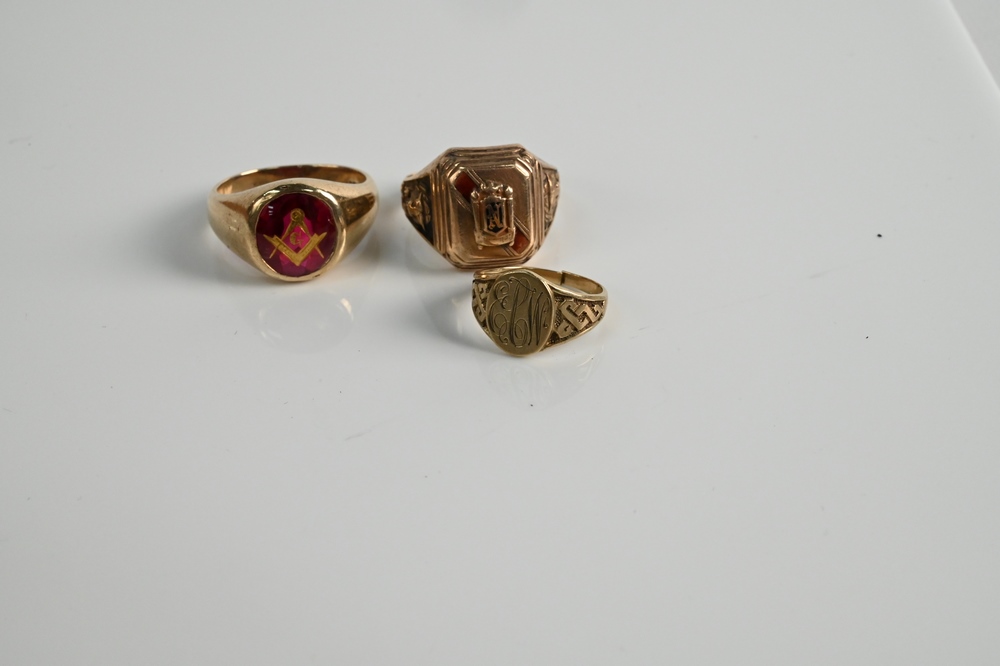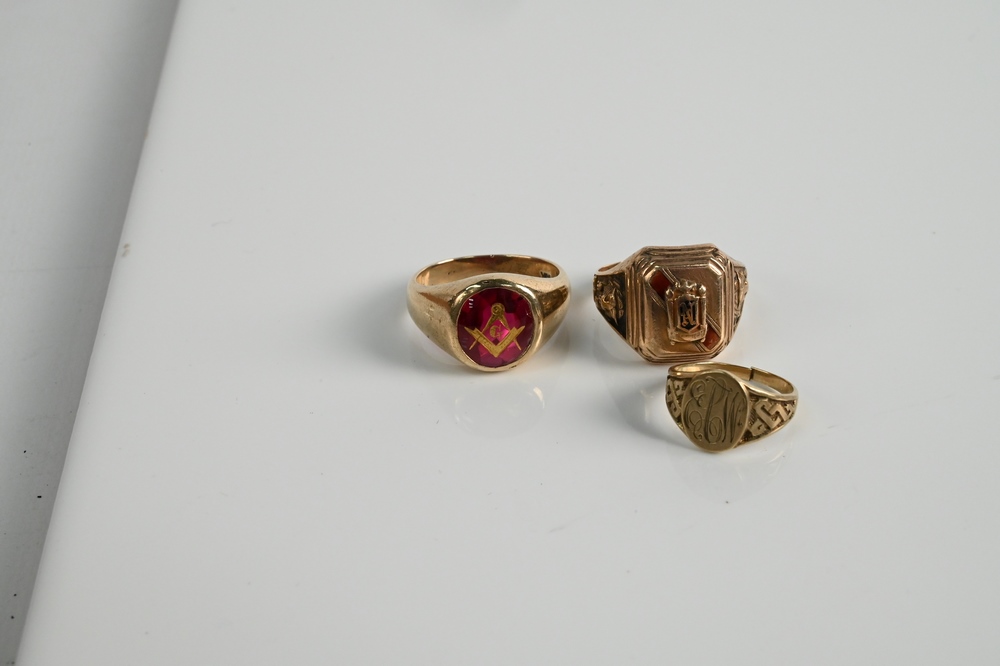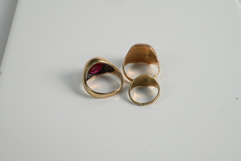 Group of Three 10 Karat Yellow Gold Men’s Rings, to include one set with red stone, 15.1 grams total weight.
