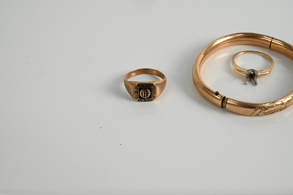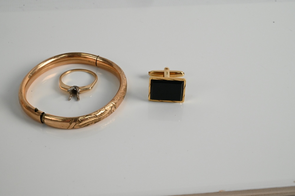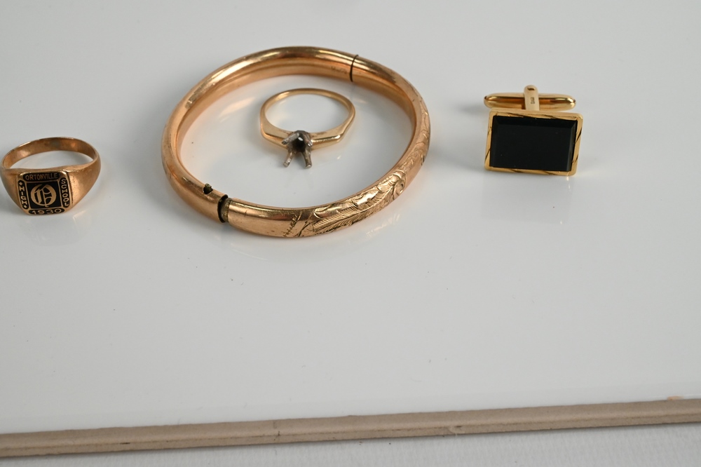Group of Gold Jewelry, to include 18 karat gold cufflinks; 10 karat gold ring; 14 karat gold ring; along with a gold bracelet; 21 grams.