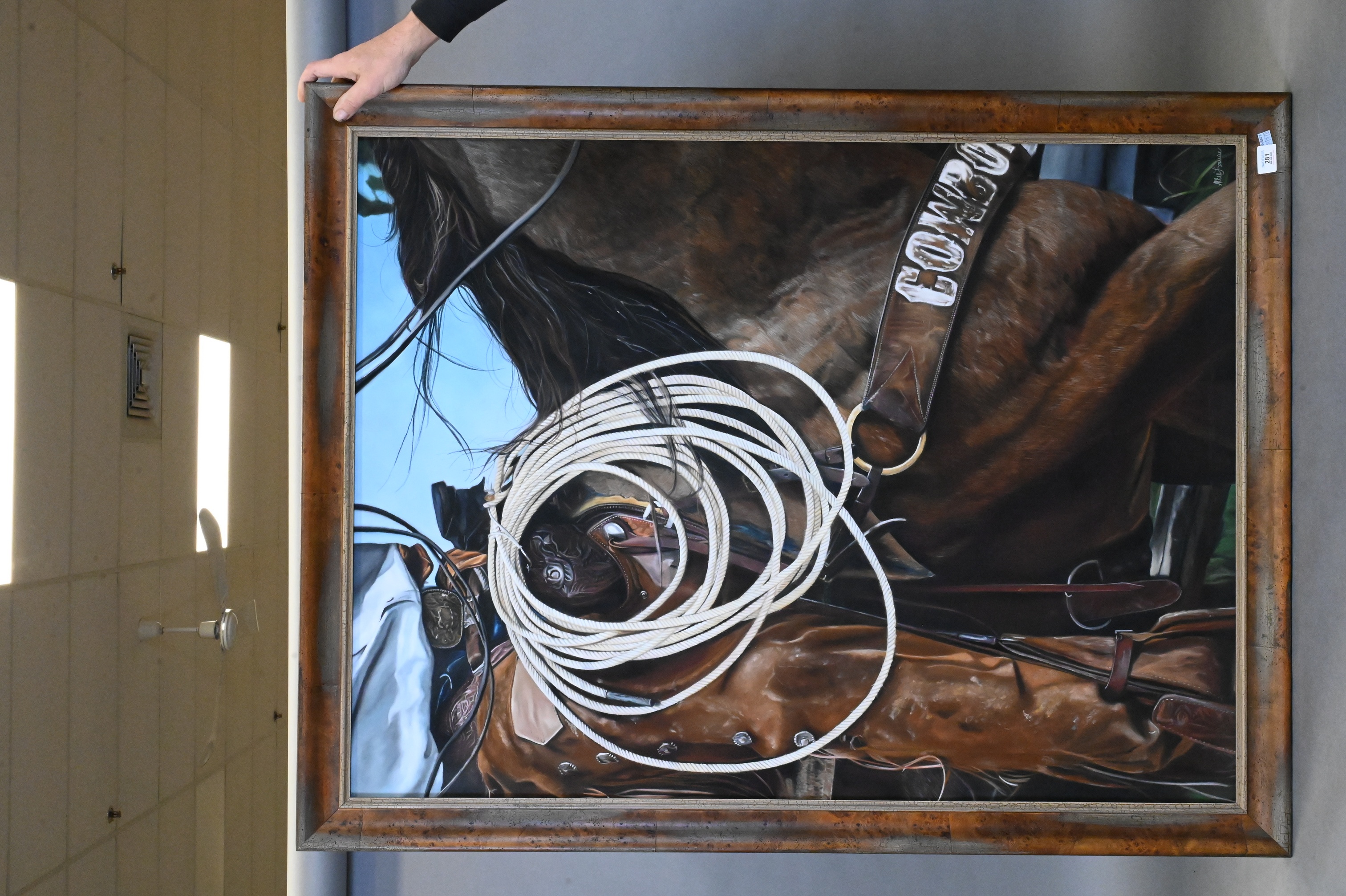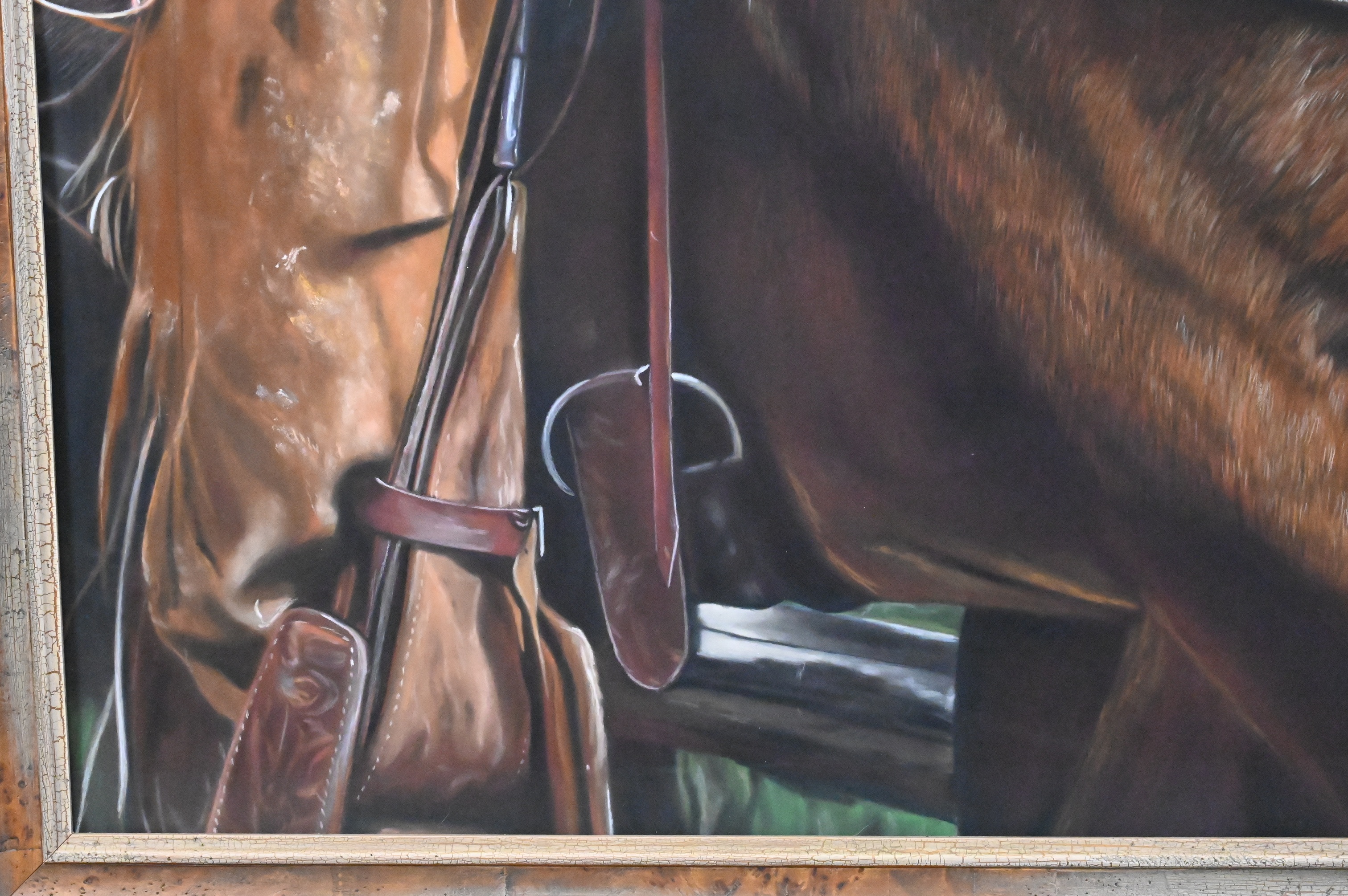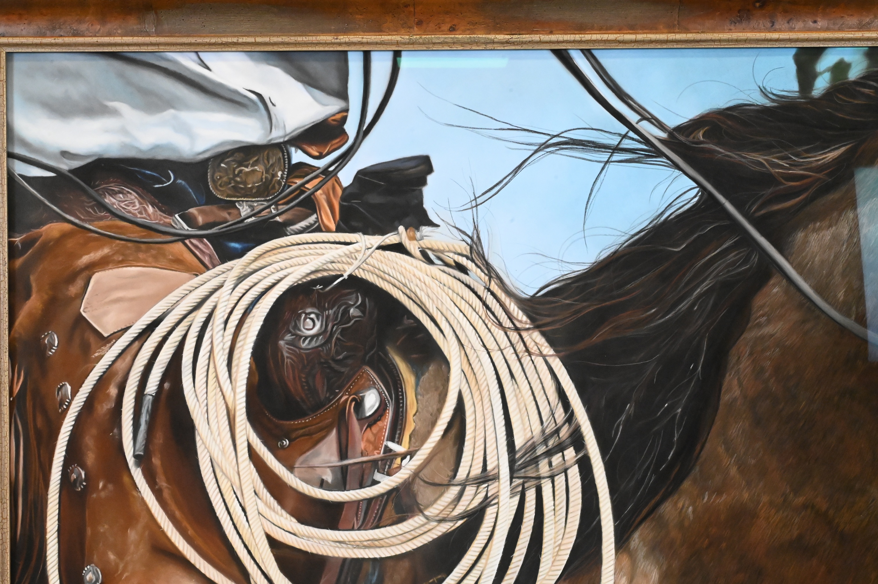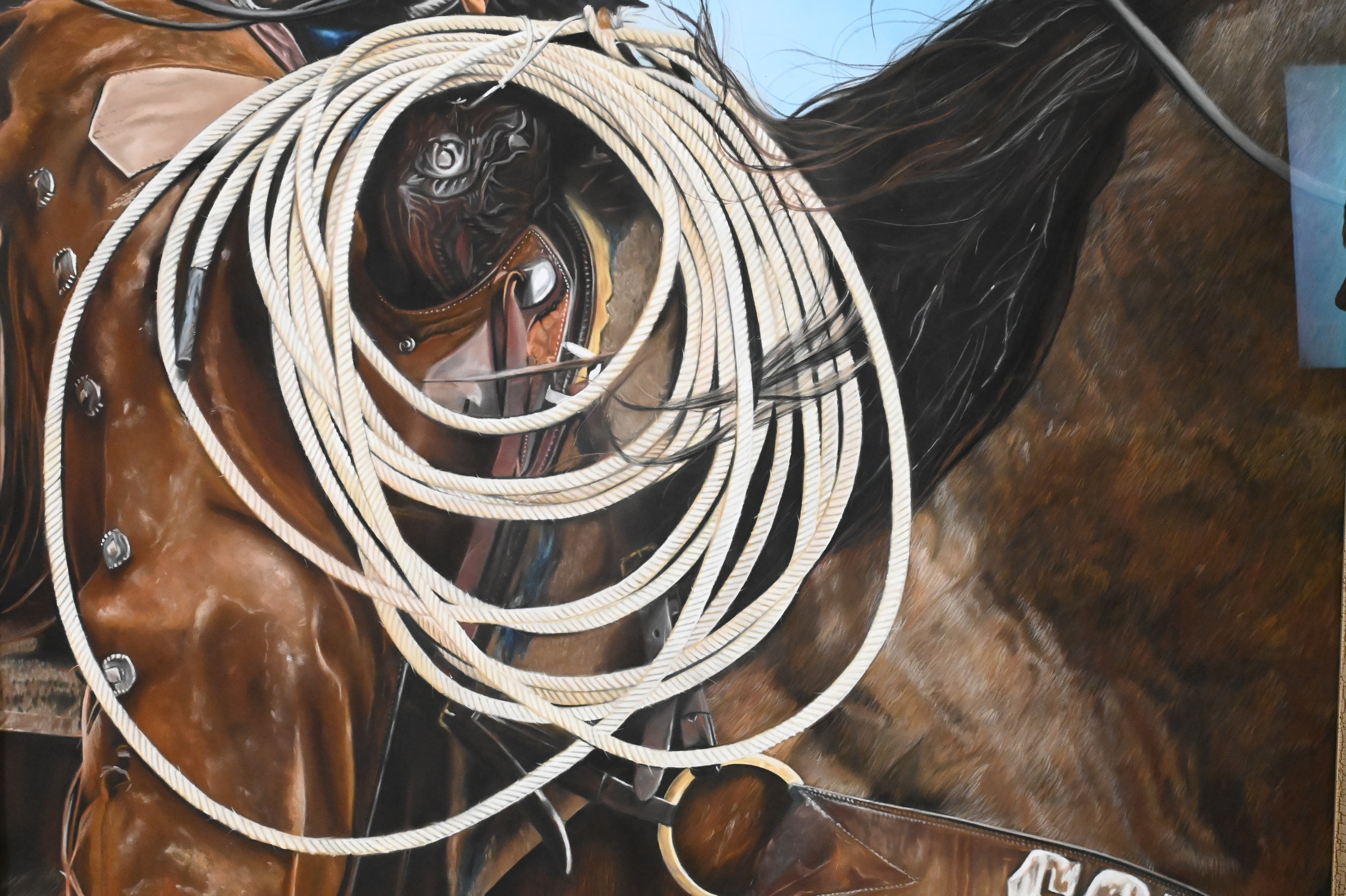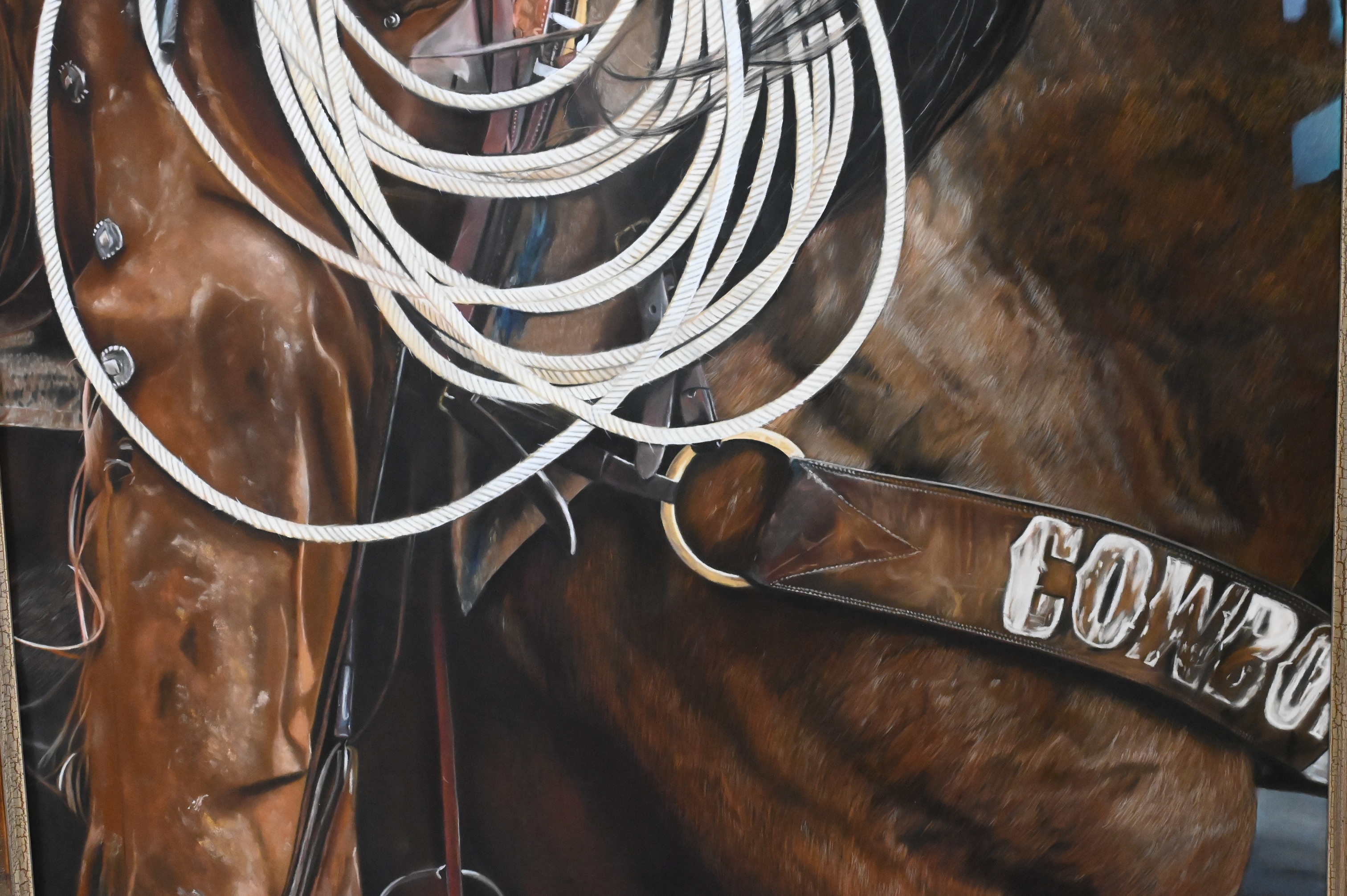 depicting a detailed close-up of a saddled horse with coiled lariat, leather tack, and embossed cowboy belt, rendered with rich texture and strong light; a striking contemporary homage to the working traditions of the American West