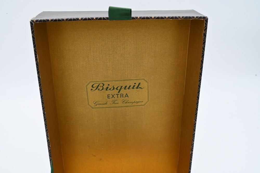 Baccarat Biscuit Extra Grande Fine Champagne Cognac, full decanter, in original box, height 5 inches, width 11 1/2 inches, depth 8 inches.