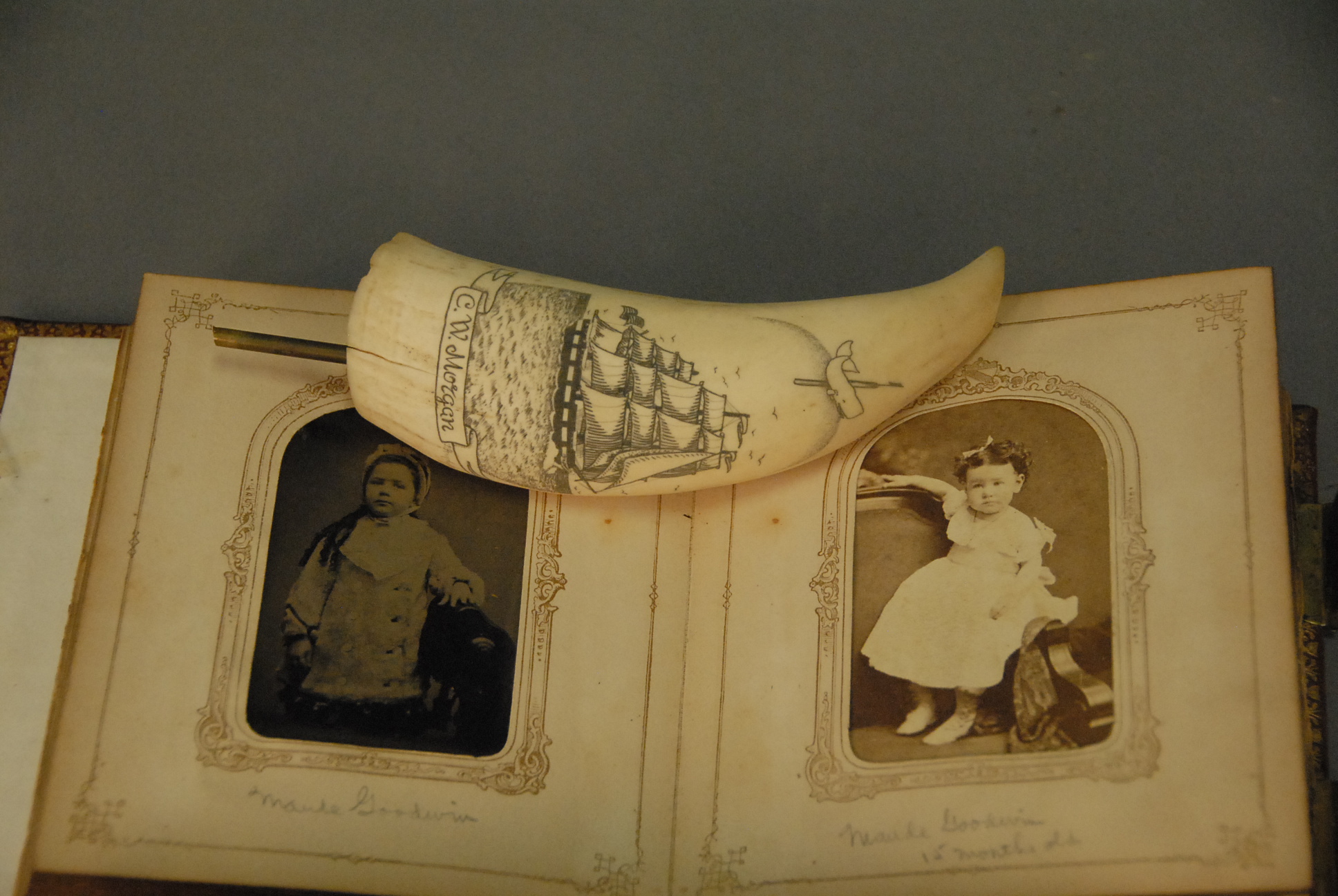 Box lot to include hat pins, marbles, three porcelain miniature dolls, Victorian photo book with tin types, scrimshaw whales tooth, etc.