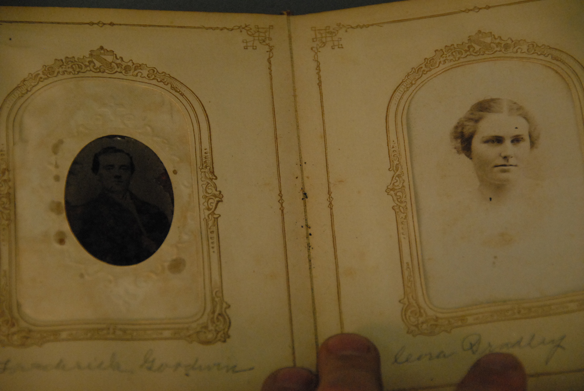 Lot 281: Box lot to include hat pins, marbles, three porcelain miniature dolls, Victorian photo book with tin types, scrimshaw whales tooth, …