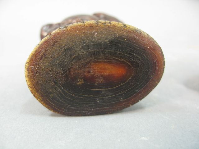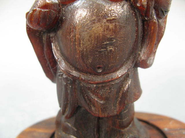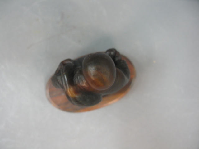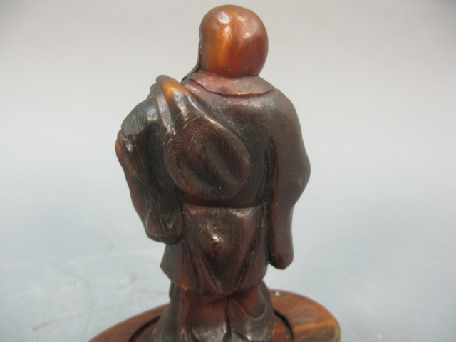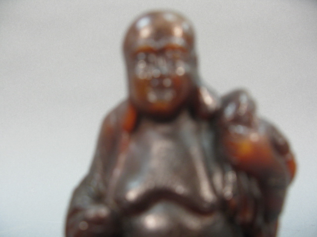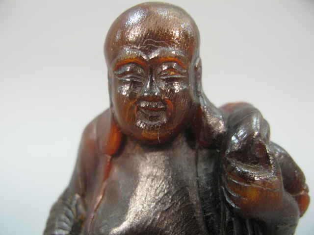Carved horn Buddha figure having ball in his right hand and bag draped over his left shoulder with stand.