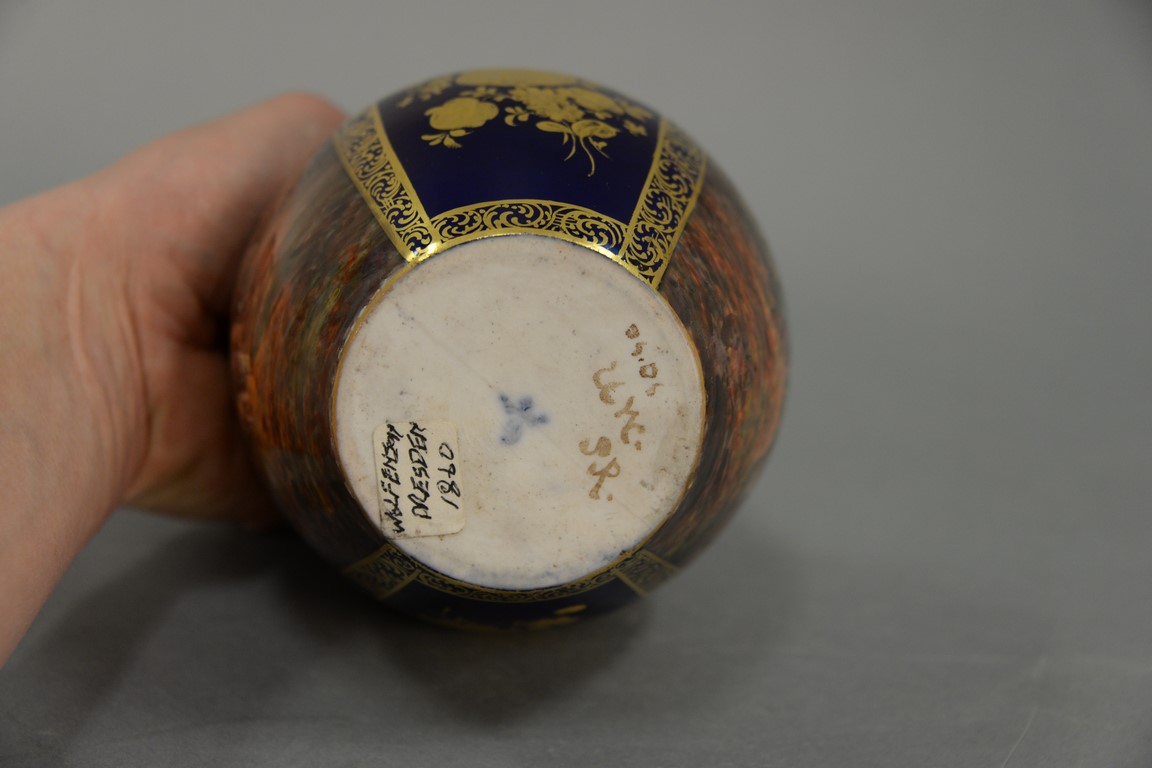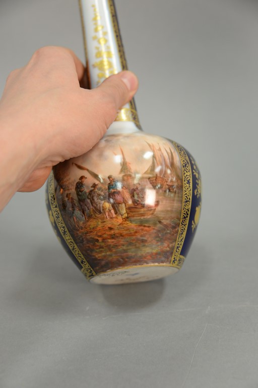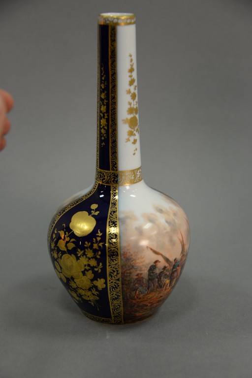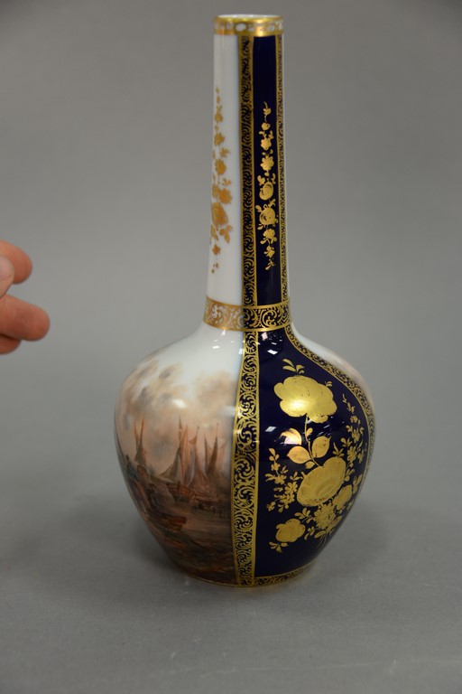 Lot 281: Dresden porcelain bottle shaped vase with painted ship harbor and market scene, Dunder Crown mark on bottom, ht. 10in.