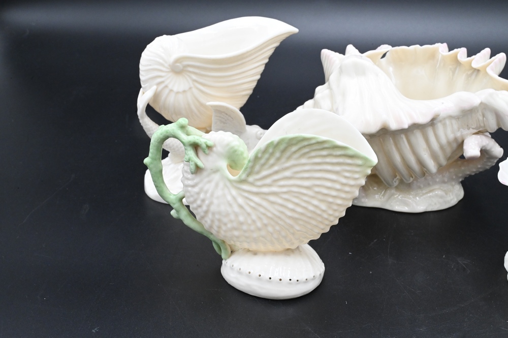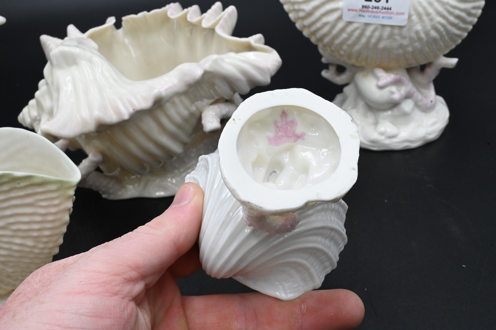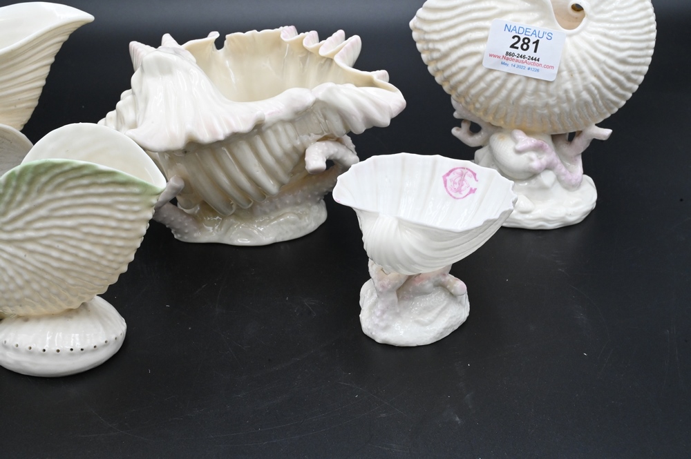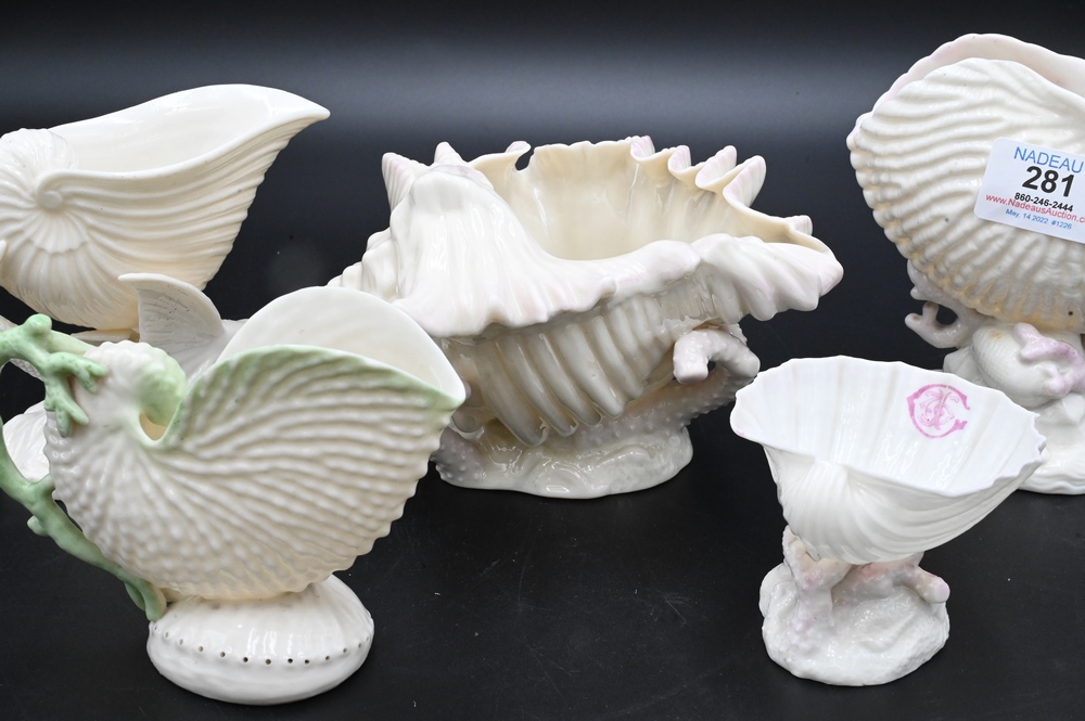 Five Belleek Shell Form Pieces, to include a conch shell on coral form base; shell on flying fish base; along with three shell form compotes; having black and pink marks; tallest vase 6 inches. Provenance: Collections of Norma Reilly, New Jersey.
