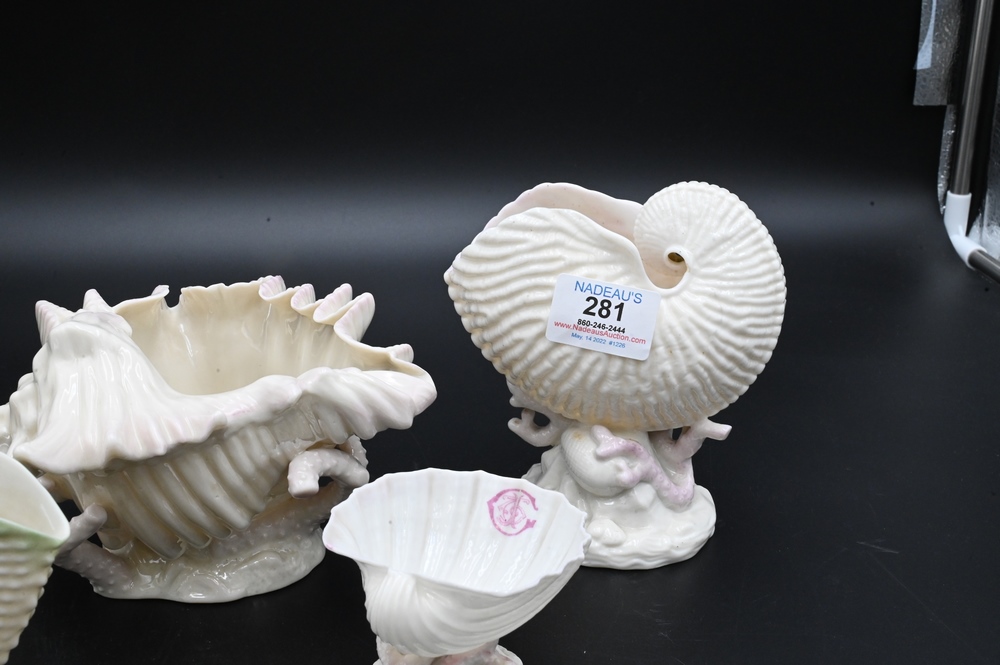 Lot 281: Five Belleek Shell Form Pieces, to include a conch shell on coral form base; shell on flying fish base; along with three shell form compotes; having black and pink marks; tallest vase 6 inches. Provenance: Collections of Norma Reilly, New Jersey.