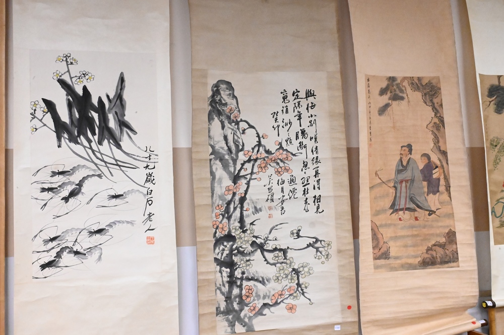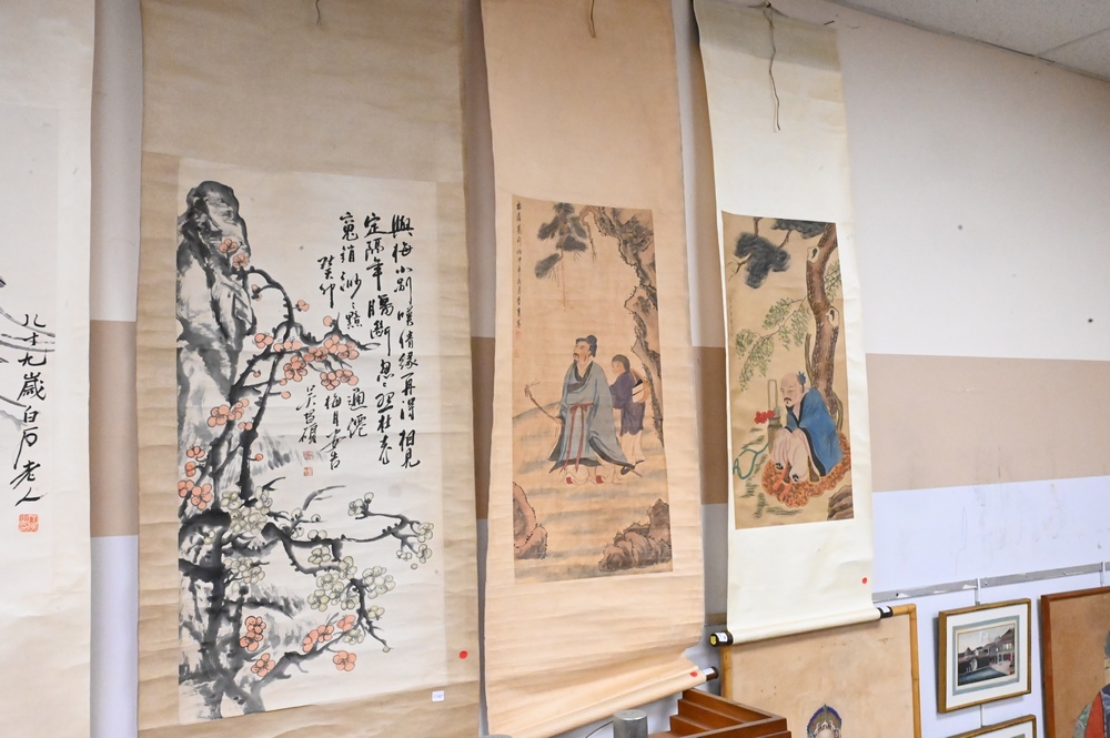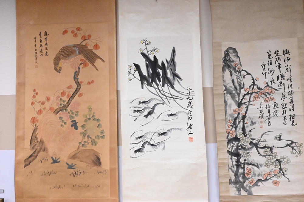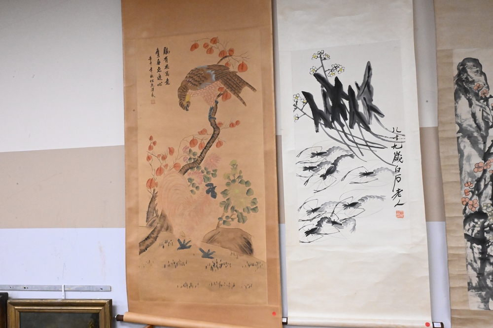 Lot 281: Five Chinese Hand Painted Scrolls, to include two depicting scholars, one with scrolling flowers, one with dragonflies, one with rooster and tropical bird; all with writing and seals; largest image size 50″ x 24″.