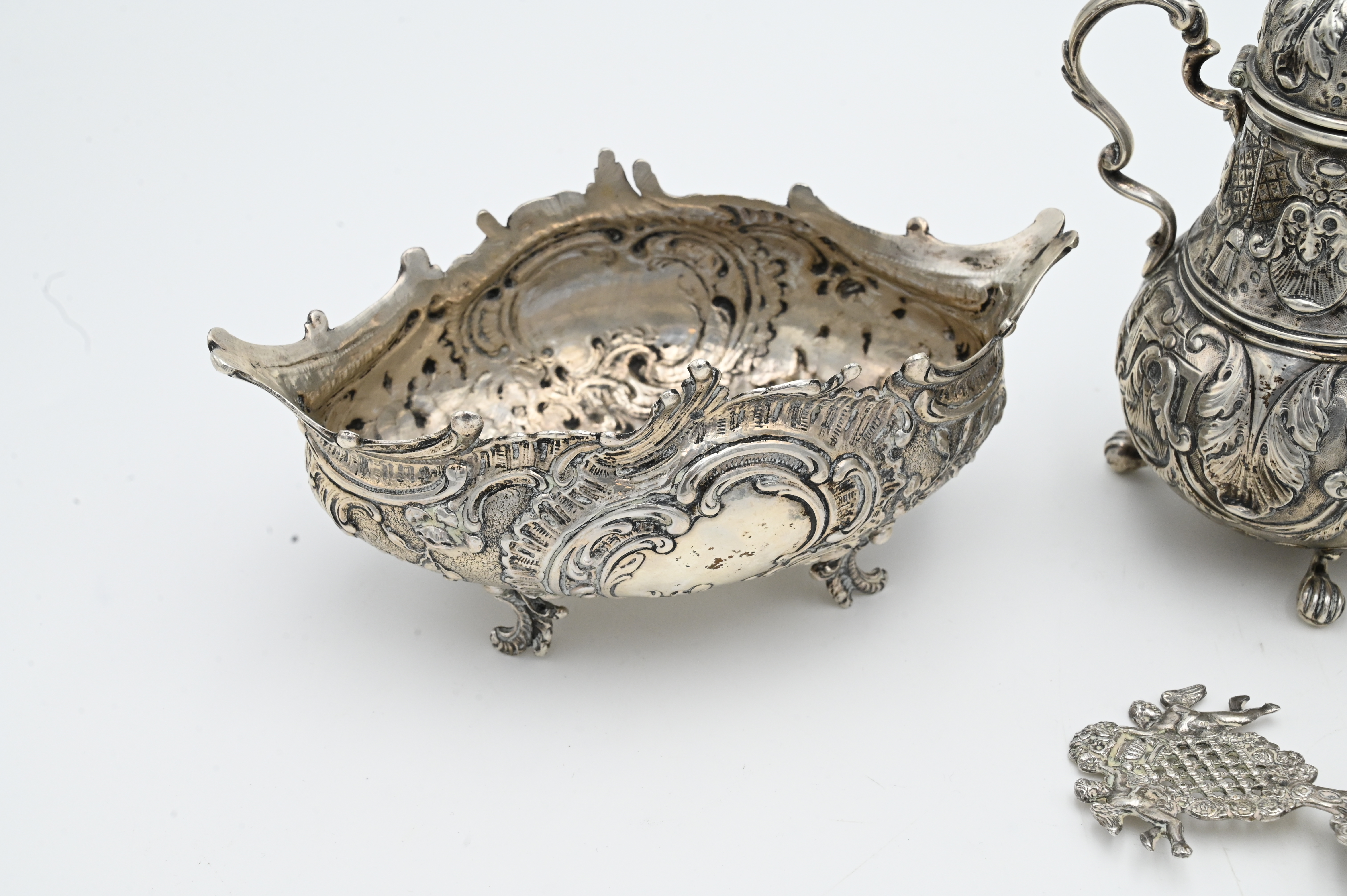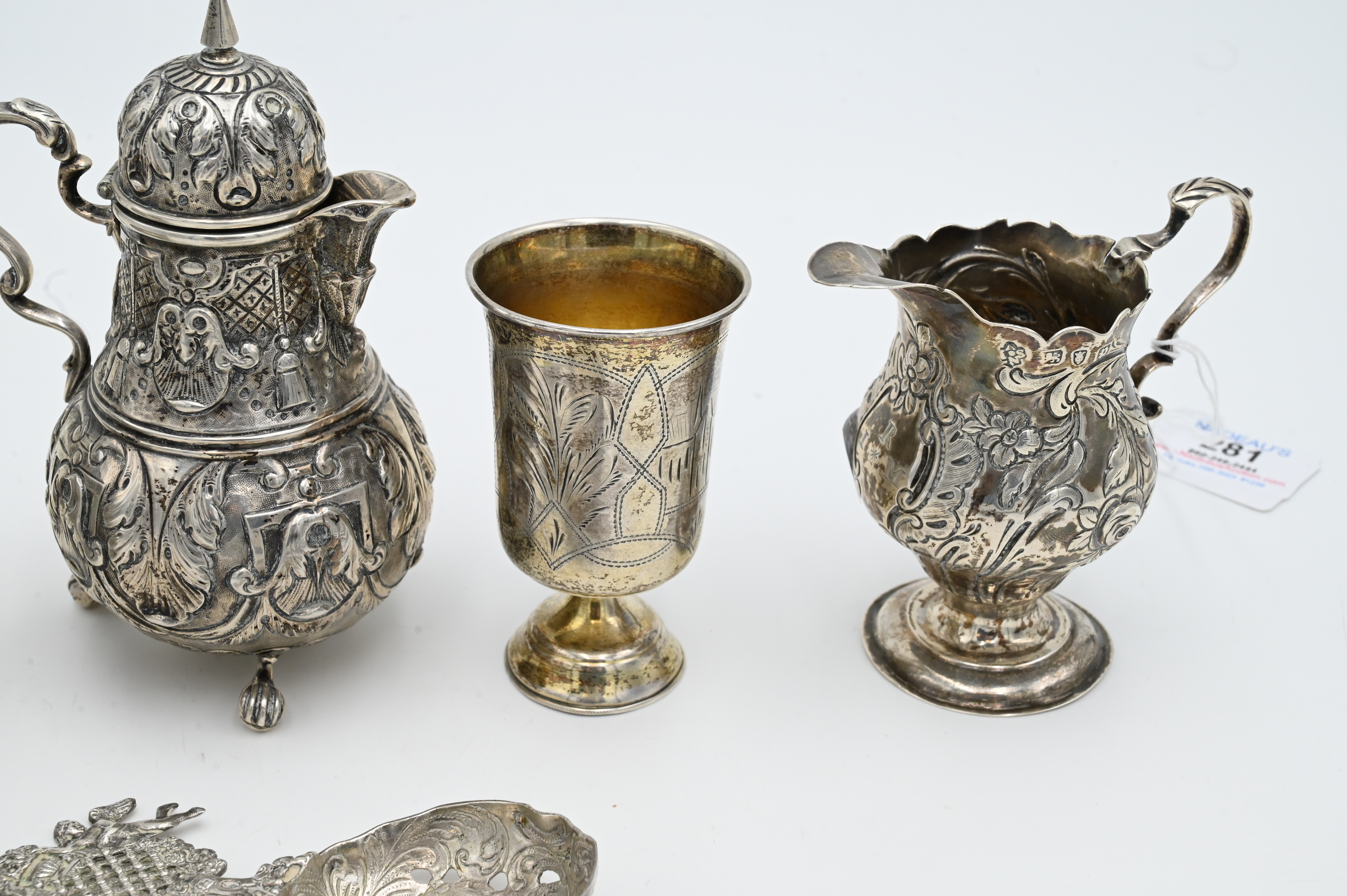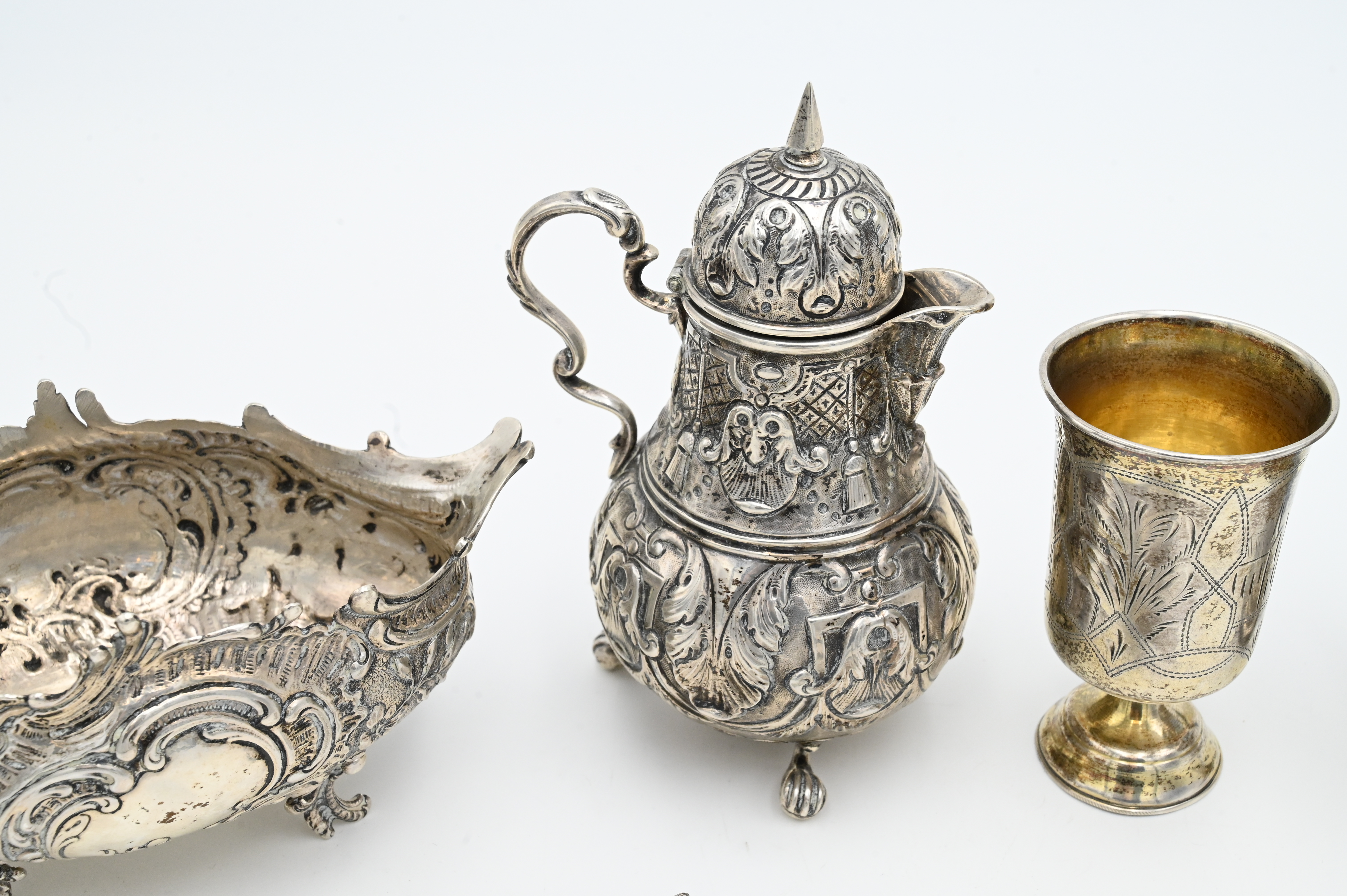 Five Piece Continental Silver Lot, to include repousse creamer, gravy boat marked .800, scenic pen strainer, creamer set on three paw feet, along with a small chalice, tallest 5 3/4 inches, 16.0 t.oz.