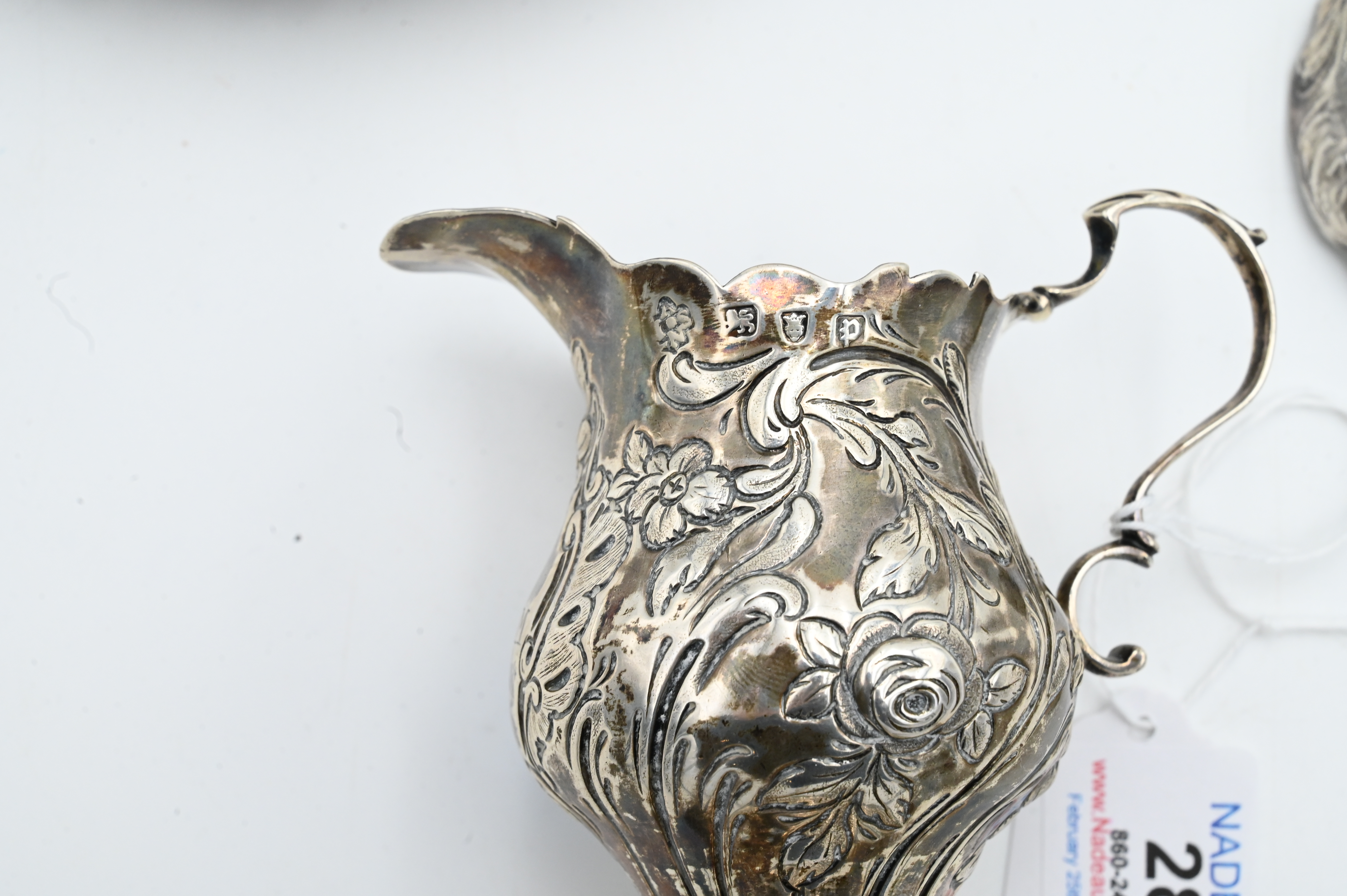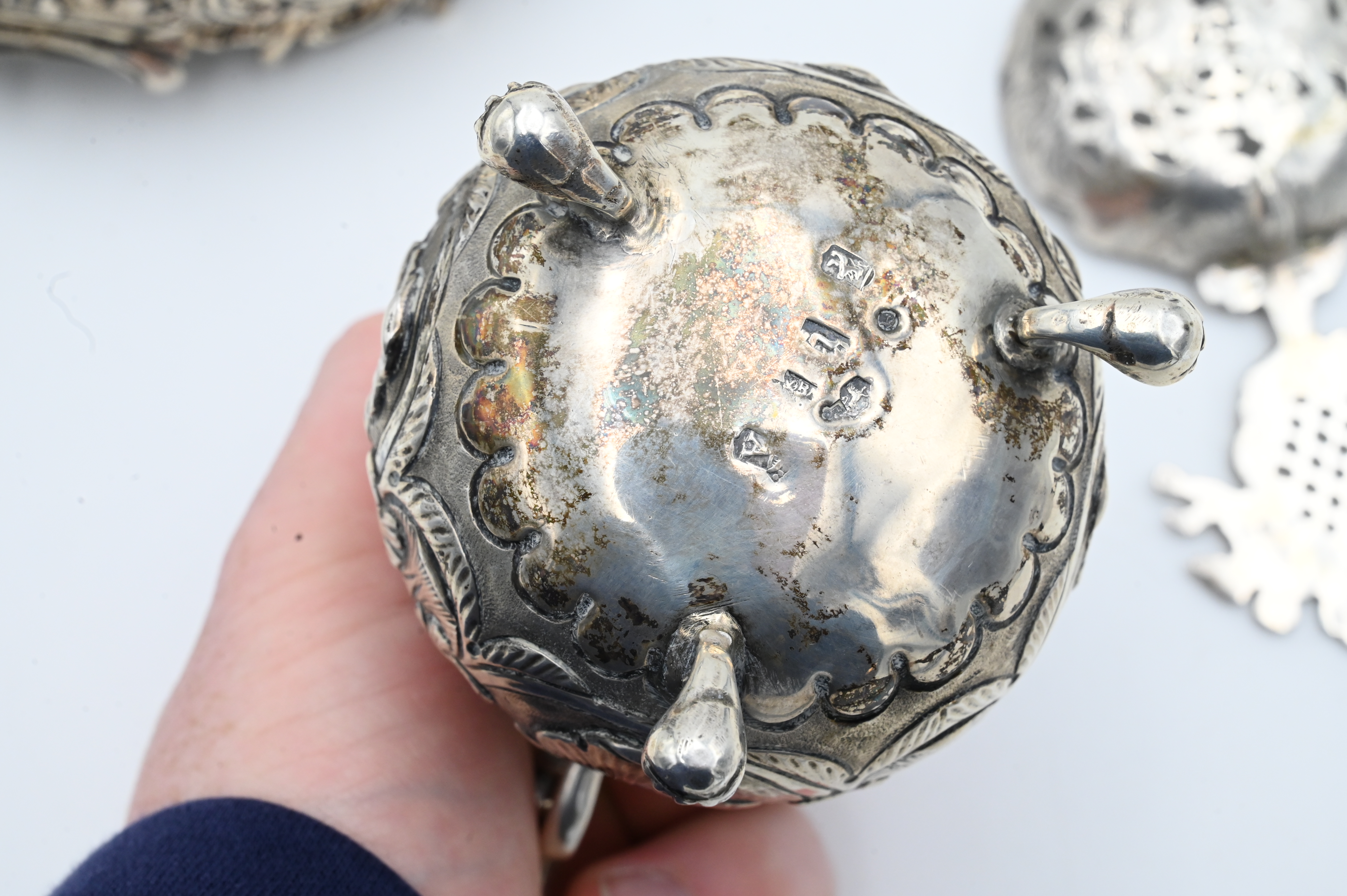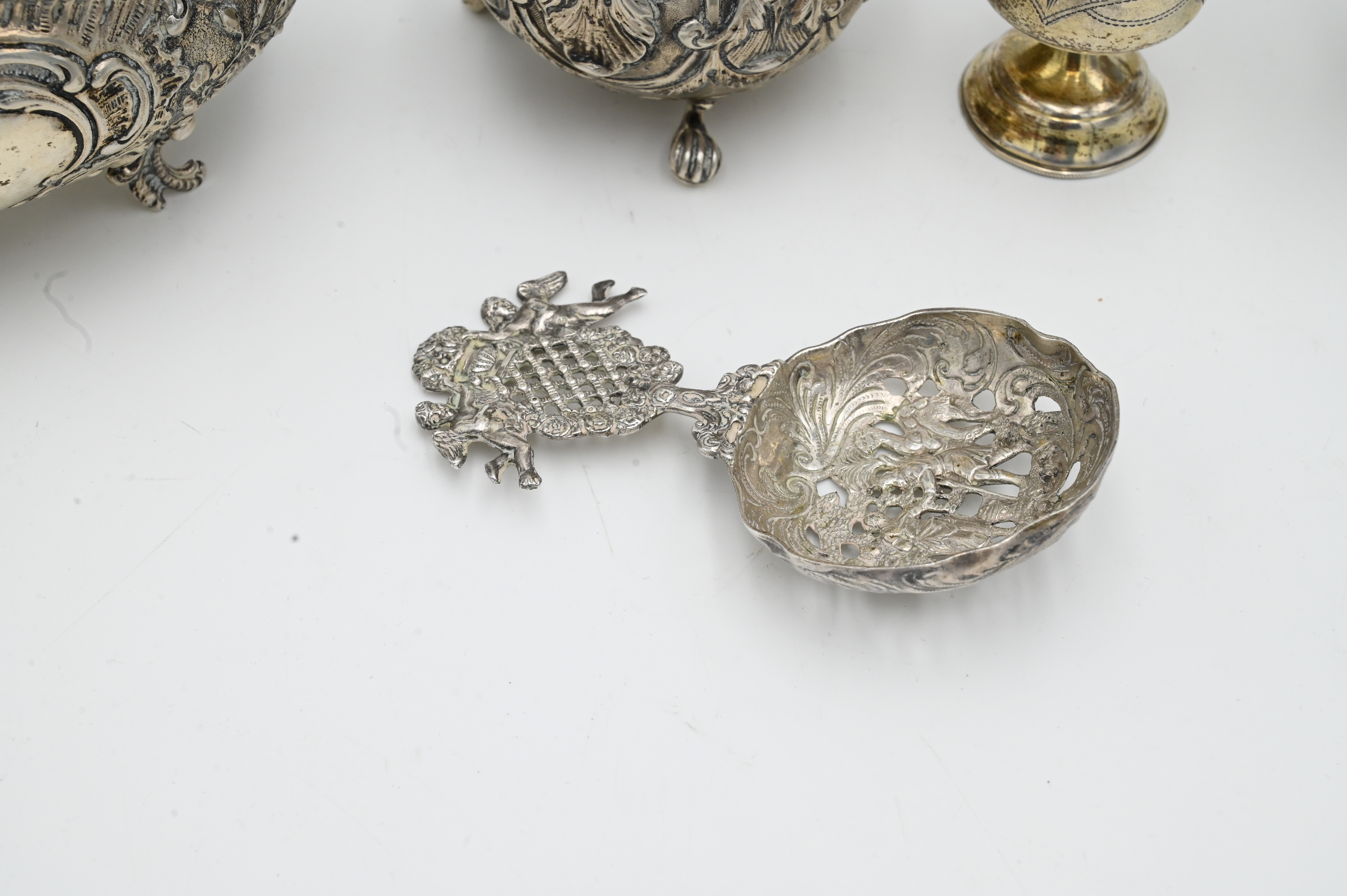 Five Piece Continental Silver Lot, to include repousse creamer, gravy boat marked .800, scenic pen strainer, creamer set on three paw feet, along with a small chalice, tallest 5 3/4 inches, 16.0 t.oz.