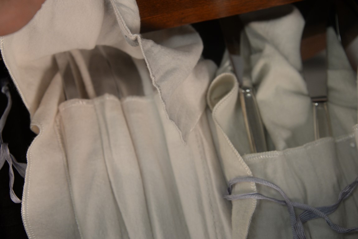Georg Jensen sterling flatware set, serving for twelve, Cypress pattern Denmark, Tias Eckhoff b. 1926, 92 piece complete set to include 12 dinner knives, 12 dinner forks, 12 luncheon forks, 12 fish forks, 12 tablespoons, 12 teaspoons, 12 coffee spoons, 4 serving spoons, ladle, bottle opener, and pair of salad servers. total weight 96 t oz. plus 12 handles