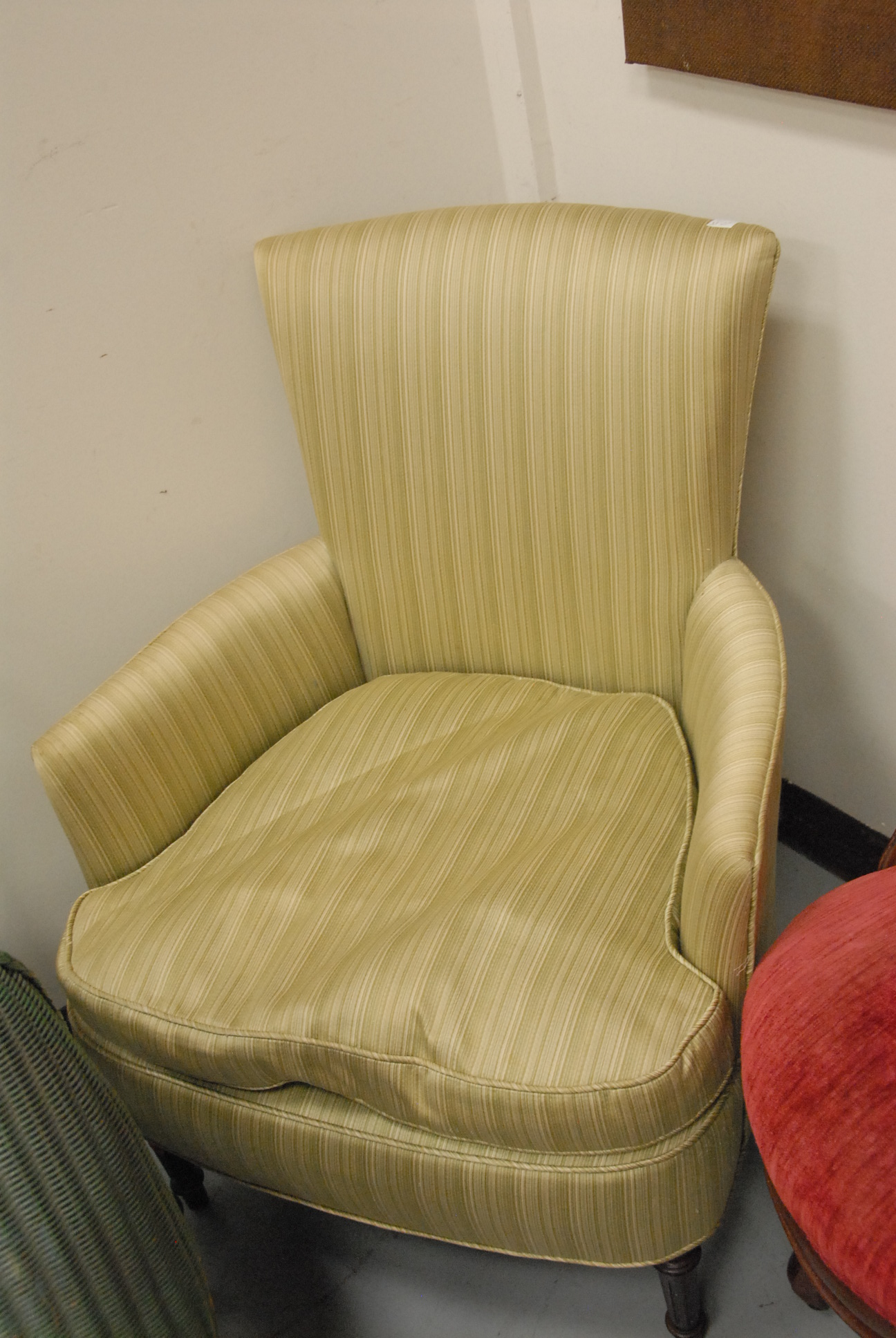 Group lot to include a half round table, a child’s Boston rocker, a metal gallery, bamboo chair, wicker stroller, and an upholstered armchair.