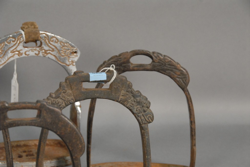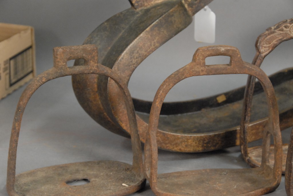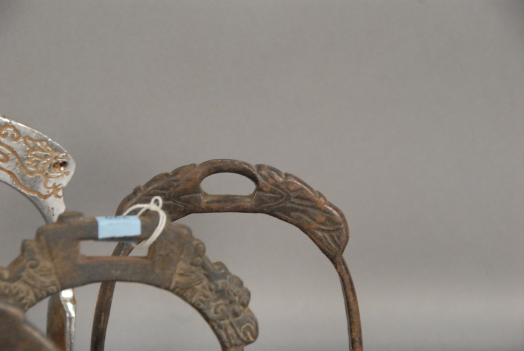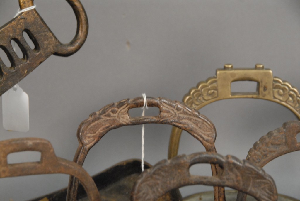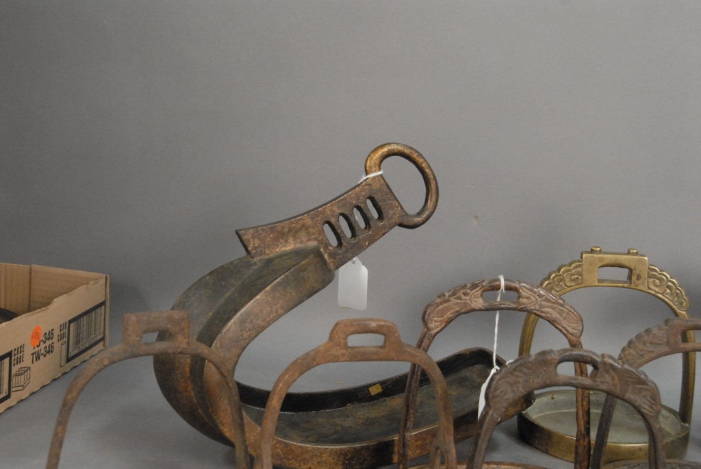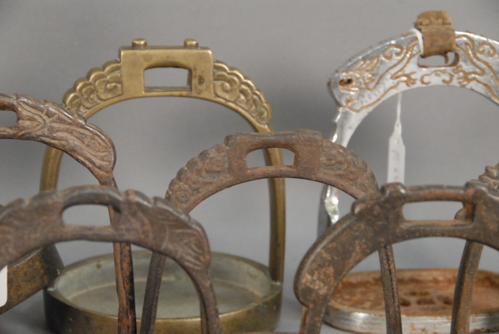 Group of eleven horse stirrup abumi, made of iron, steel, and brass.