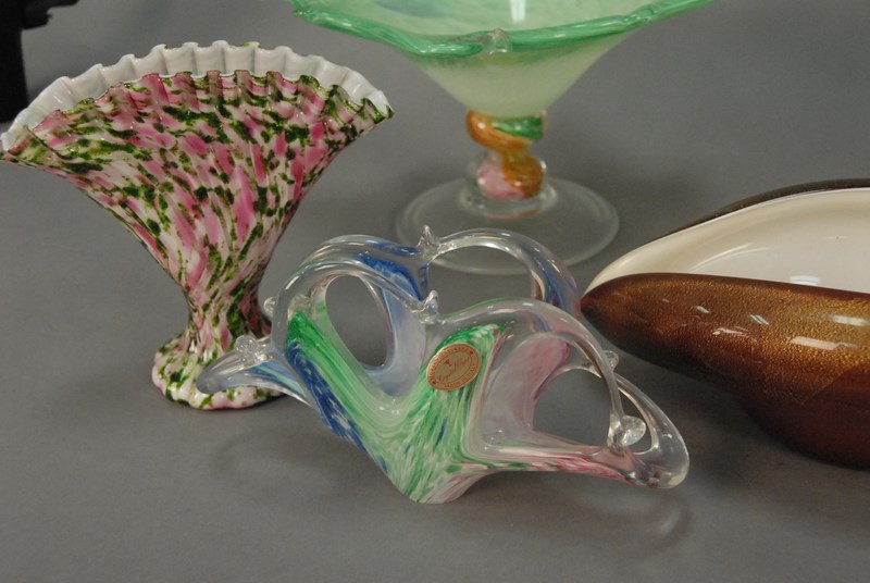 Lot 281: Group of six pieces of art glass and Murano glass to include pair of large compotes and four baskets.