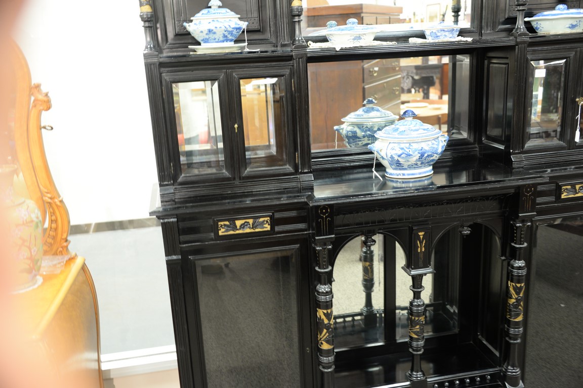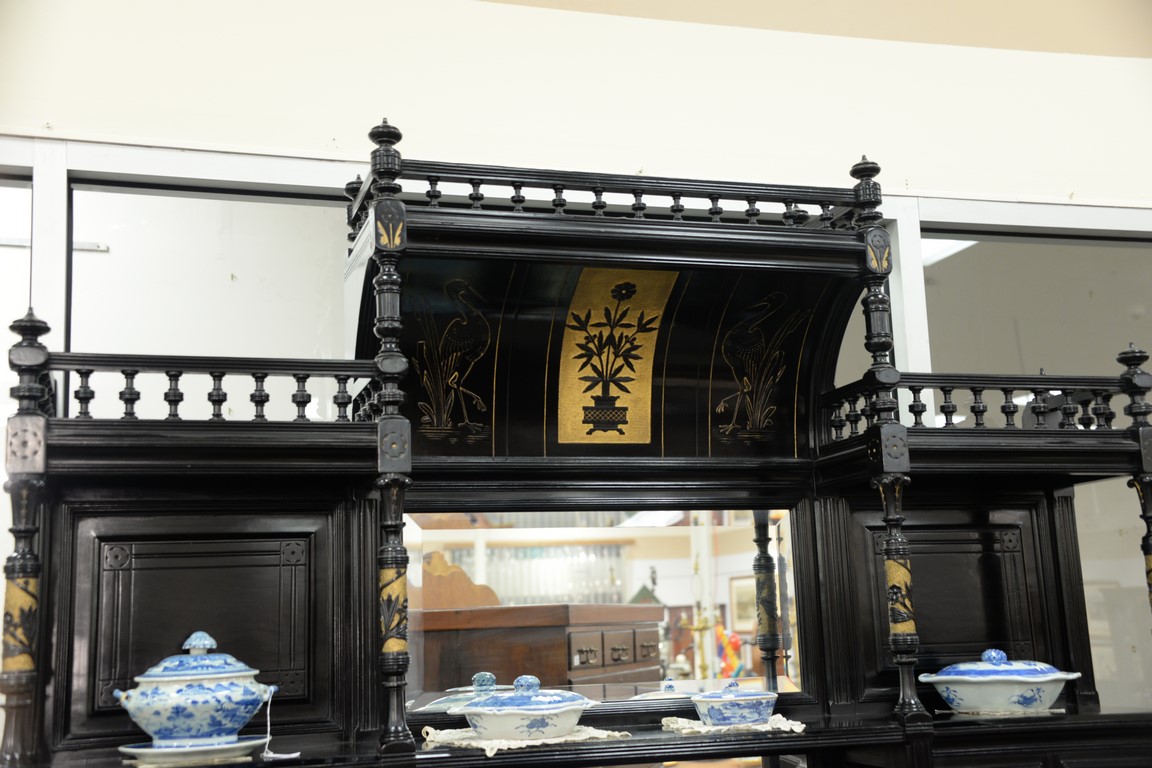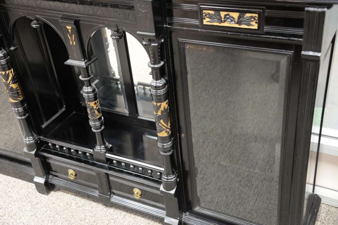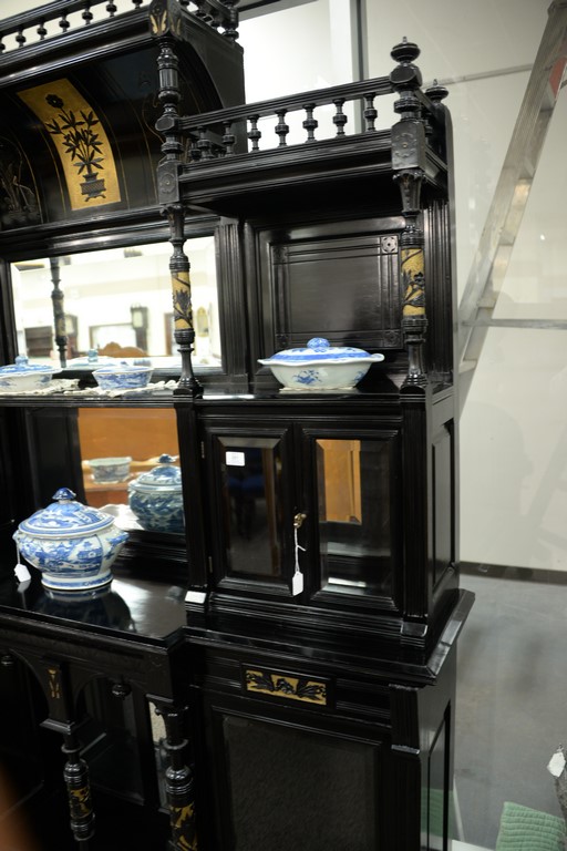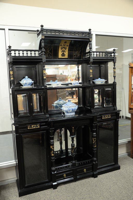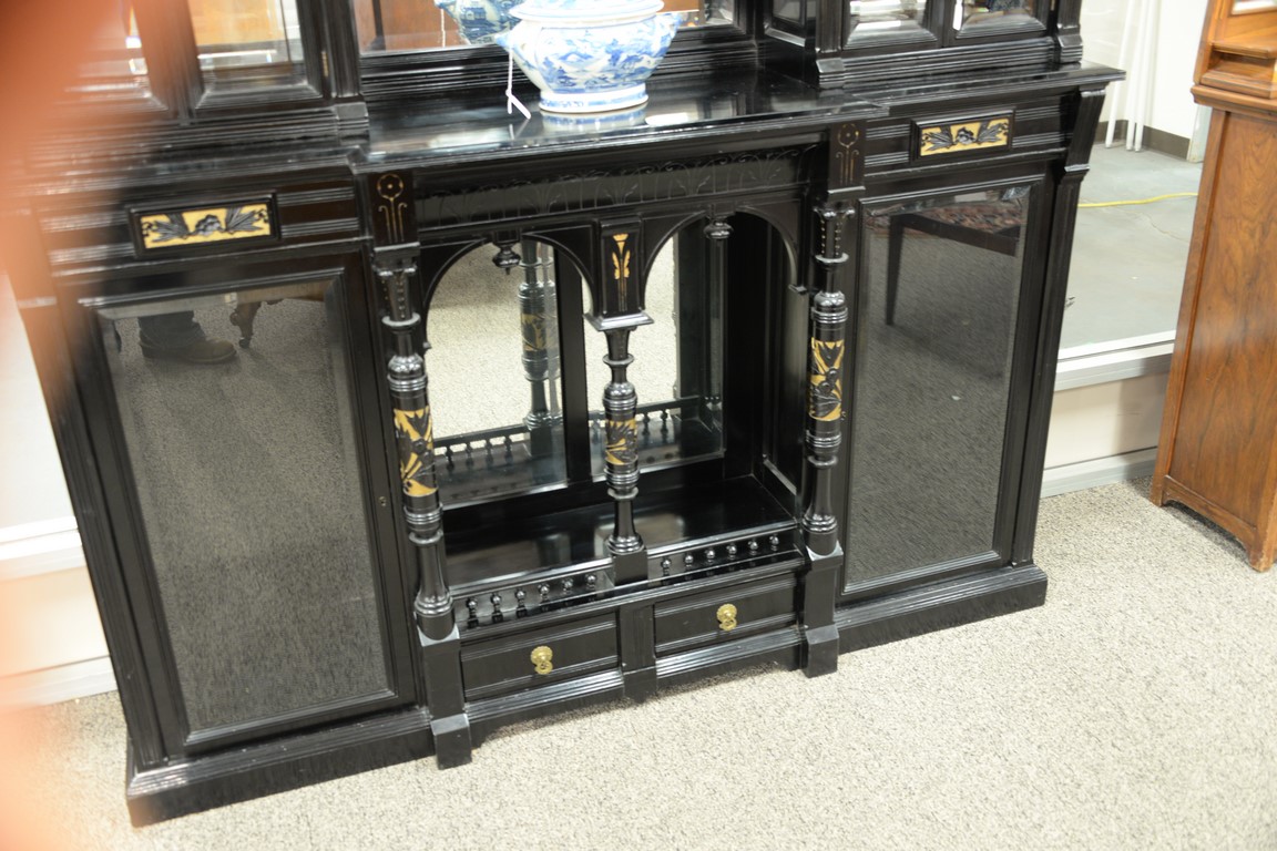 Lot 281: Kimbel & Cabus ebonized etagere with incised storks, gallery shelves, and drawers, all doors with beveled glass. height 94 1/2 in…