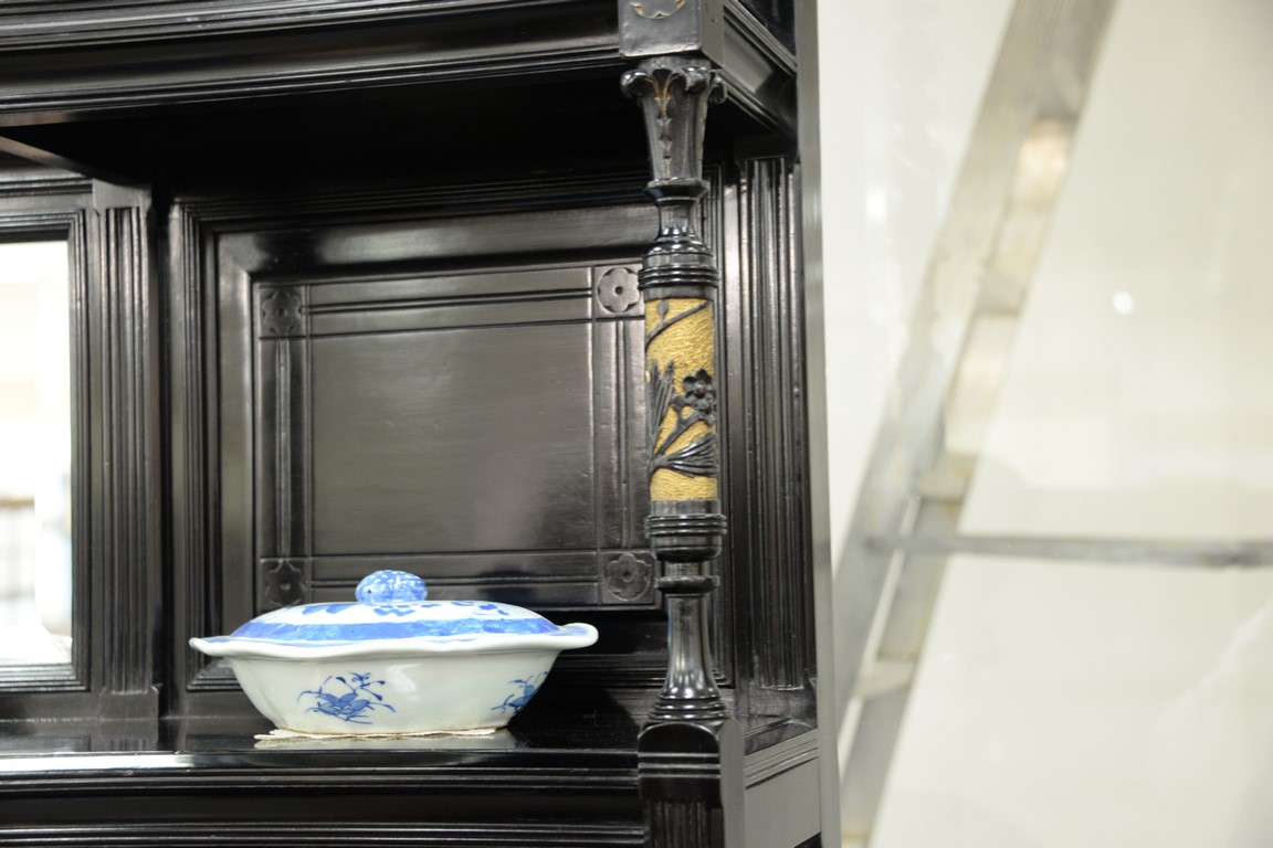 Kimbel & Cabus ebonized etagere with incised storks, gallery shelves, and drawers, all doors with beveled glass. height 94 1/2 inches, width 70 1/2 inches, depth 15 inches Provenance: Estate of Dr. Steve Leder