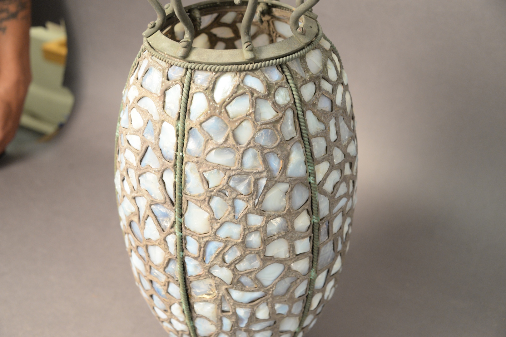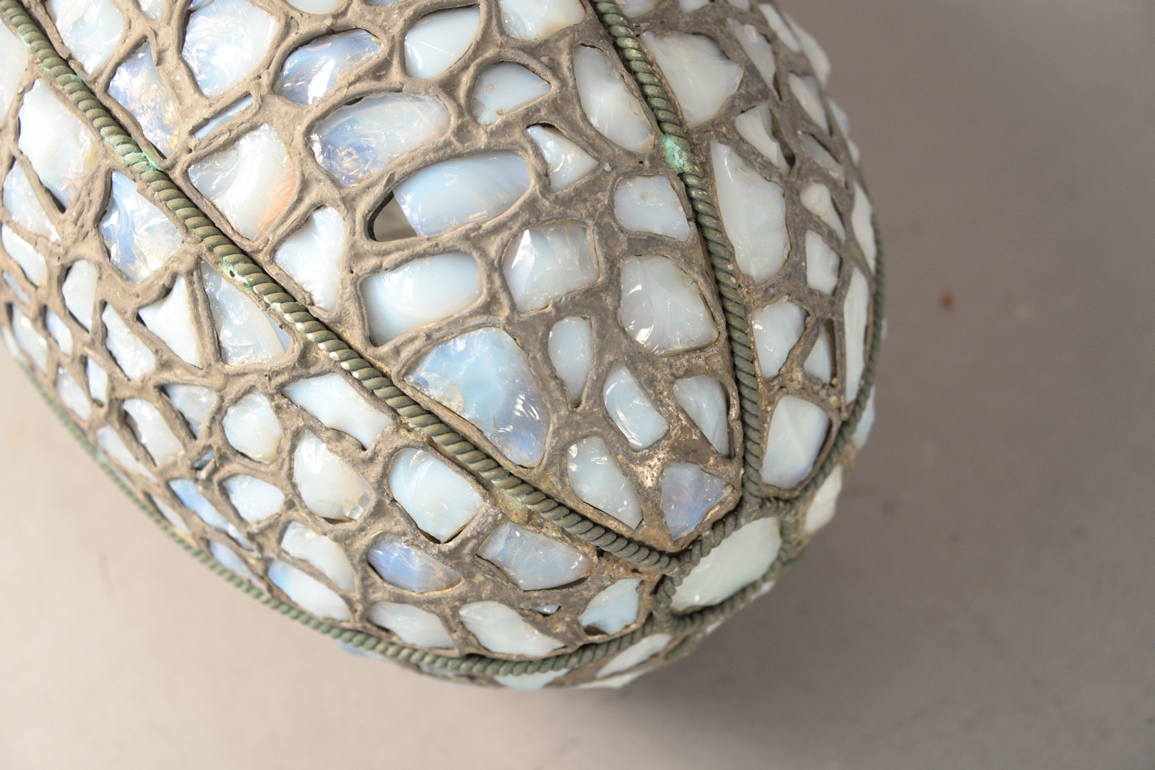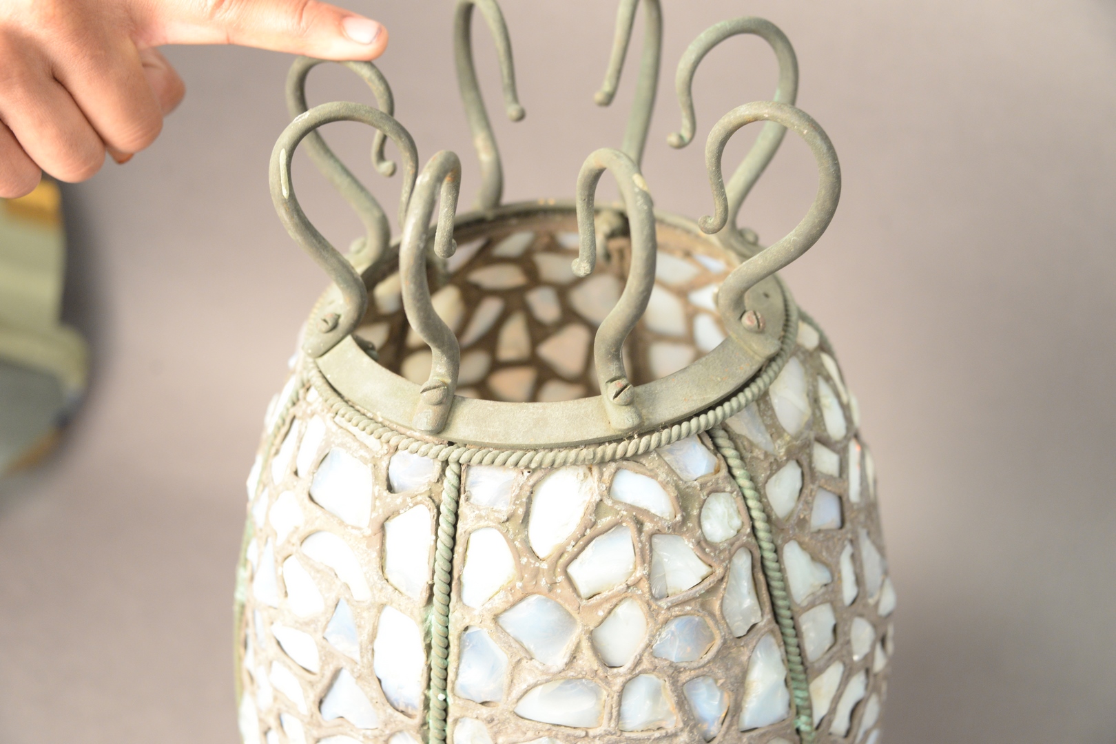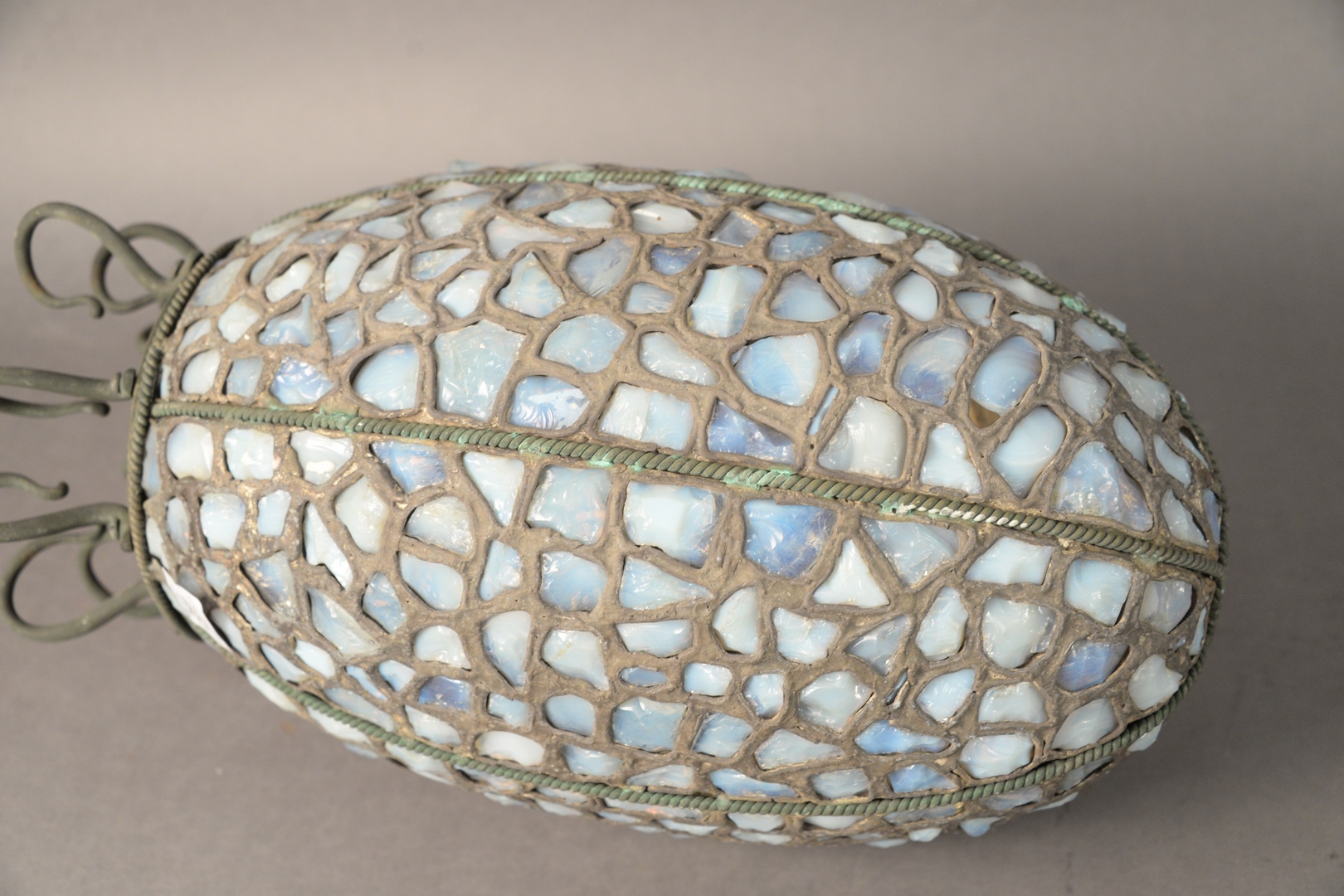 Leaded Glass and Bronze Lantern having egg form with jeweled glass, possibly Tiffany and Company, height 20 inches, width 8 inches.