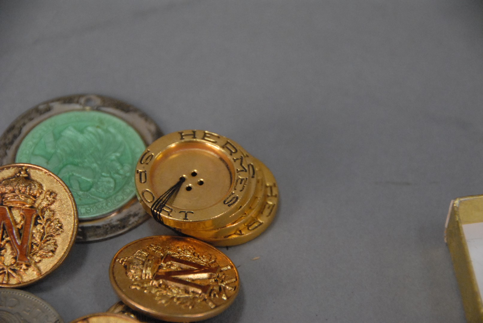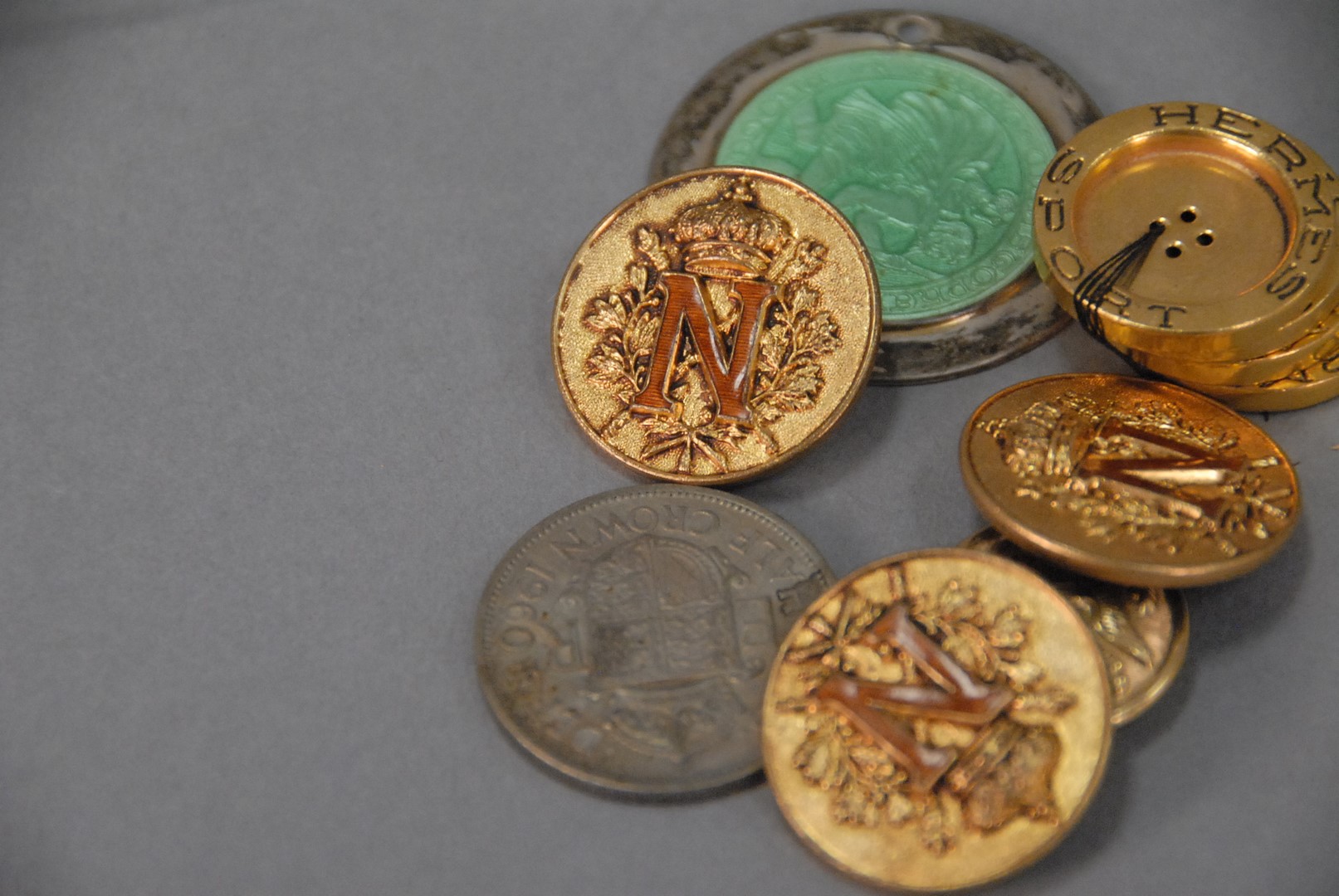 Lot 281: Lot with four Hermes buttons, three buttons have crown and enameled N. plus enameled silver medals.