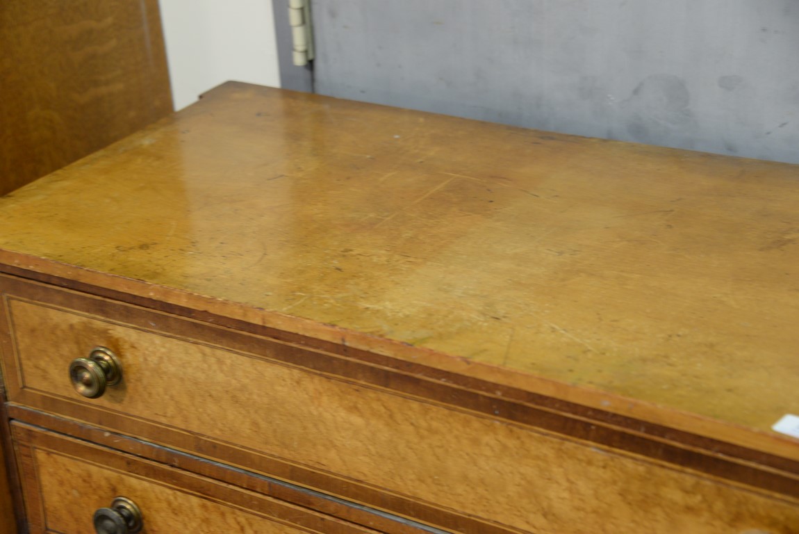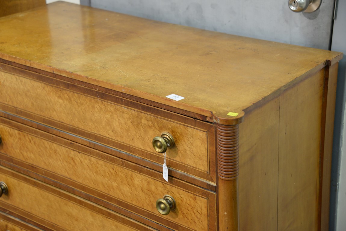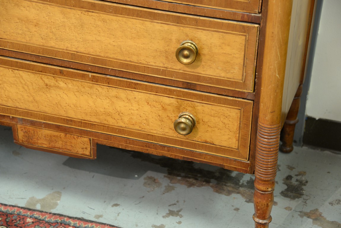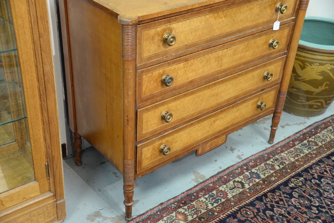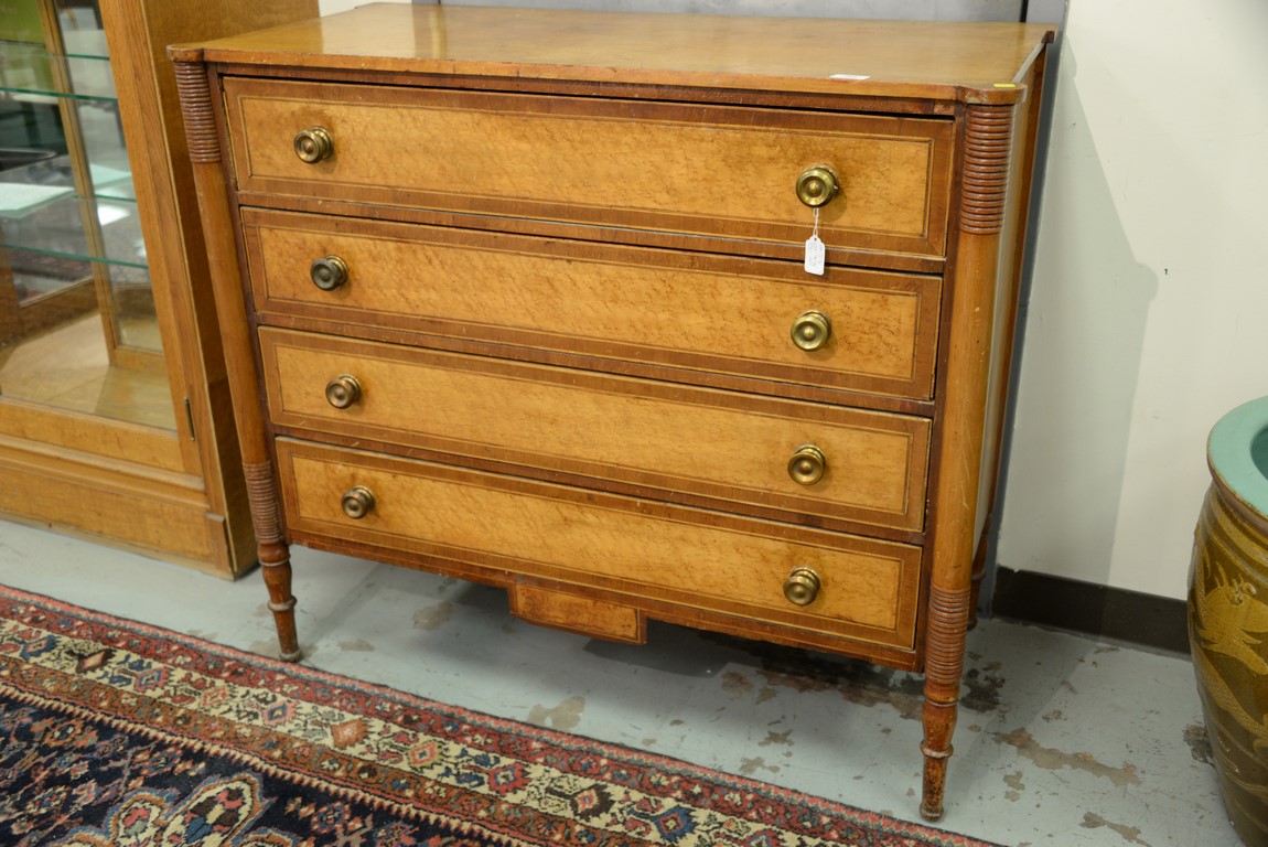 Lot 281: Sheraton chest of four drawers having cookie corners, curly maple drawer fronts with mahogany and lightwood surrounds, all on turned legs and with rectangular drop in center, probably New Hampshire circa 1820-1830. ht. 37 1/4 in. wd. 40 1/4 i