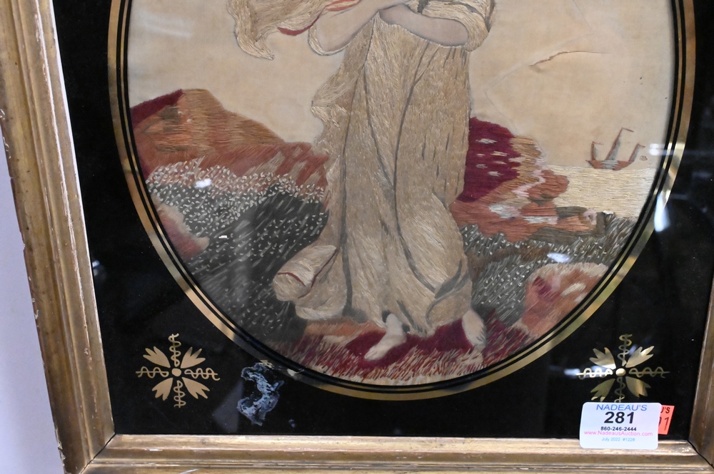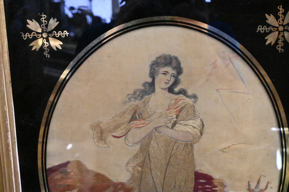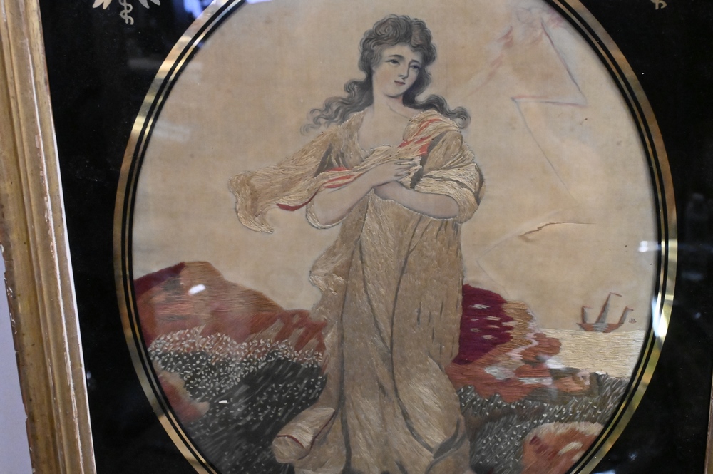 Silk Needlepoint, depicting a captain’s widow, having painted bust, 9″x11″.