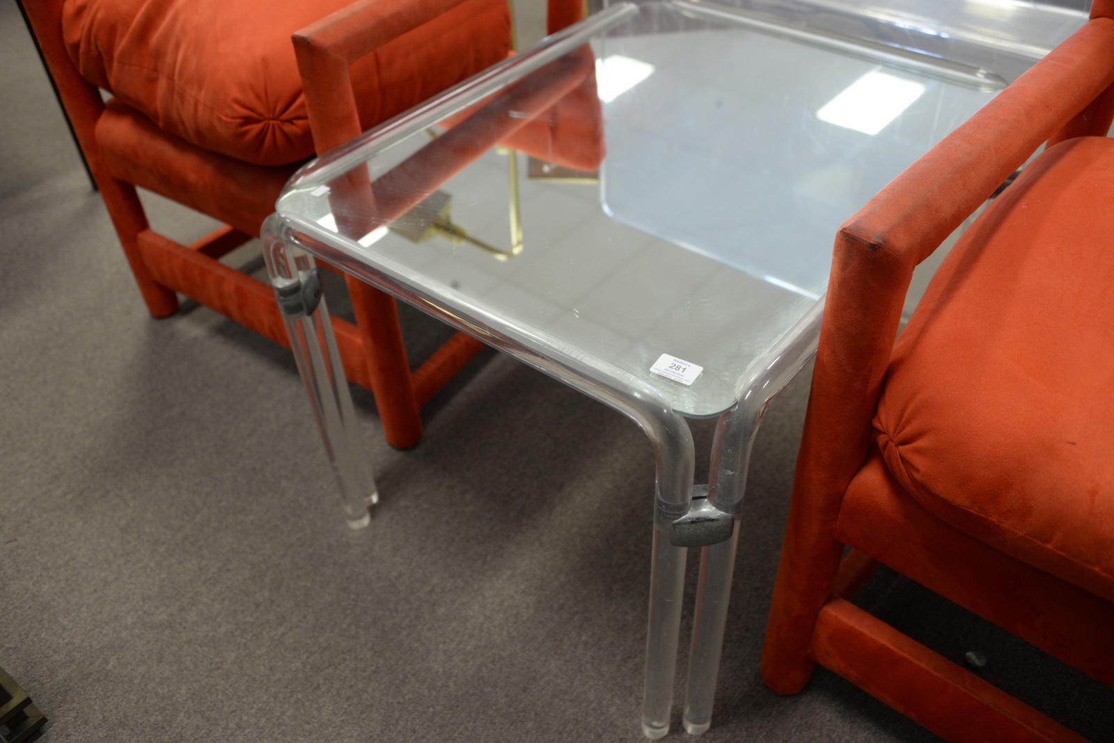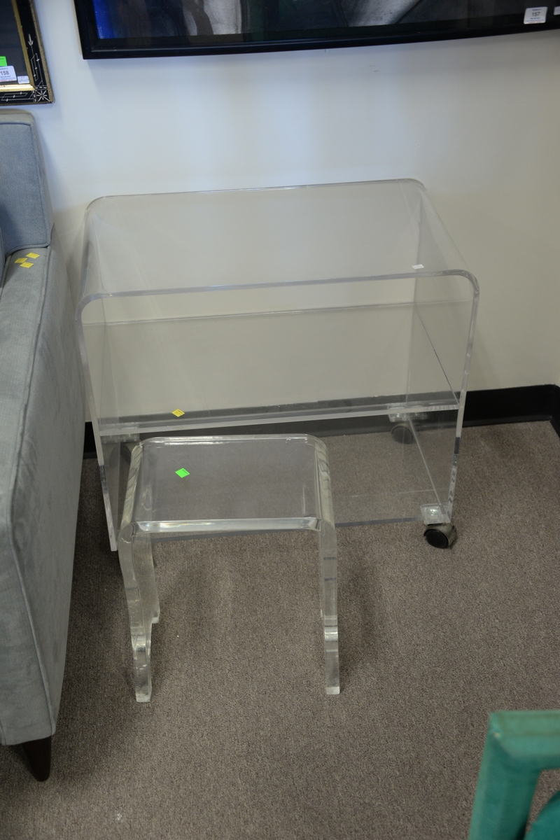 Lot 281: Six piece lucite/plexiglass group to include drying rack, two 3 tier stands, pedestal, stool, and mirror topped table.