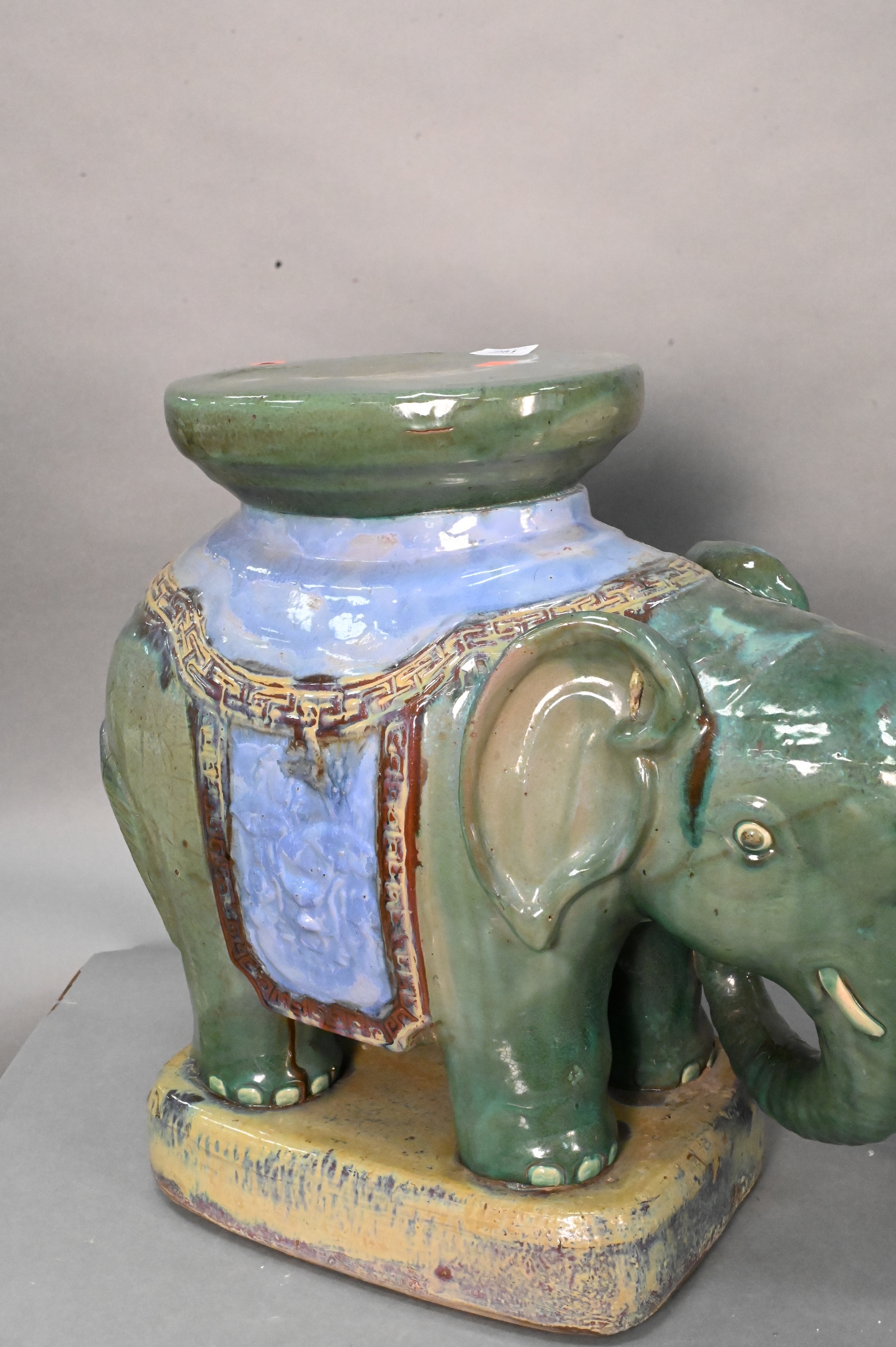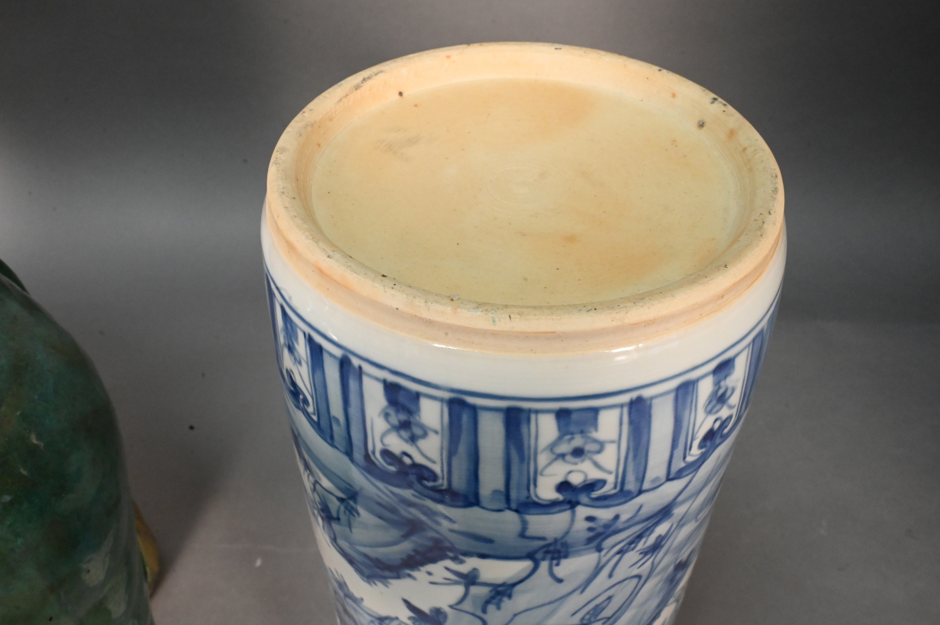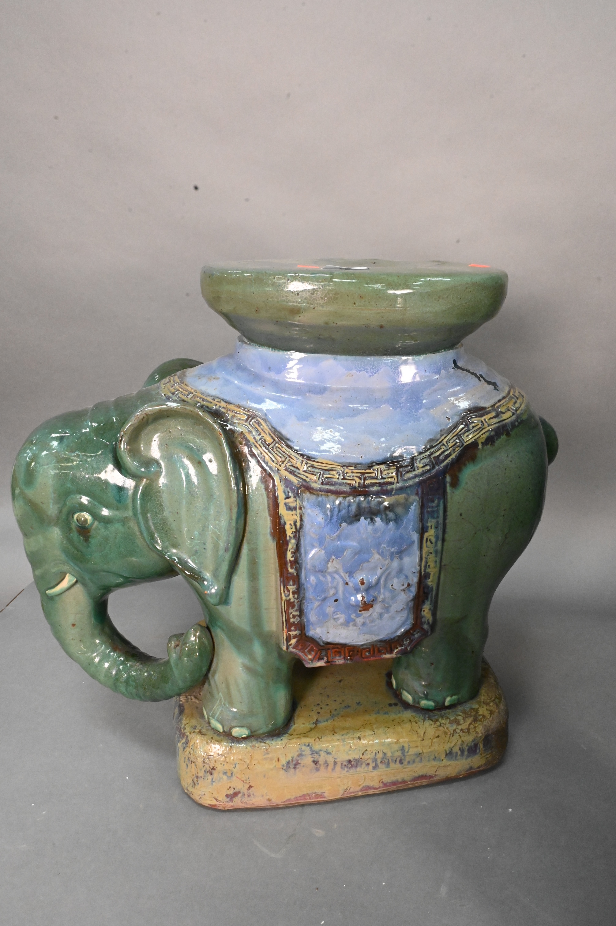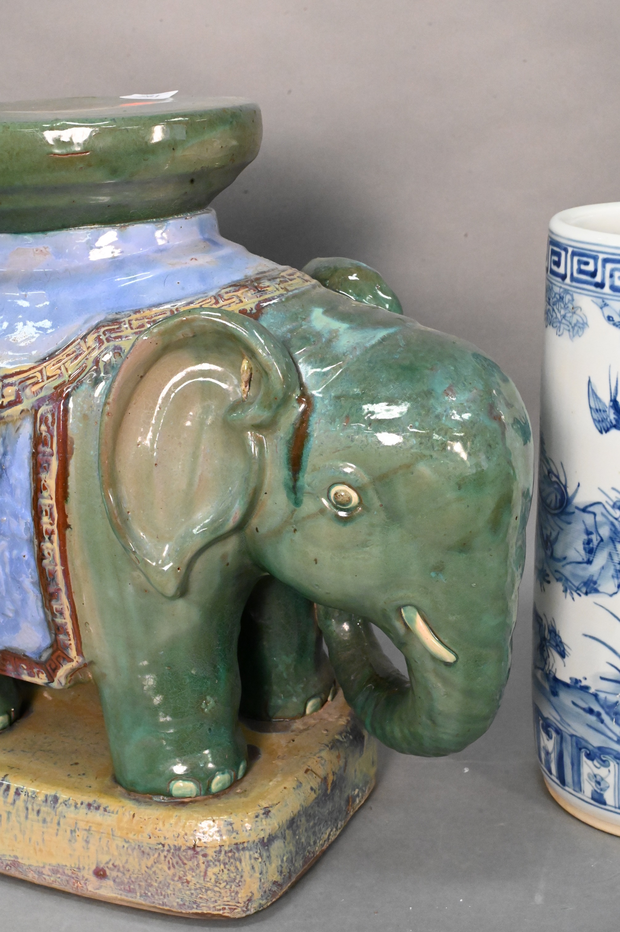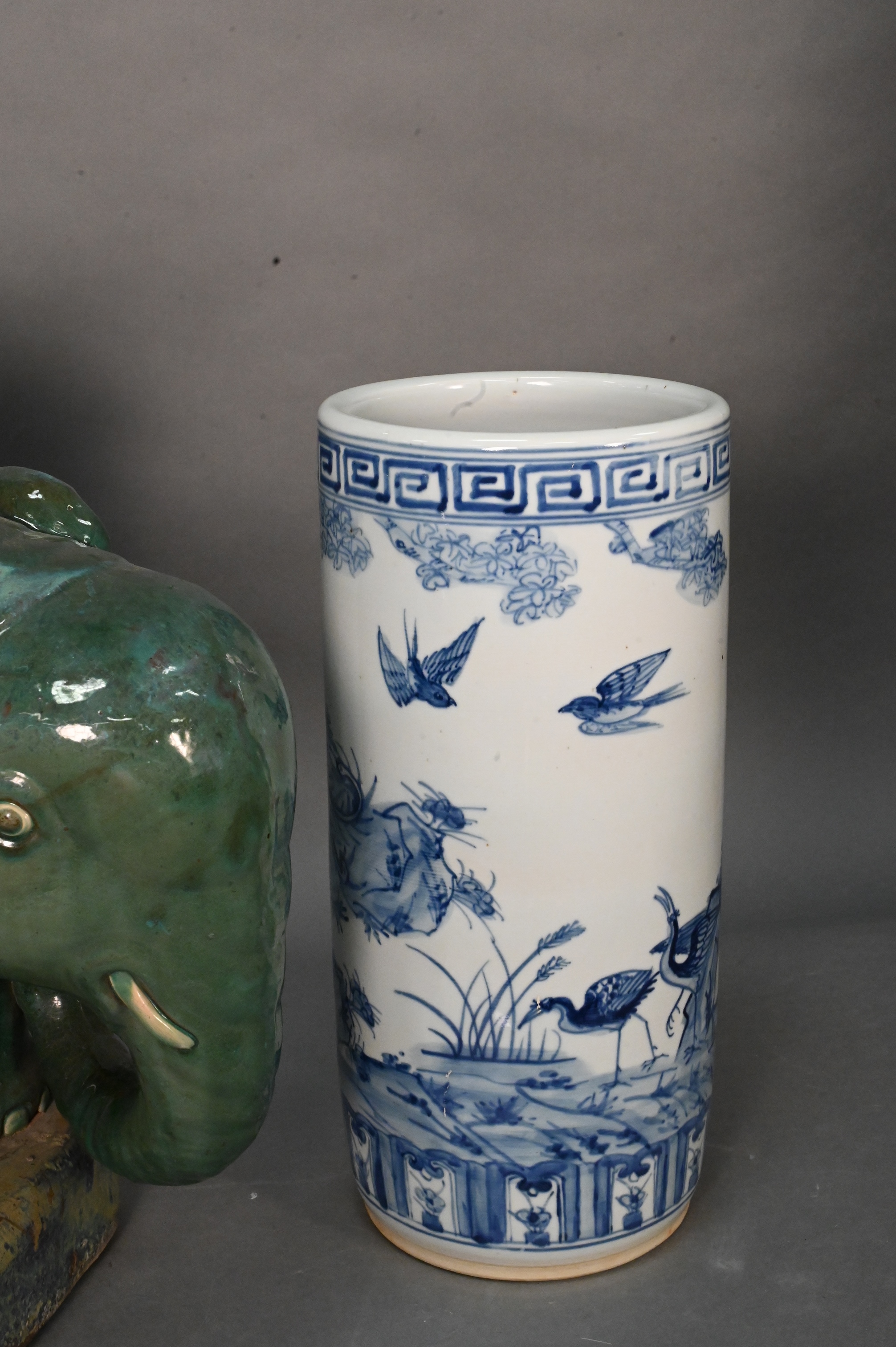 Two Piece Group, to include a Chinese blue and white porcelain umbrella stand, along with an earthenware elephant garden set, height 21 1/2 inches.