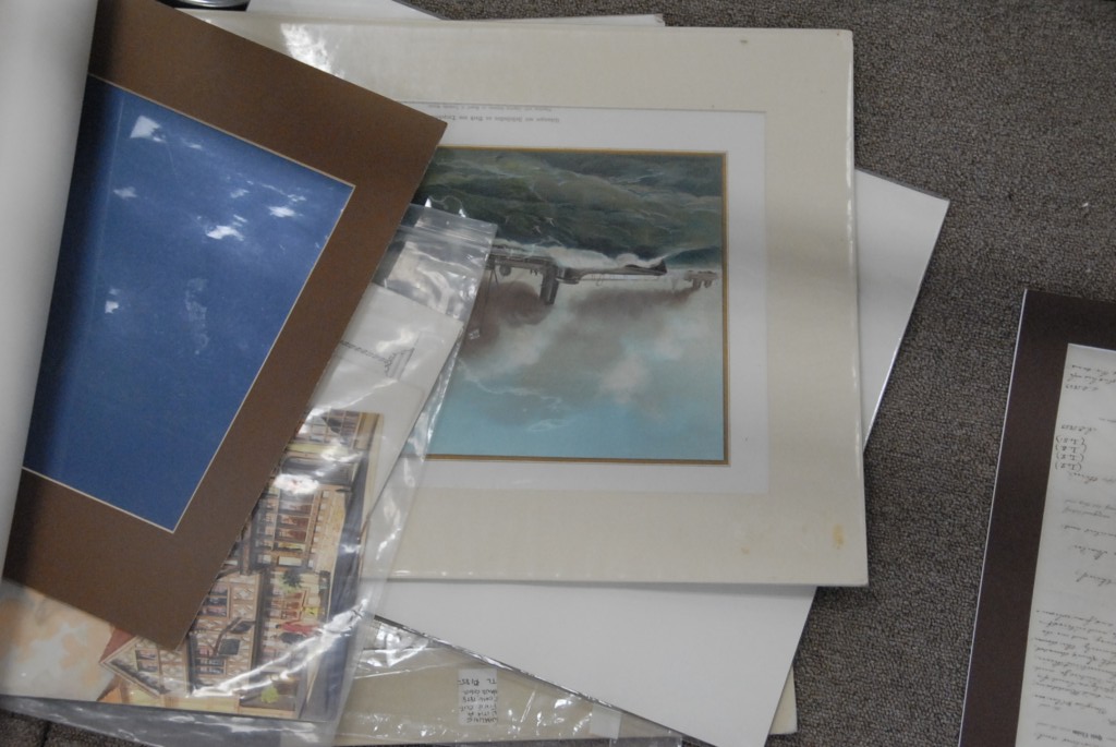 Box of books and several matted pieces to include prints and Connecticut Magazine leather bound editions