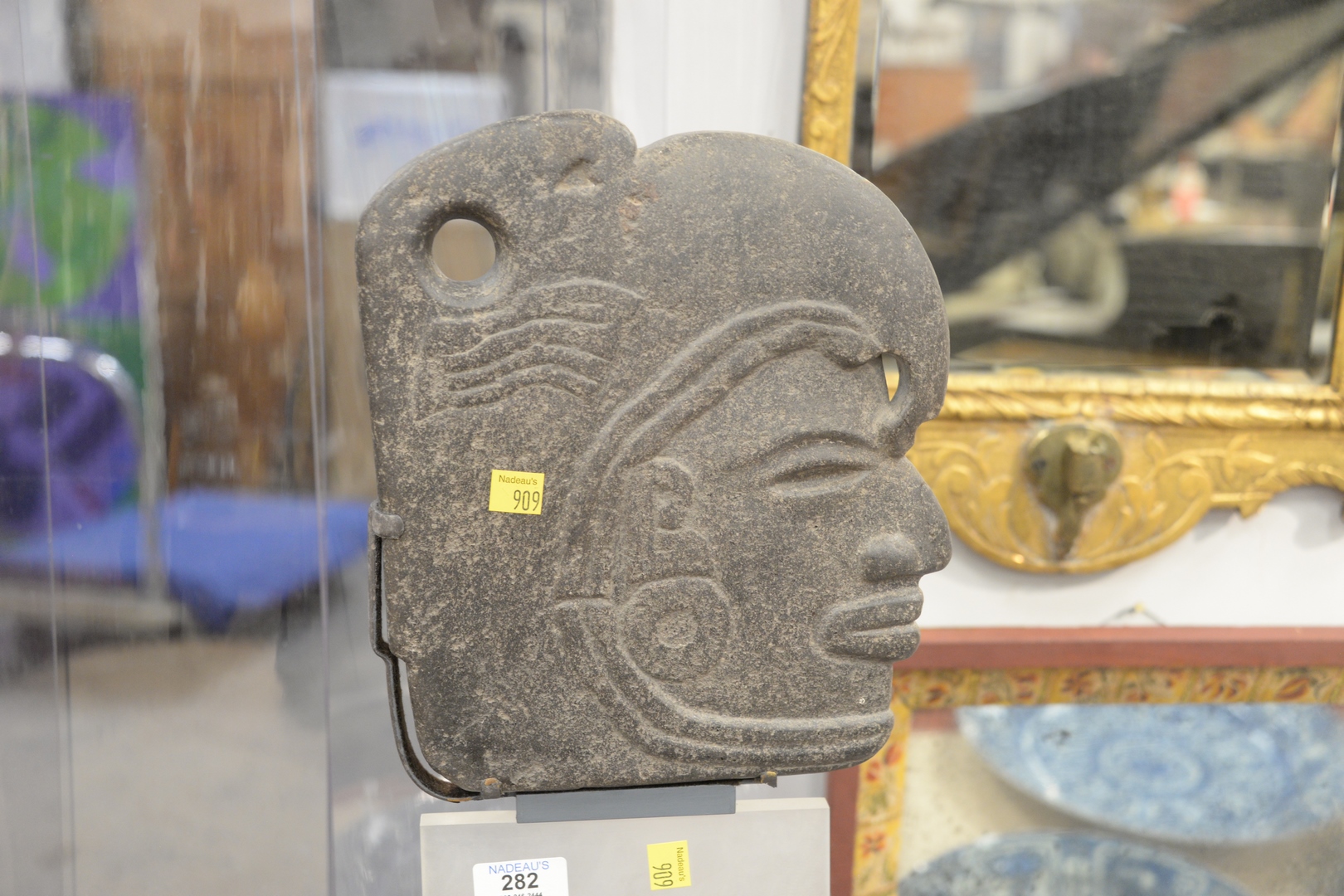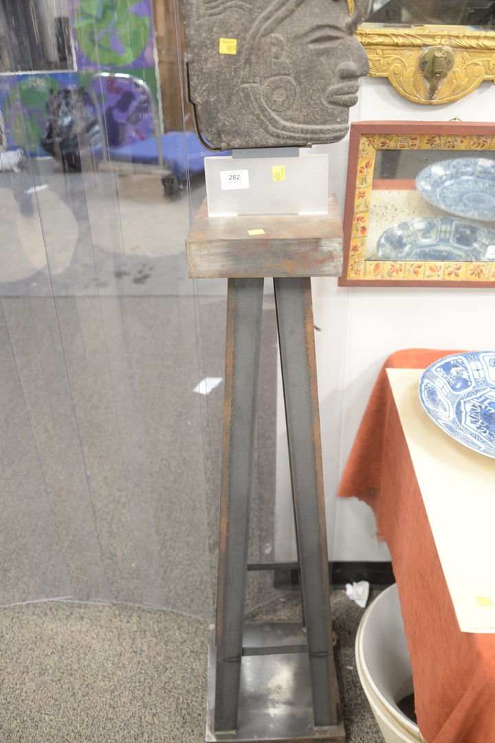 Lot 282: Carved Stone Bust of A Deity wearing a headdress in Egyptian taste mounted on pedestal stand, face height 10 1/2 inches, total height 59 inches.