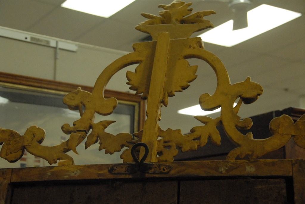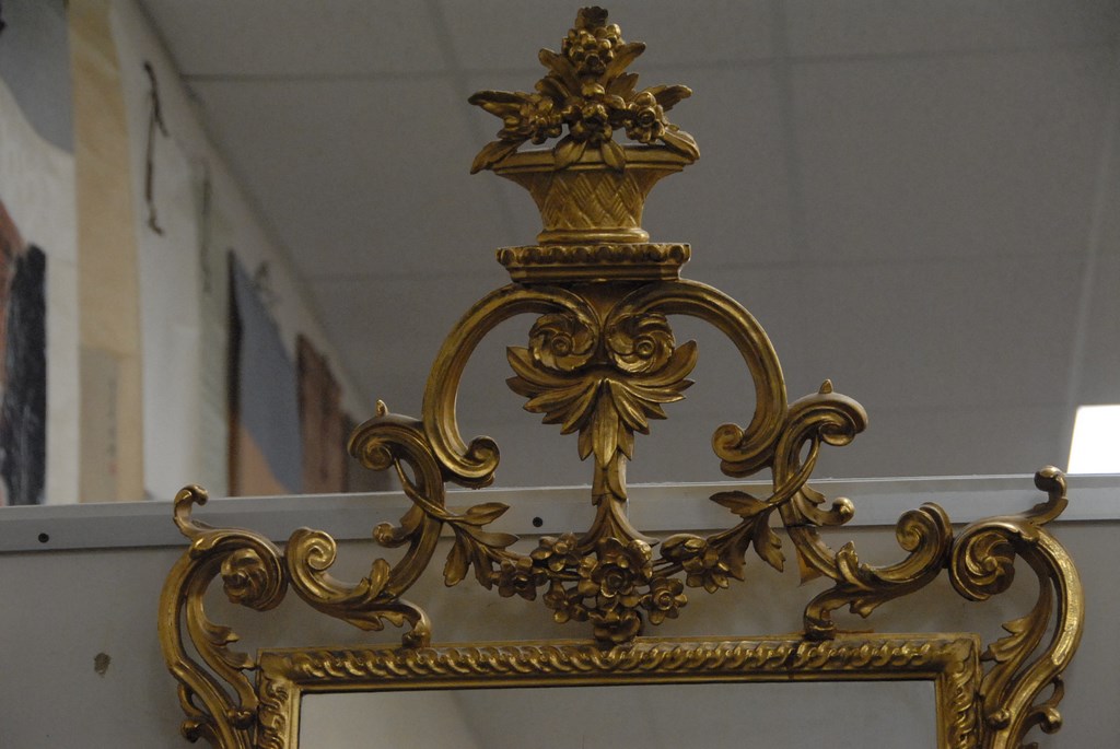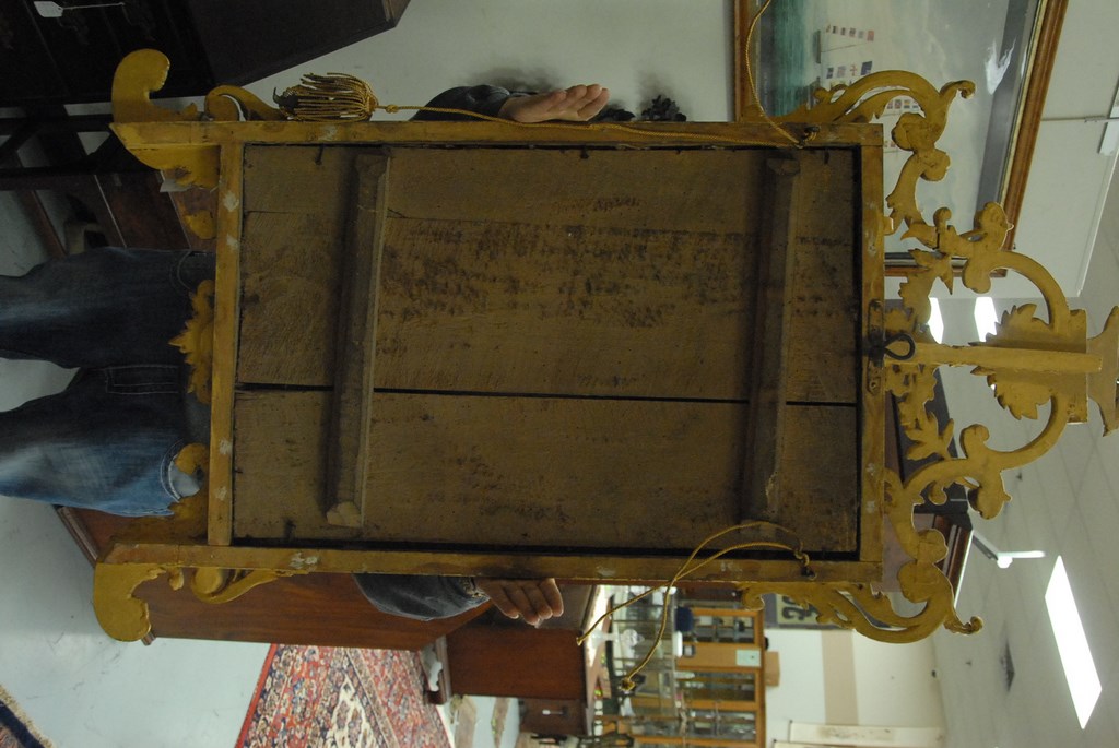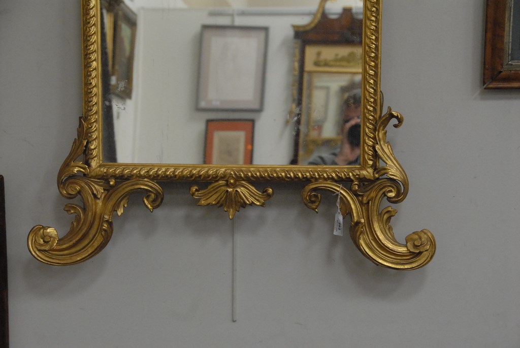 Lot 282: Chippendale Continental mirror with original gilt, basket of flowers top on openwork scrolls, rectangular mirror, and scrolled legs,…