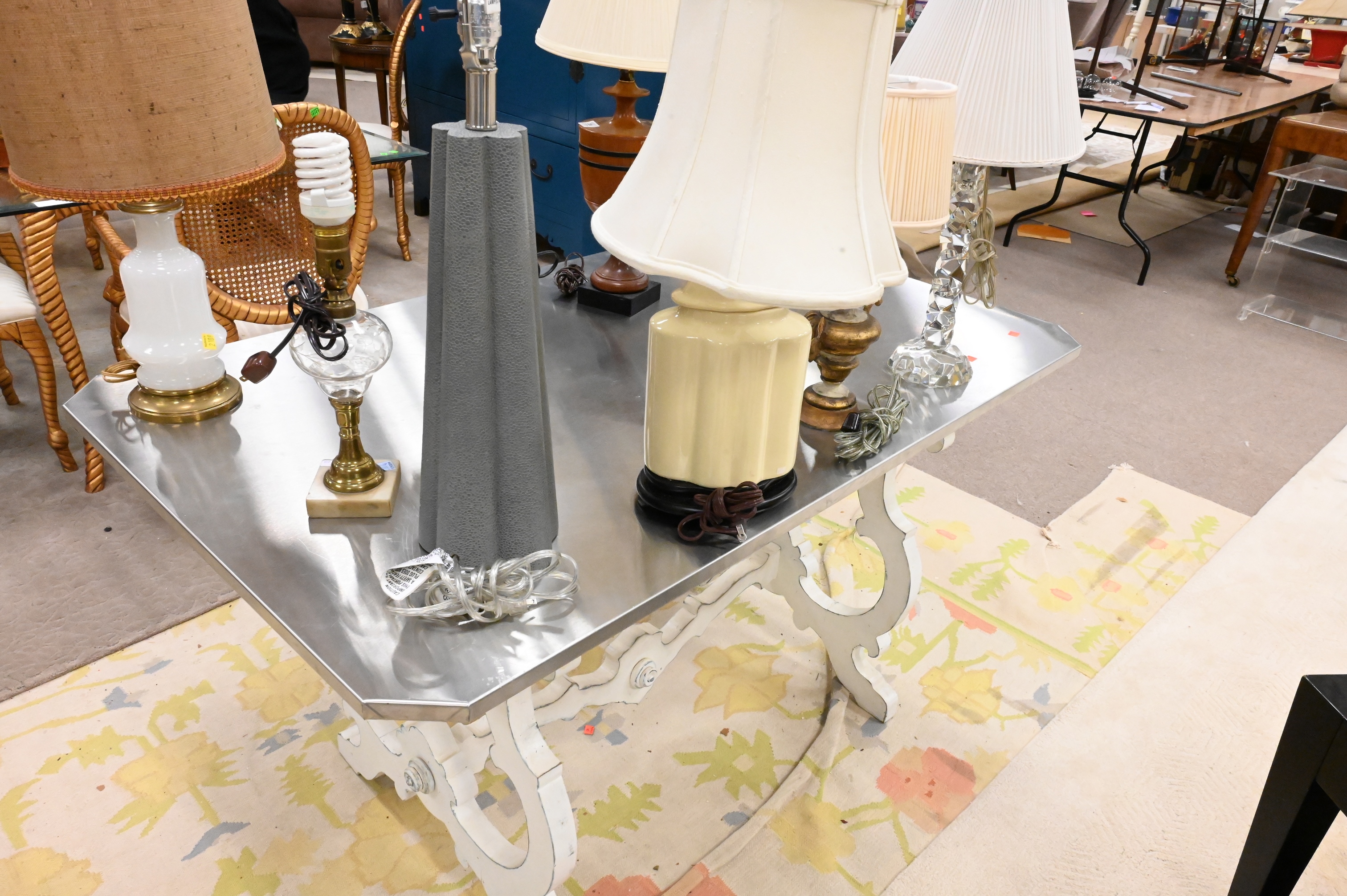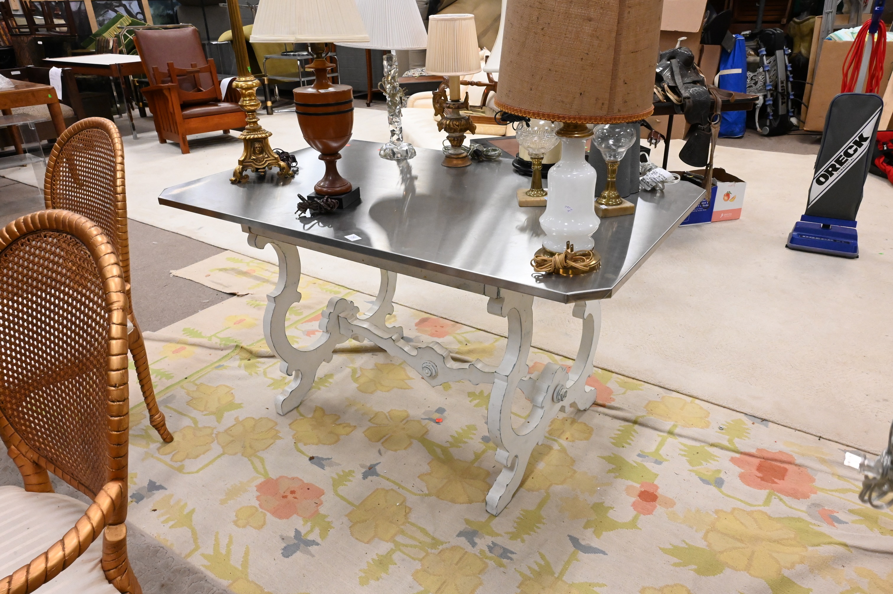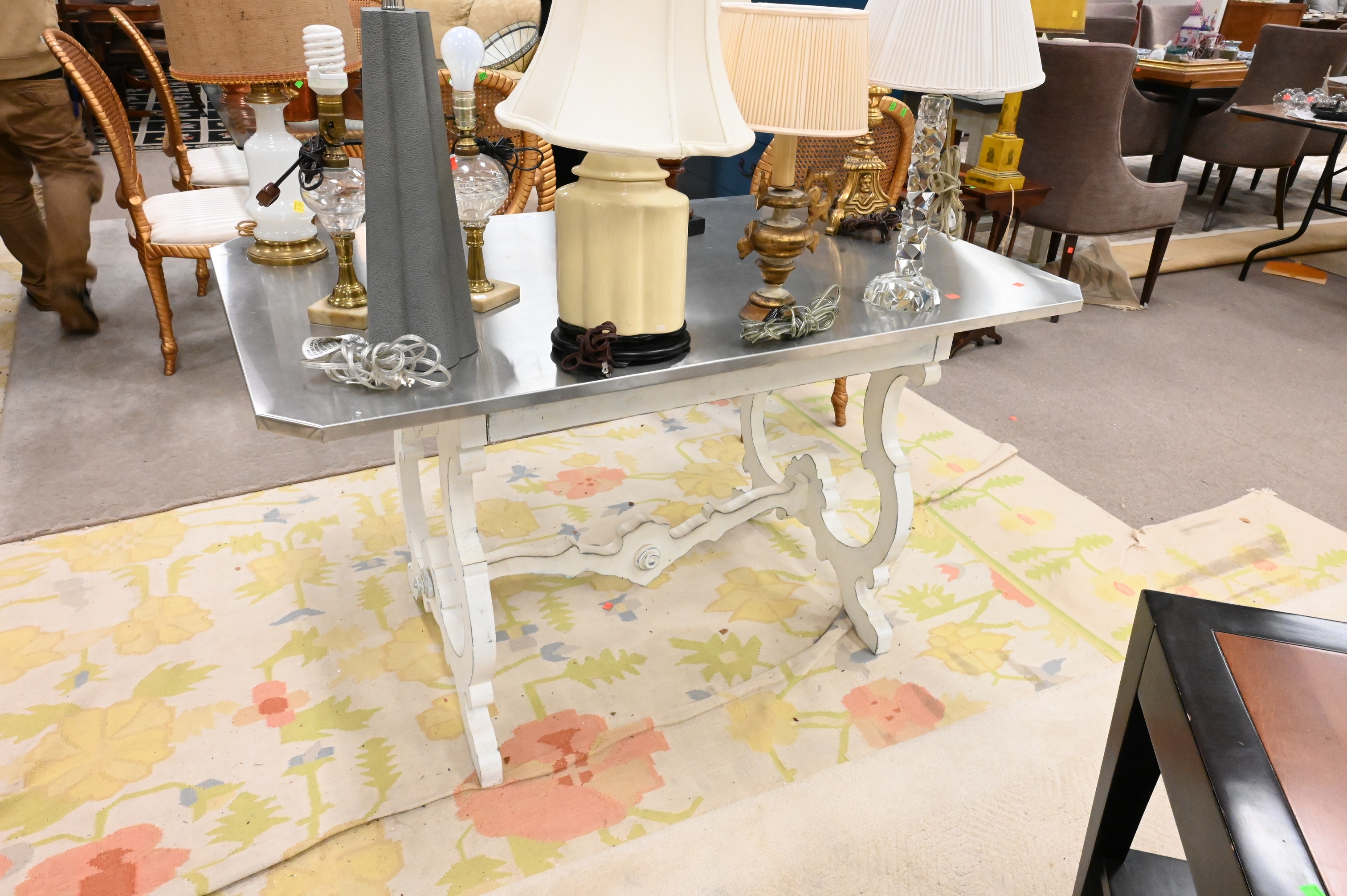 having scrolled wooden painted base with x stretcher