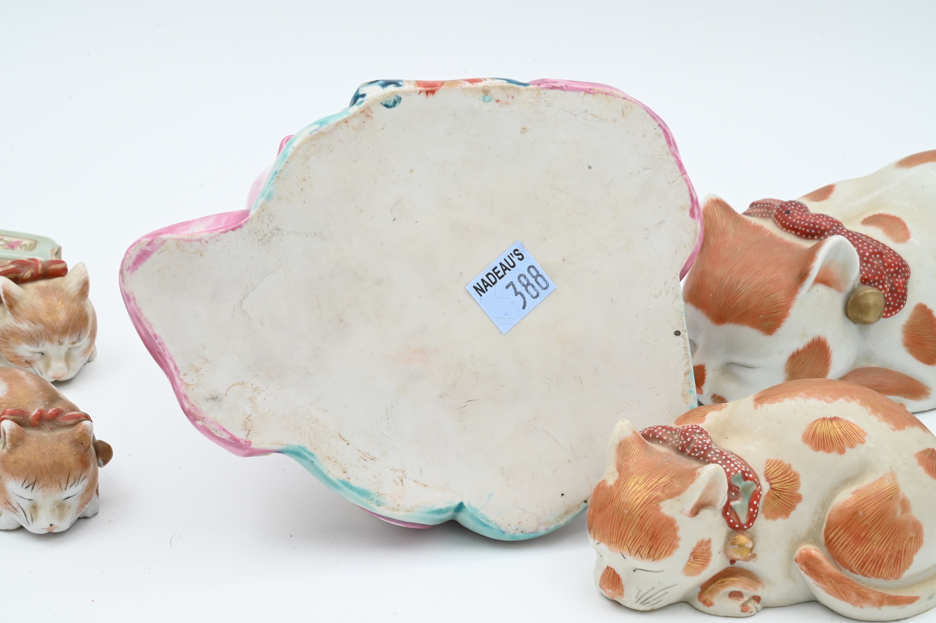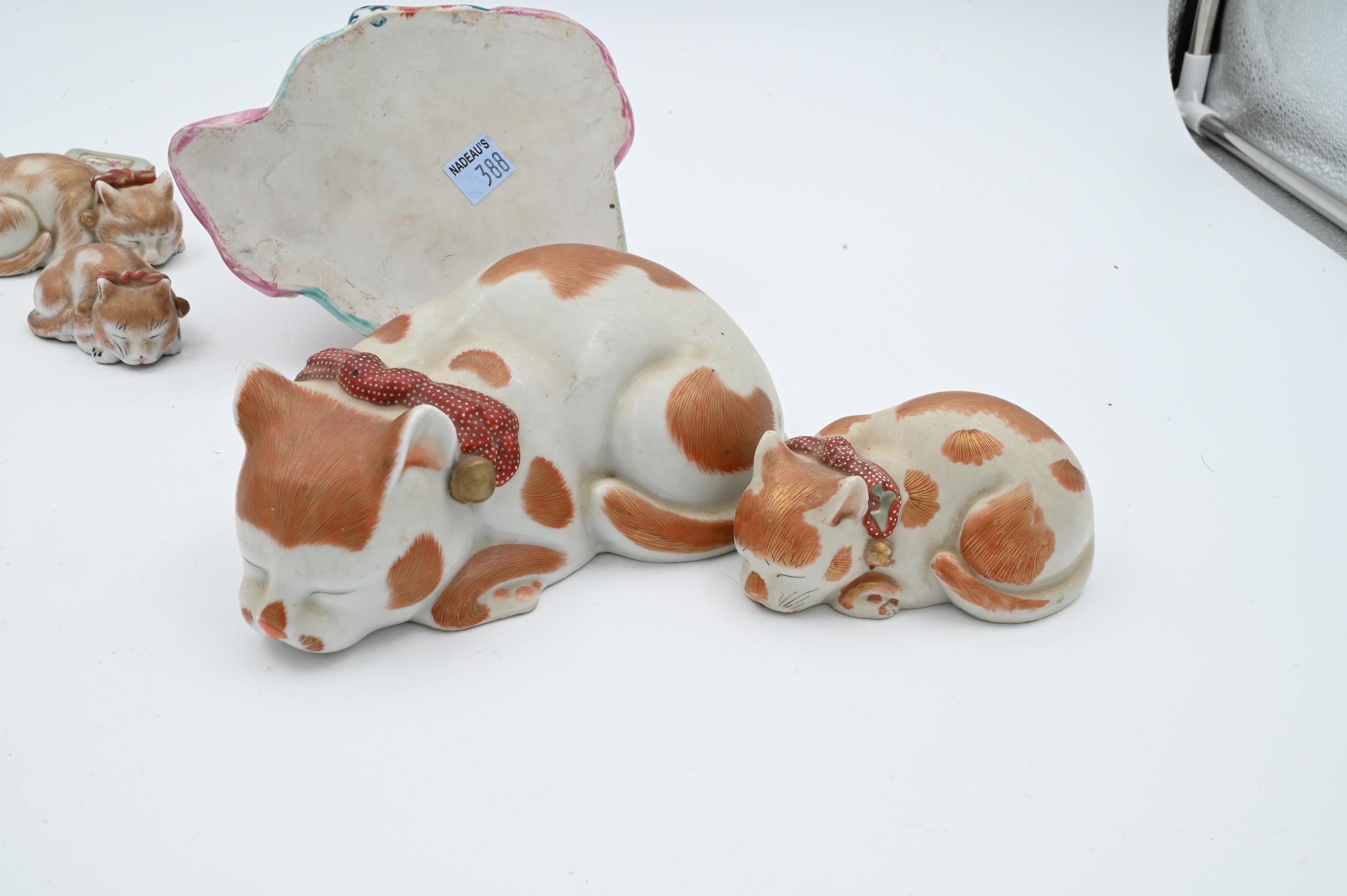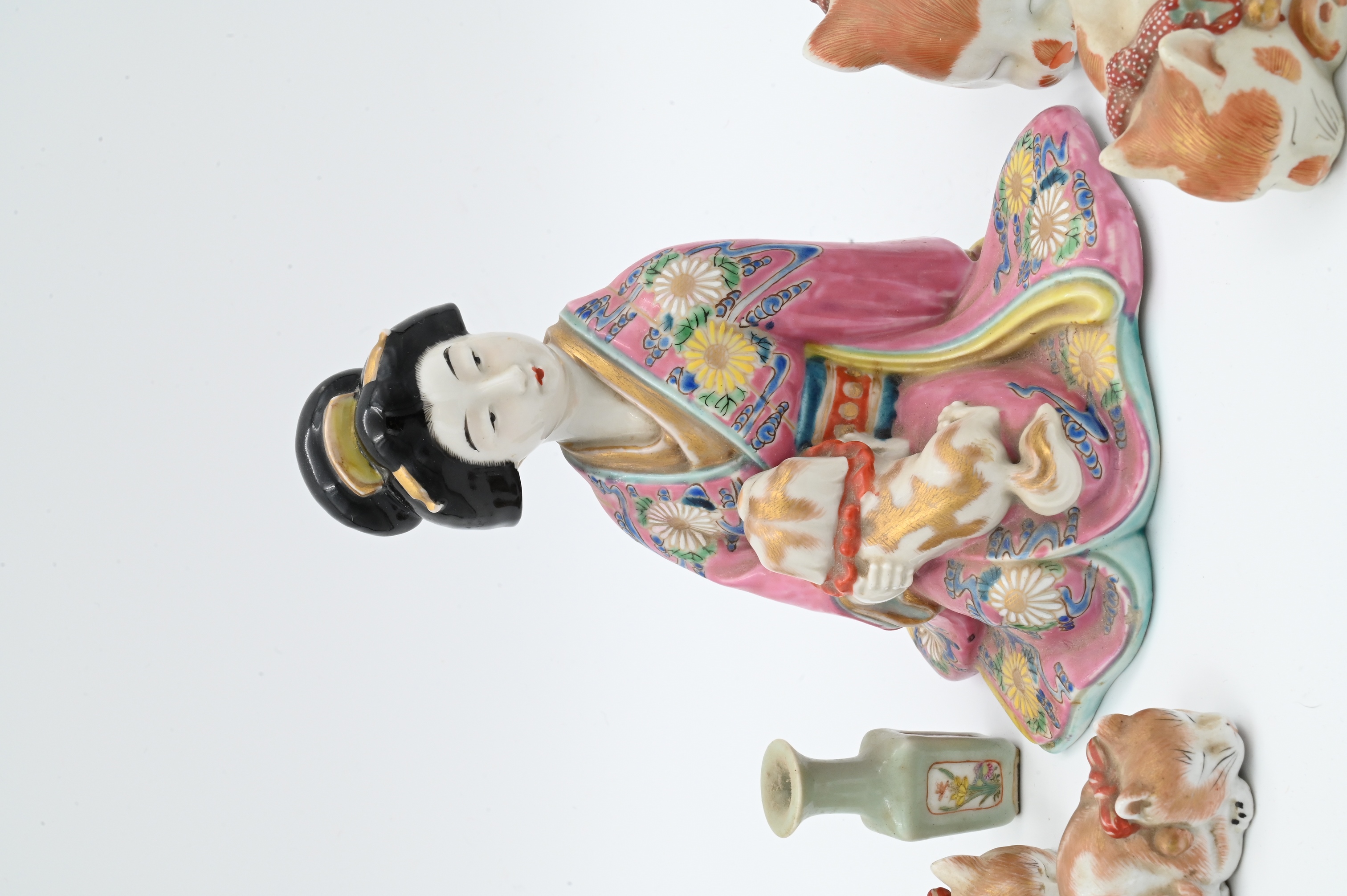 to include set of four graduated Kutani porcelain sleeping cats, Geisha holding a dog, and two small cabinet vases