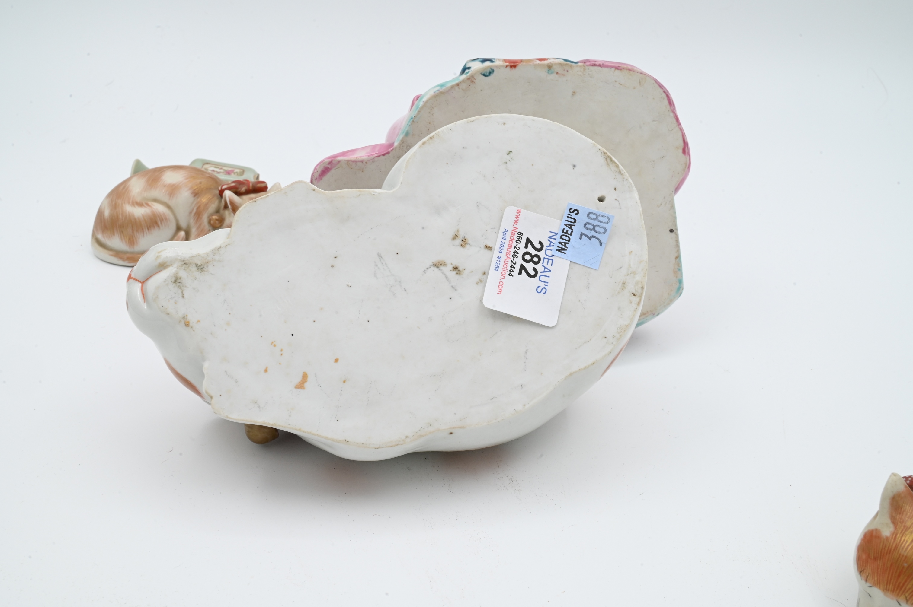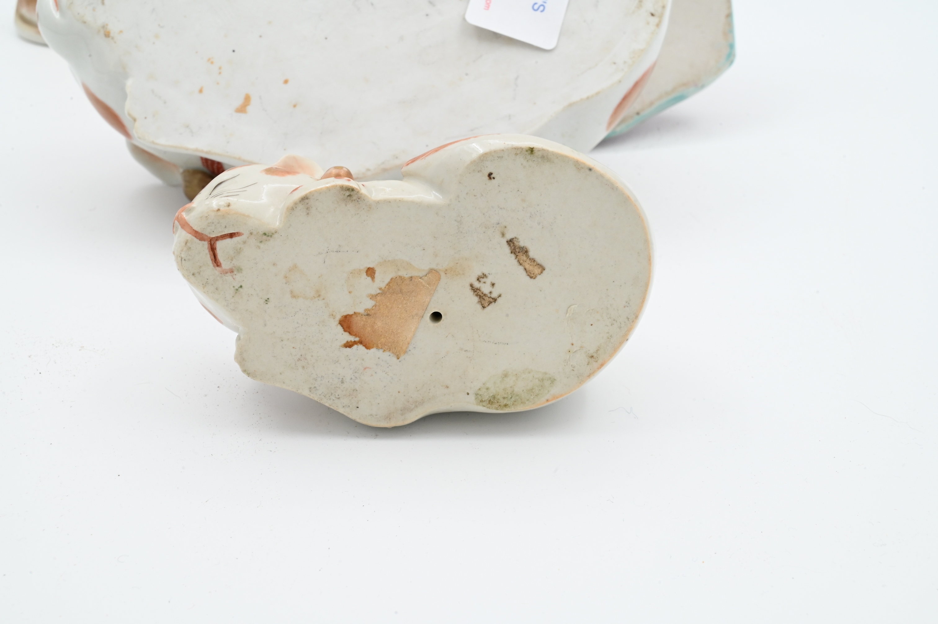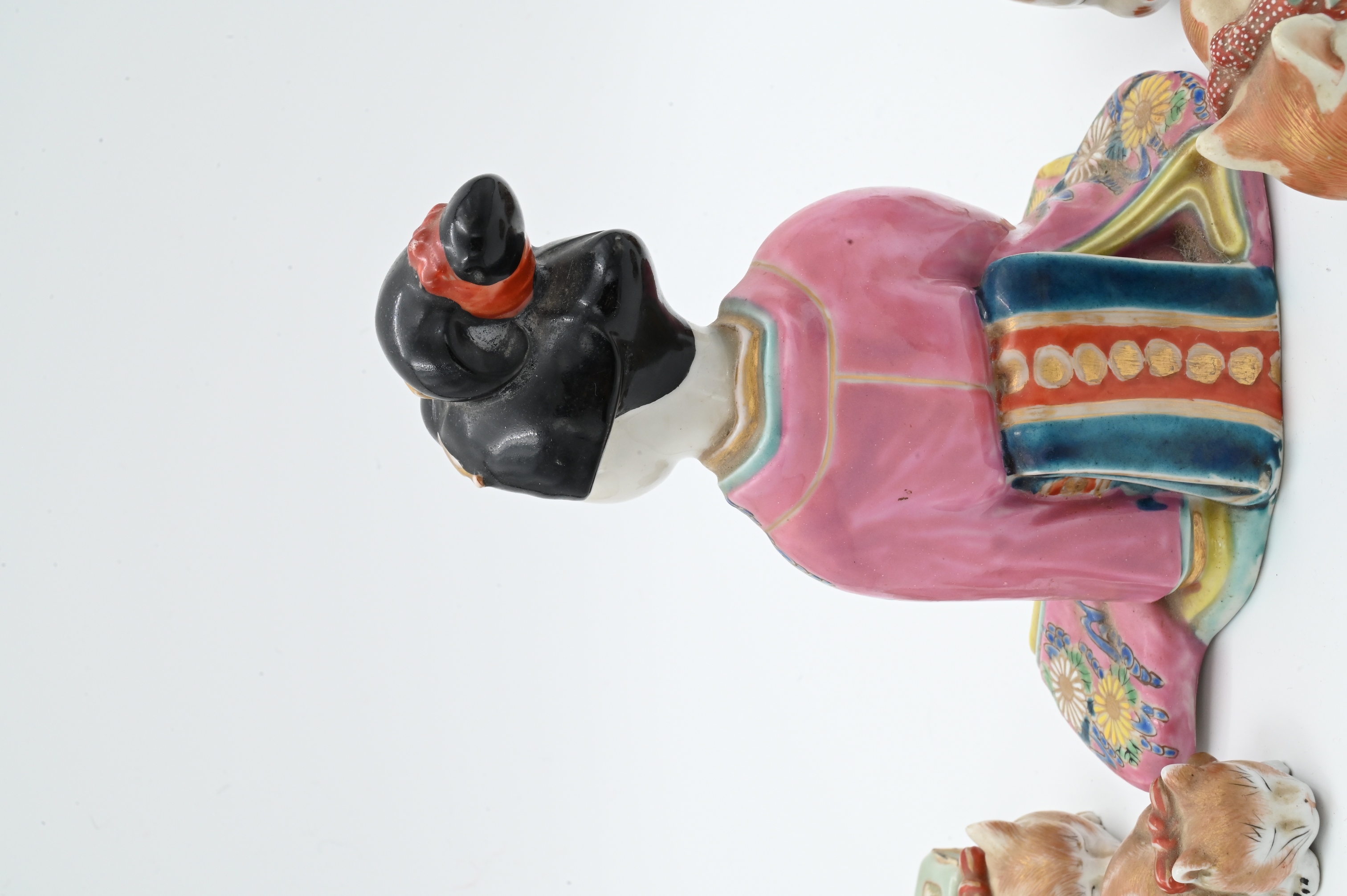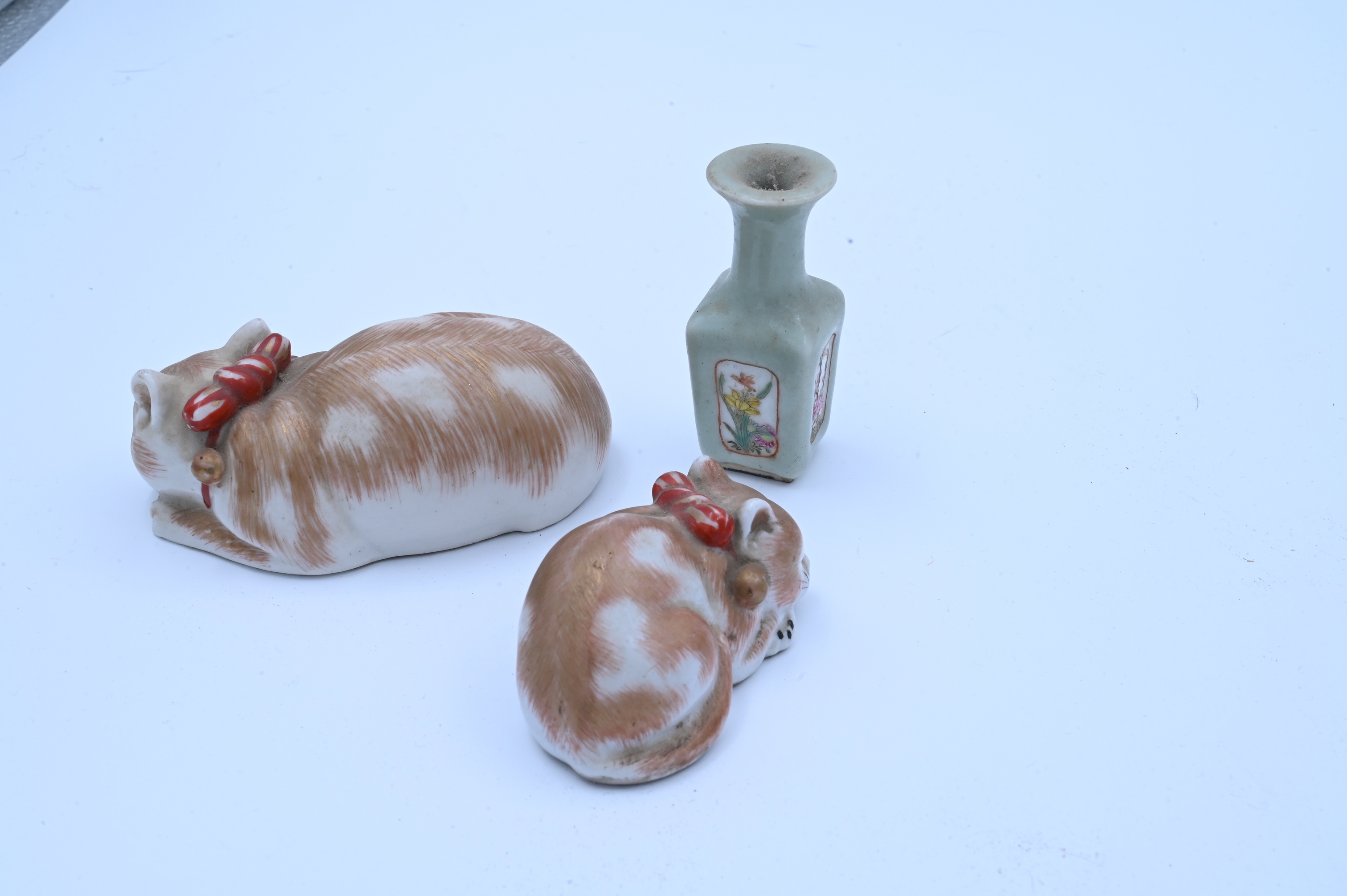 to include set of four graduated Kutani porcelain sleeping cats, Geisha holding a dog, and two small cabinet vases