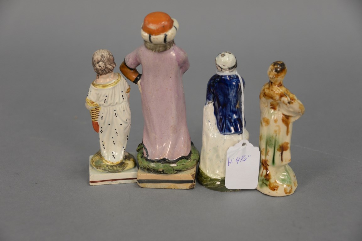 Four Staffordshire classical figures to include one pearlware or creamware of a girl holding a bird, a gentleman with a blue coat on, a sponge painted small figure of a girl and a taller figure of a man with a coat on with a square base as is, hts. 4 1/2-5 1/2.